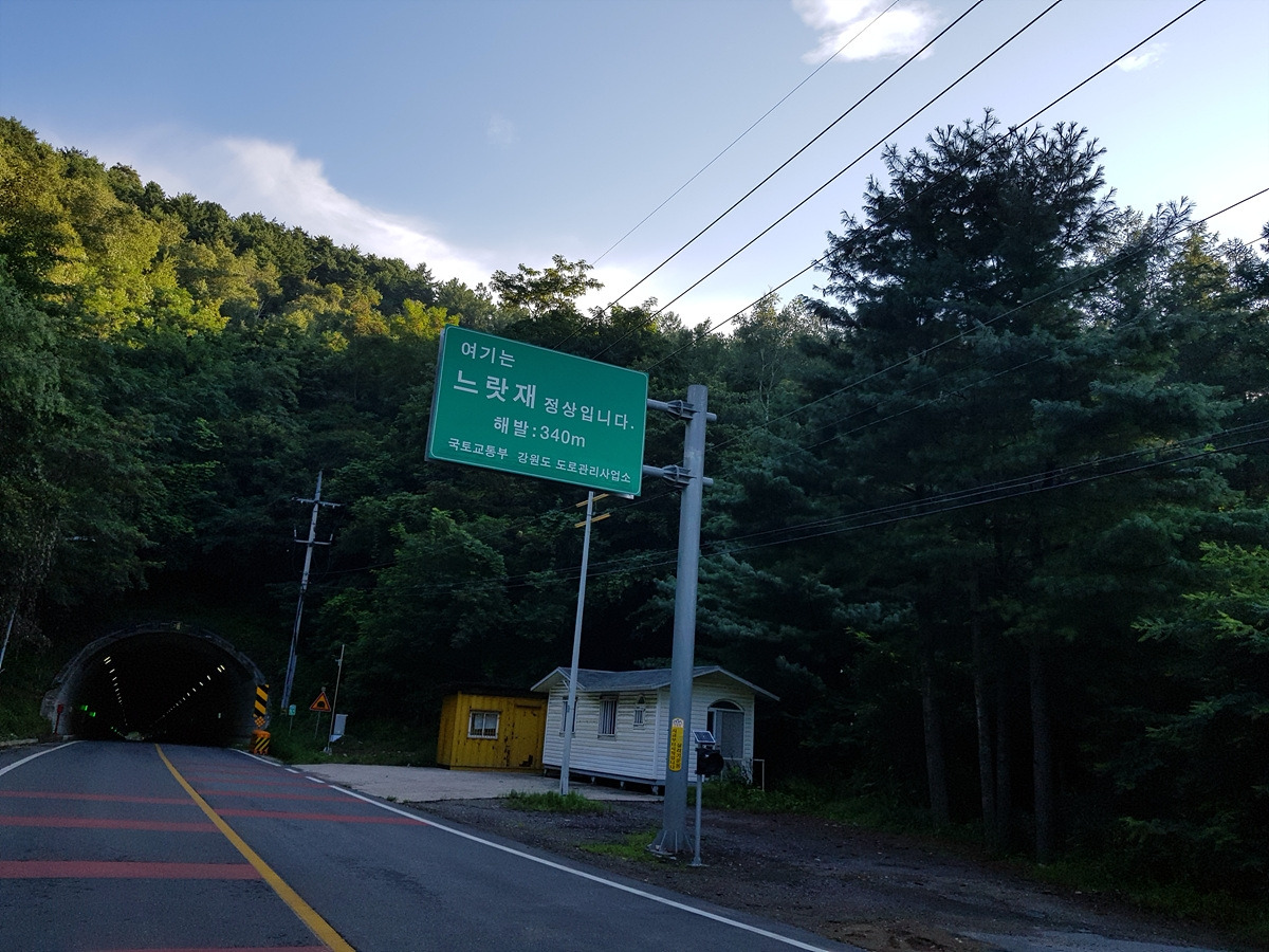 느랏재 터널은 춘천 방향에서는 살짝 오르막이다. 터널을 통과하면 해발 340미터의 느랏재 정상 표지판이 있다.