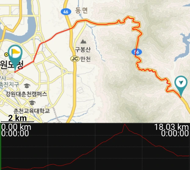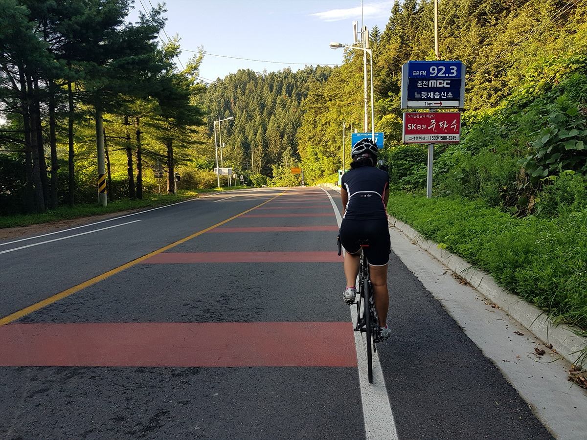춘천 사람들은 주로 의암호를 끼고도는 의암호 둘레길을 많이 달리지만 우린 그 길을 별로 안 좋아한다. 좀 멀리 가는 사람들은 원창고개를 넘어 덕만이 고개로 넘어오기도 한다. 우리가 비교적 자주 가는 운동 코스는 춘천 동쪽에서 동홍천으로 가는 56번 국도로 느랏재를 올라가는 것이다. 코스는 아주 쉽다. 춘천의 중심가 중 하나인 팔호광장에서 계속 직진만 하면 된다. 가락재까지 다녀올 수도 있지만 우리는 주로 느랏재를 넘어서 상걸리까지만 갔다가 돌아오는 35km 정도의 코스를 달린다.