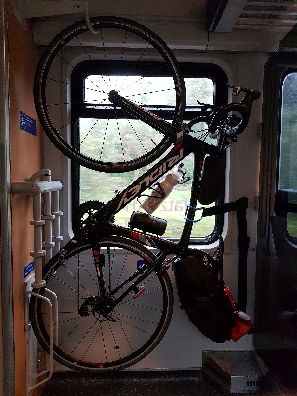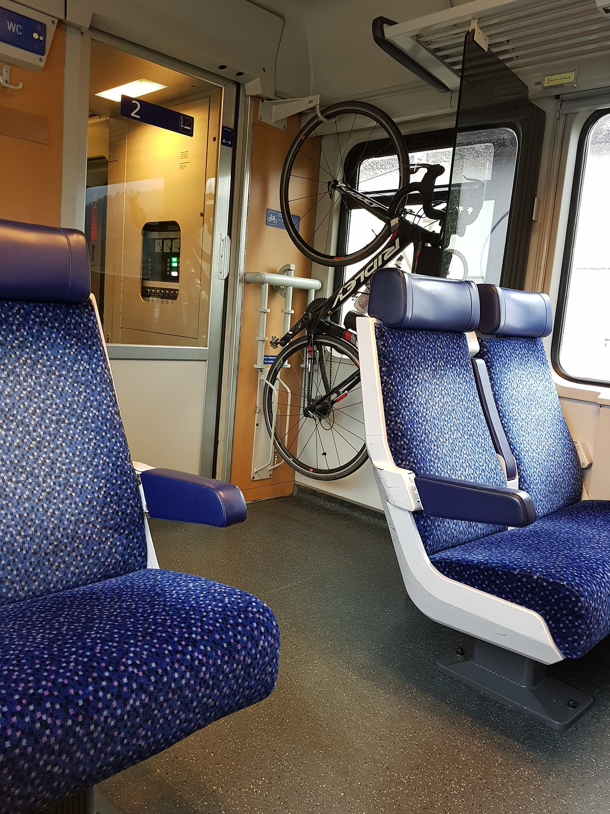 이 기차는 장거리 노선인 듯한데 자전거 거치대가 있다. 부럽다. 우리나라 기차에도 이런 유료 자전거 거치 공간이 있으면 고속철도 라인 따라서 마음껏 돌아다닐텐데... 자전거 앞바퀴를 위 고리에 걸고 옆의 고리에 프레임을 걸어서 움직이지 않도록 고정했다. 안정적이다.