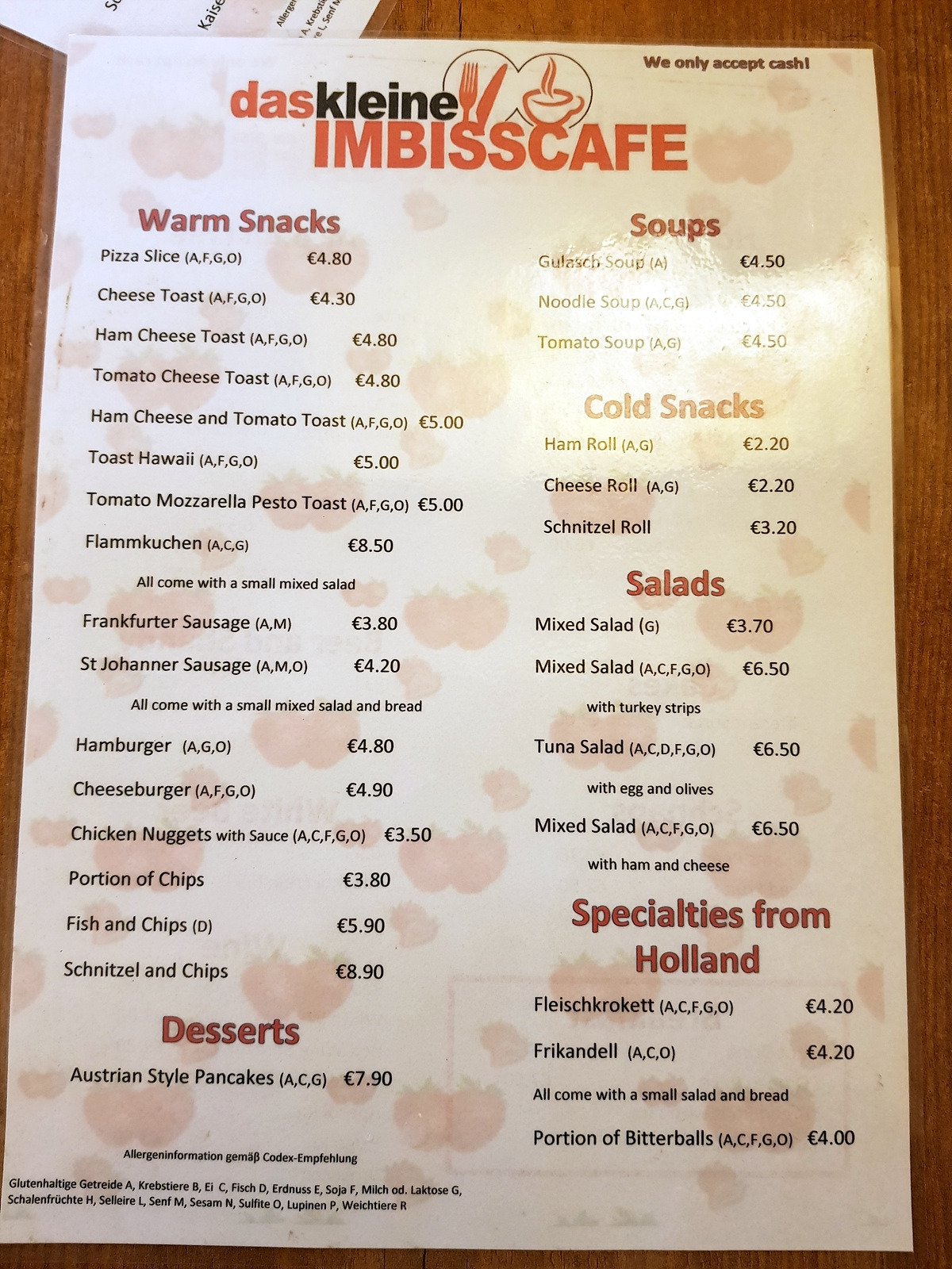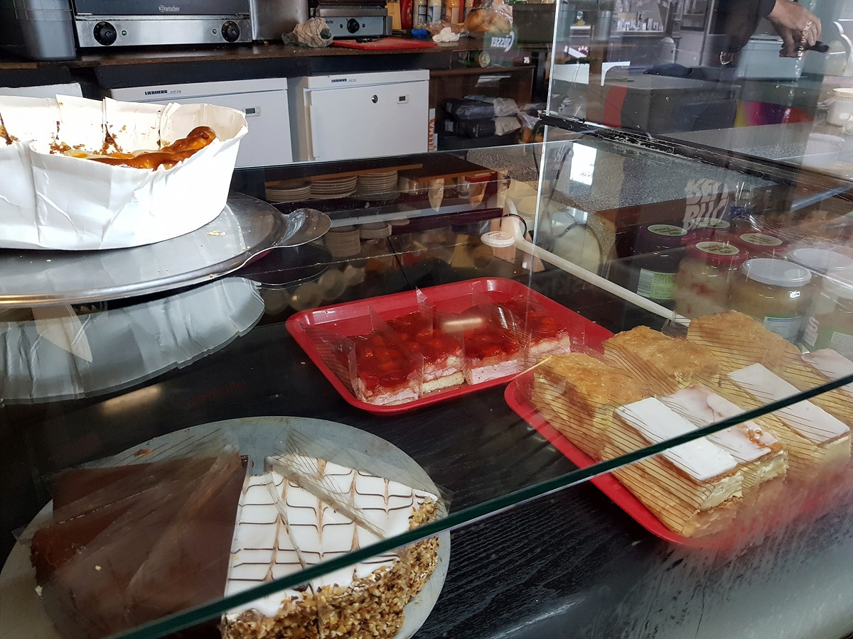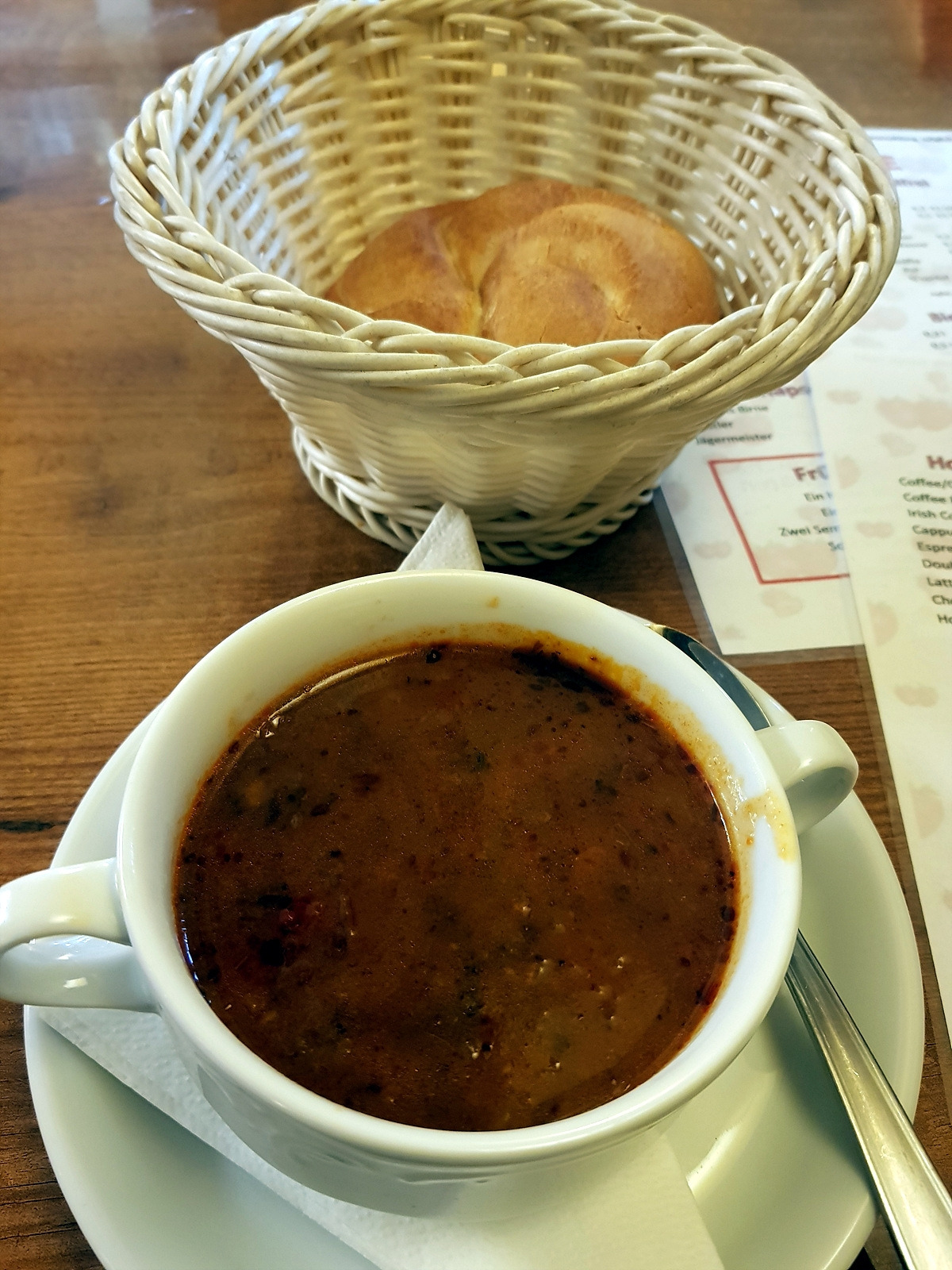 오늘 예약한 호텔 근처로 갔더니 간단한 카페 같은 것이 있어서 점심을 먹기로 한다. 날이 추운데 비 맞은 생쥐꼴로 들어가니 가게 아줌마가 따듯한 히터 자리에 앉도록 해준다. 일단은 따듯한 굴라쉬 수프 하나 그리고 여기 특산 소시지 하나를 주문한다.