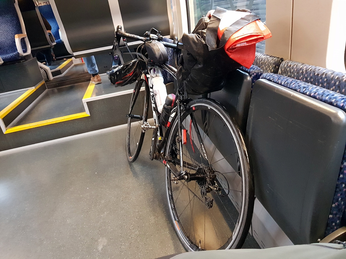 기차에 타다가 비에 젖은 바닥이 미끄러워서 우당탕하고 자전거와 함께 넘어졌다. 큰 소리가 났더니 근처에 앉아있던 젊은 청년이 쫓아와서 괜찮냐고 물어본다. 정강이를 조금 찧었지만 괜찮다. 완행열차, 혹은 전철이라 할 수 있는 좀 짧은 기차에 자전거를 이렇게 싣고 옆에 앉아서 간다.