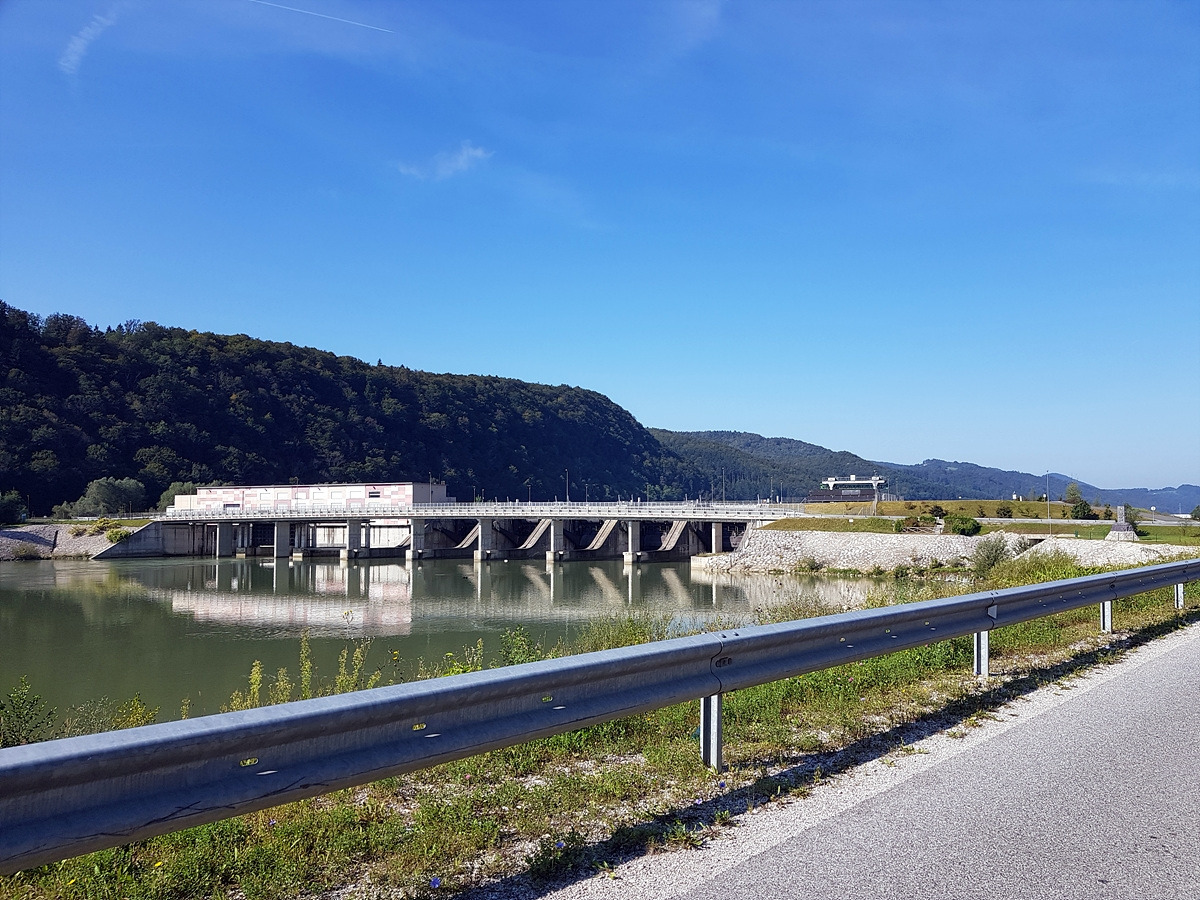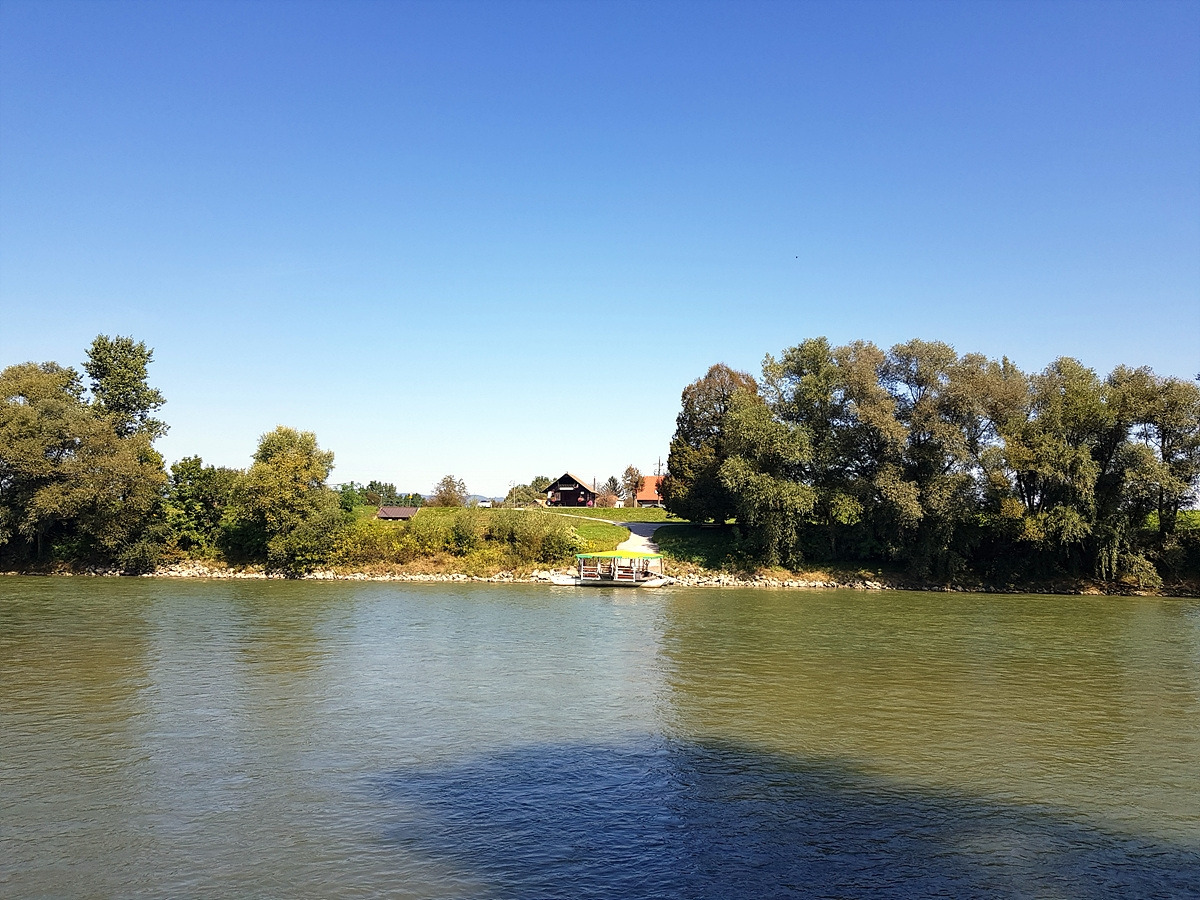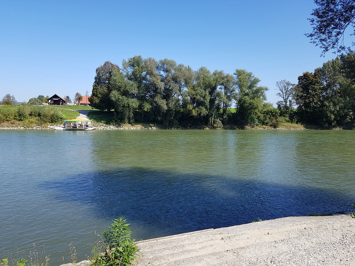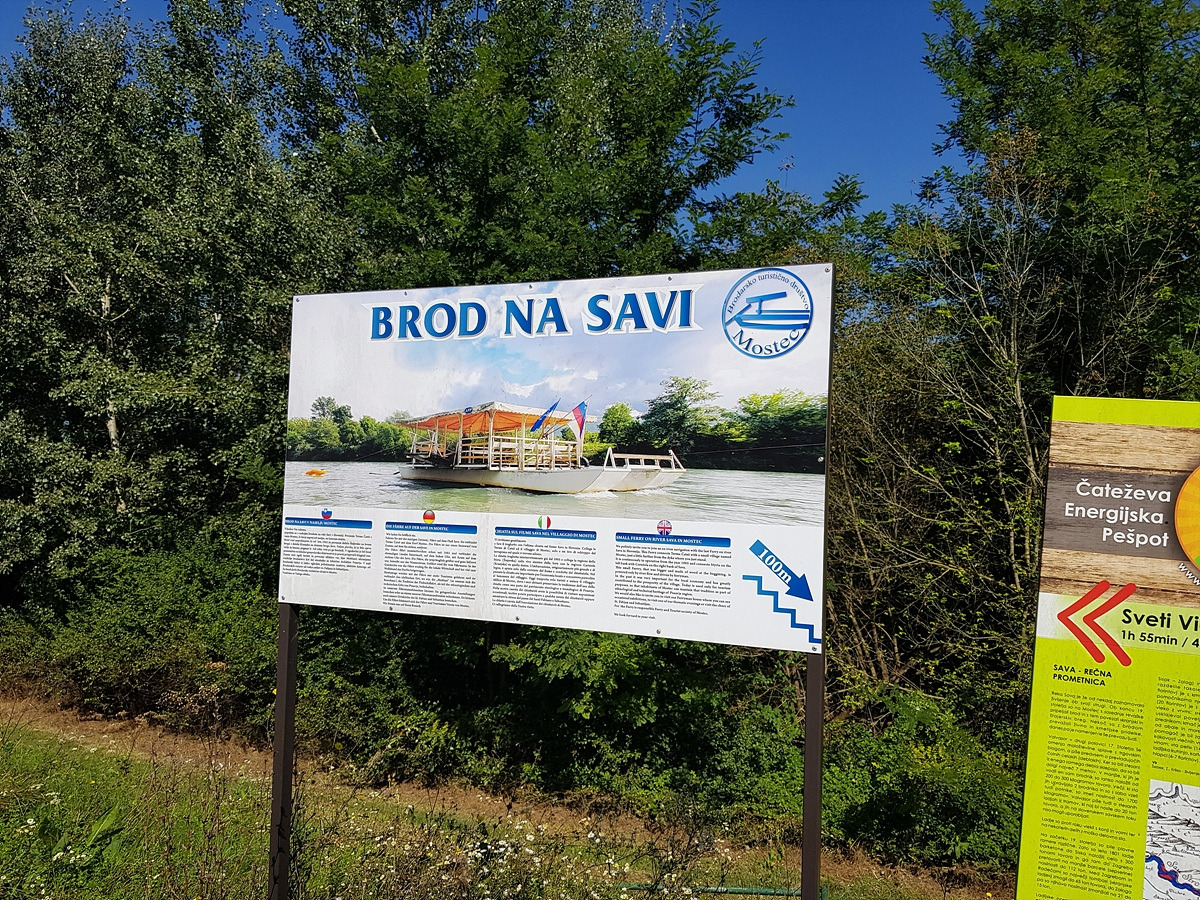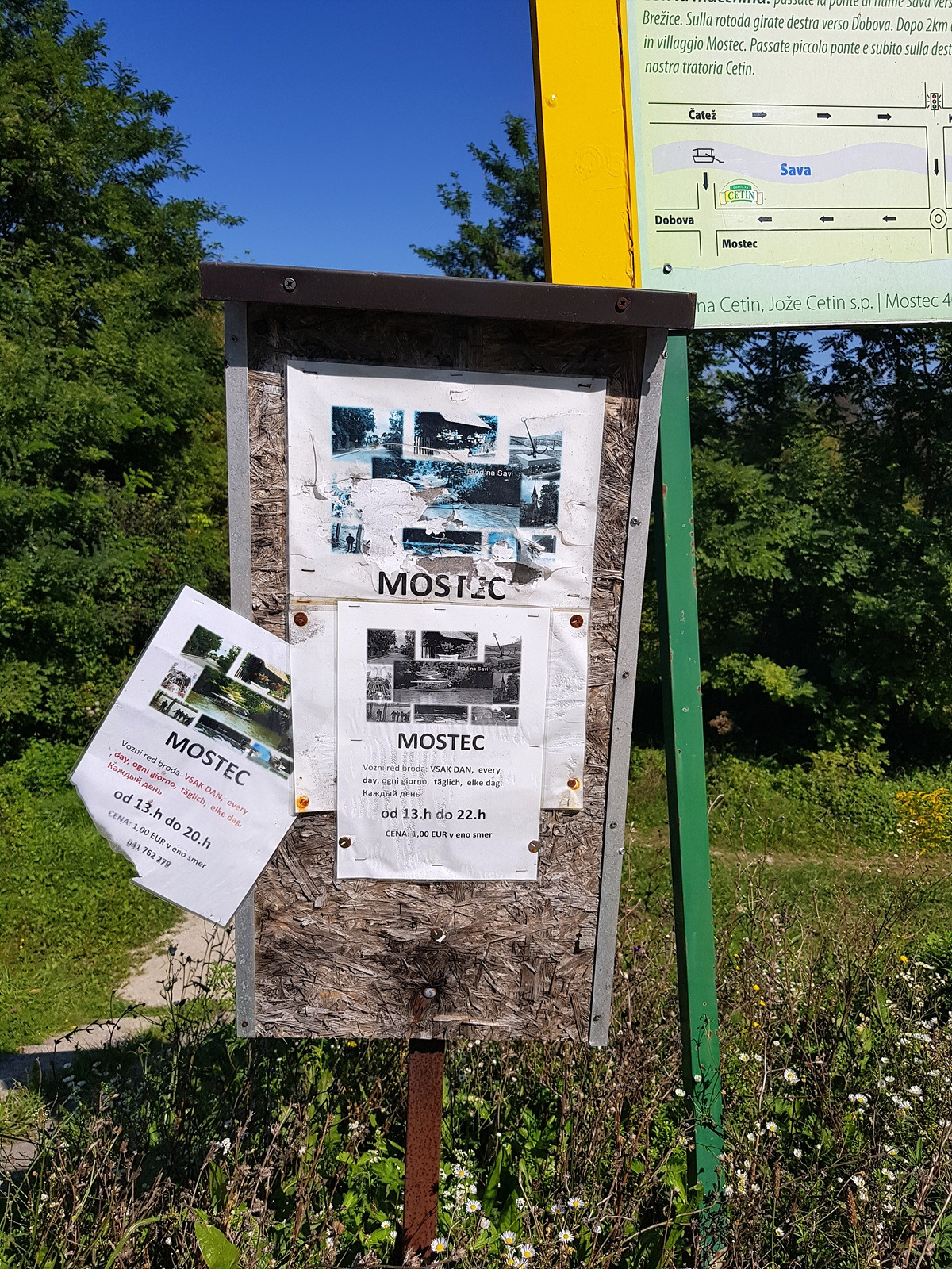 잠시 멈췄더니 안내판이 보인다. 얼핏 보니 쓰인 말은 모르겠지만 사진을 보아하니 강을 건너는 배가 있나 보다. 아래쪽에 자세하게 4개 국어로 설명이 되어 있다. 이런 점에서는 관광 안내판이 독일어 투성이인 오스트리아보다 나은 것 같다. 댐으로 뱃길이 막혀버린 슬로베니아 사바강에서 마지막 남은 나룻배라고 한다. 그리고, 건너가면 레스토랑도 있다고 하고... 배 운행 시간도 조금 쉬면서 기다릴 법한 12시다. 한 번 가볼까?