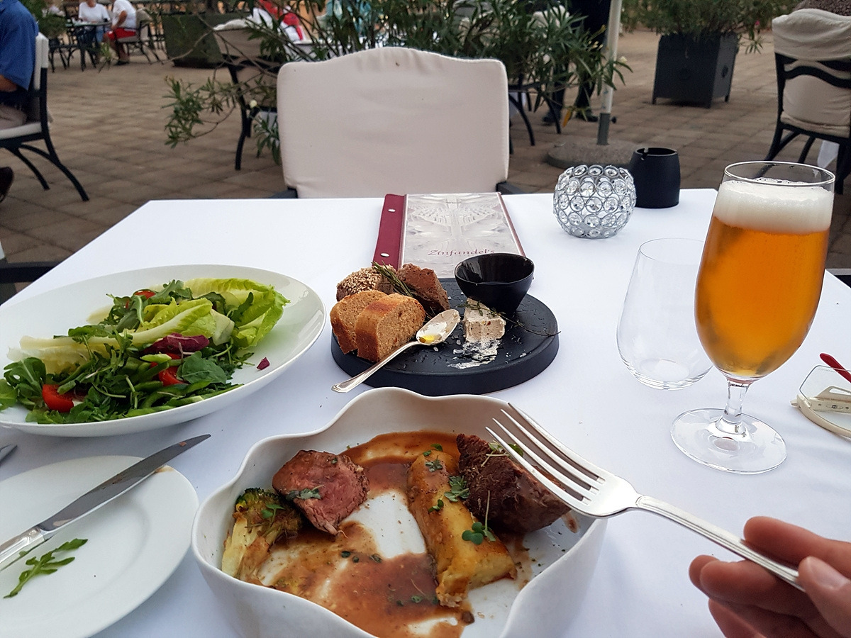 문제는 메뉴판에 가격이 적혀있지 않다는 것이지만 까짓 거 혼자 먹어봐야 얼마나 먹겠는가. 맥주 한 잔과 스테이크와 샐러드를 주문했다. 맥주와 빵부터 빠르게 나오고... 맥주는 조금 더 쌉싸름한 맛이 강하다.