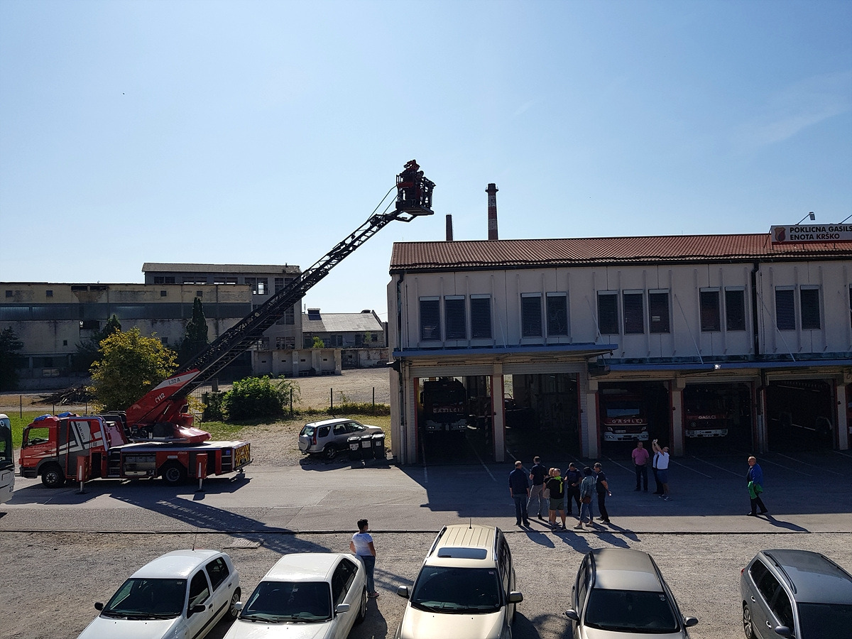 무슨 행사가 있는지 소방서에 사람들이 모여 있고 고가 사다리차를 타면서 환호성을 지른다.