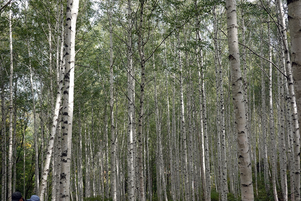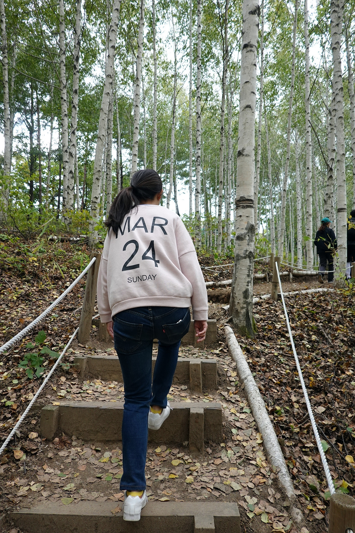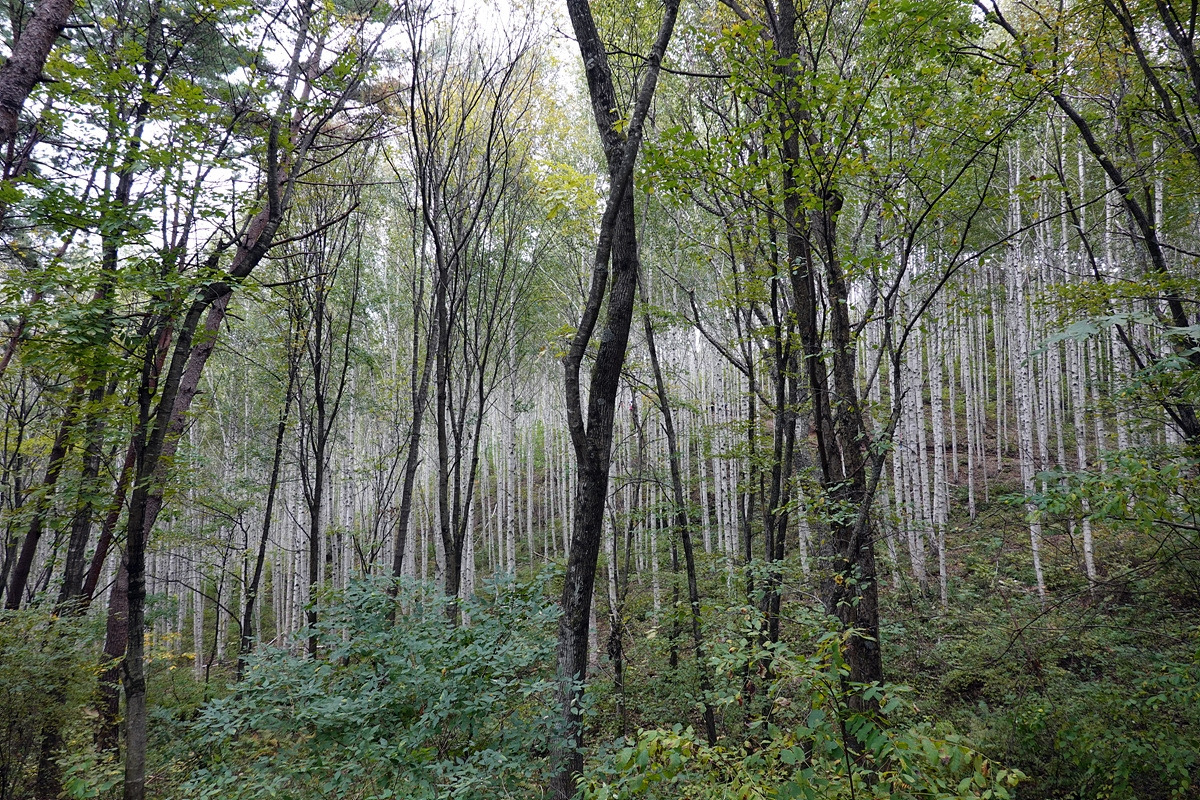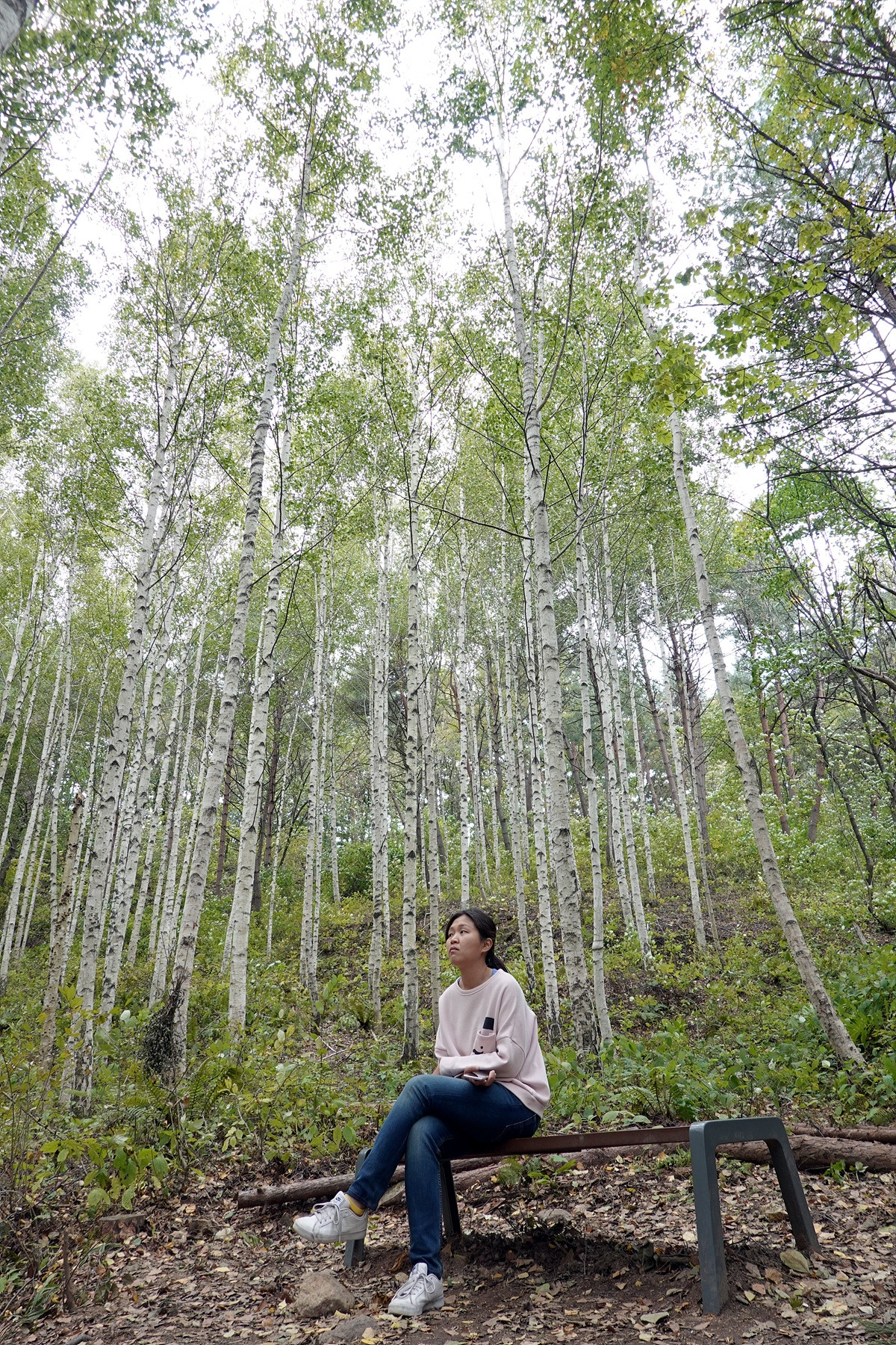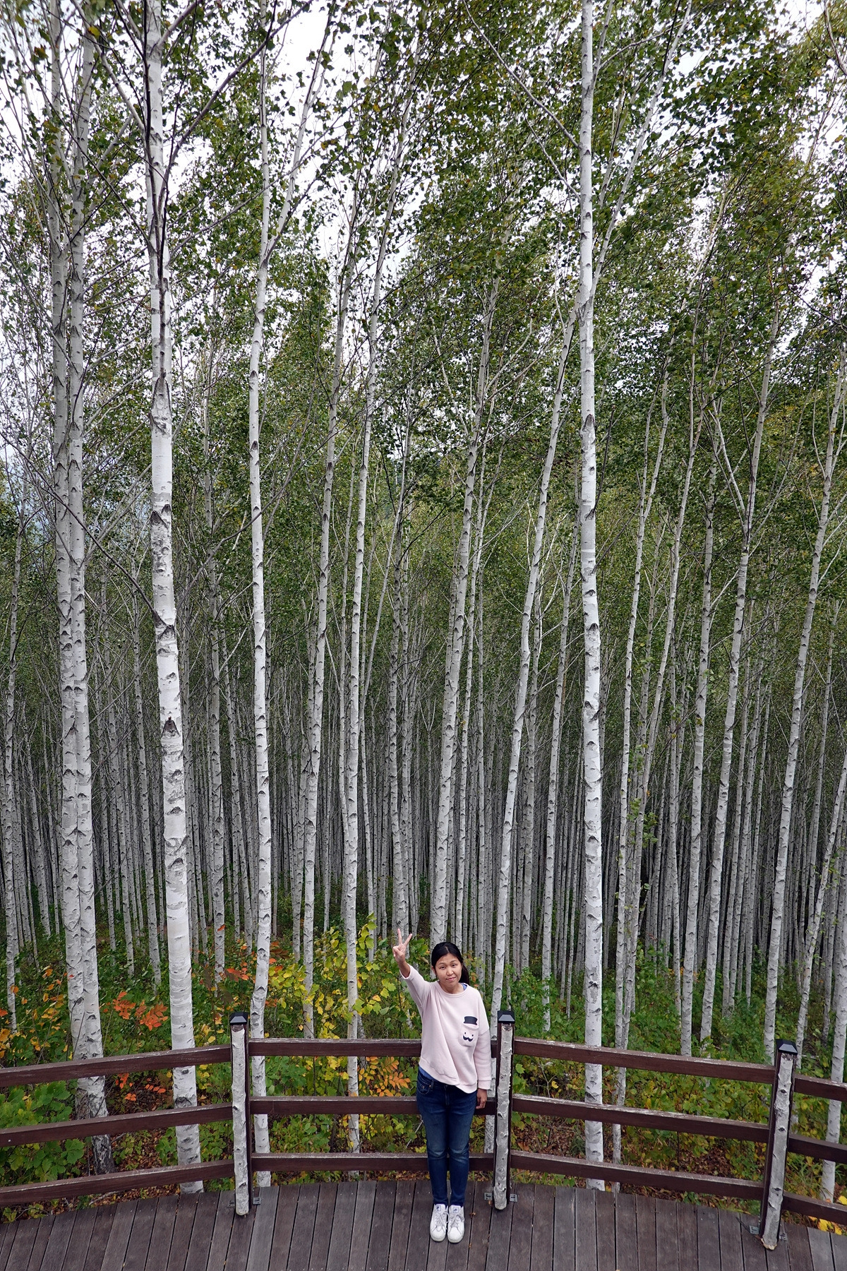여기서 주차장 쪽으로 되돌아나가기로 한다. 임도 정상에서 조금 내려가면 아무 표시도 없는 길이 있는데 이 길로 들어가면 자작나무 숲에서 가장 높은 전망대가 있다. 이 환상적인 자작나무 숲에서도 가장 멋지게 사진을 찍을 수 있는 포인트인 듯하다. 우리가 사진을 찍으니 우리 뒤에 따라오던 사람들도 줄줄이 사진 찍느라 난리다.