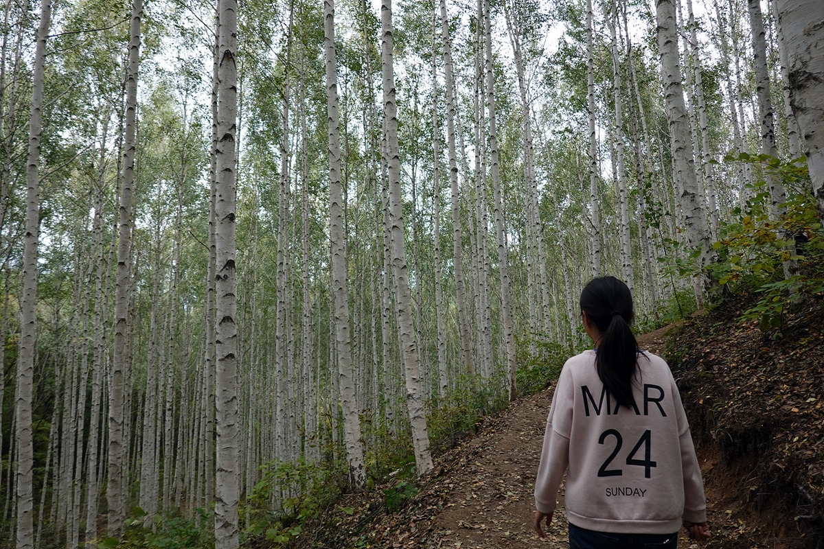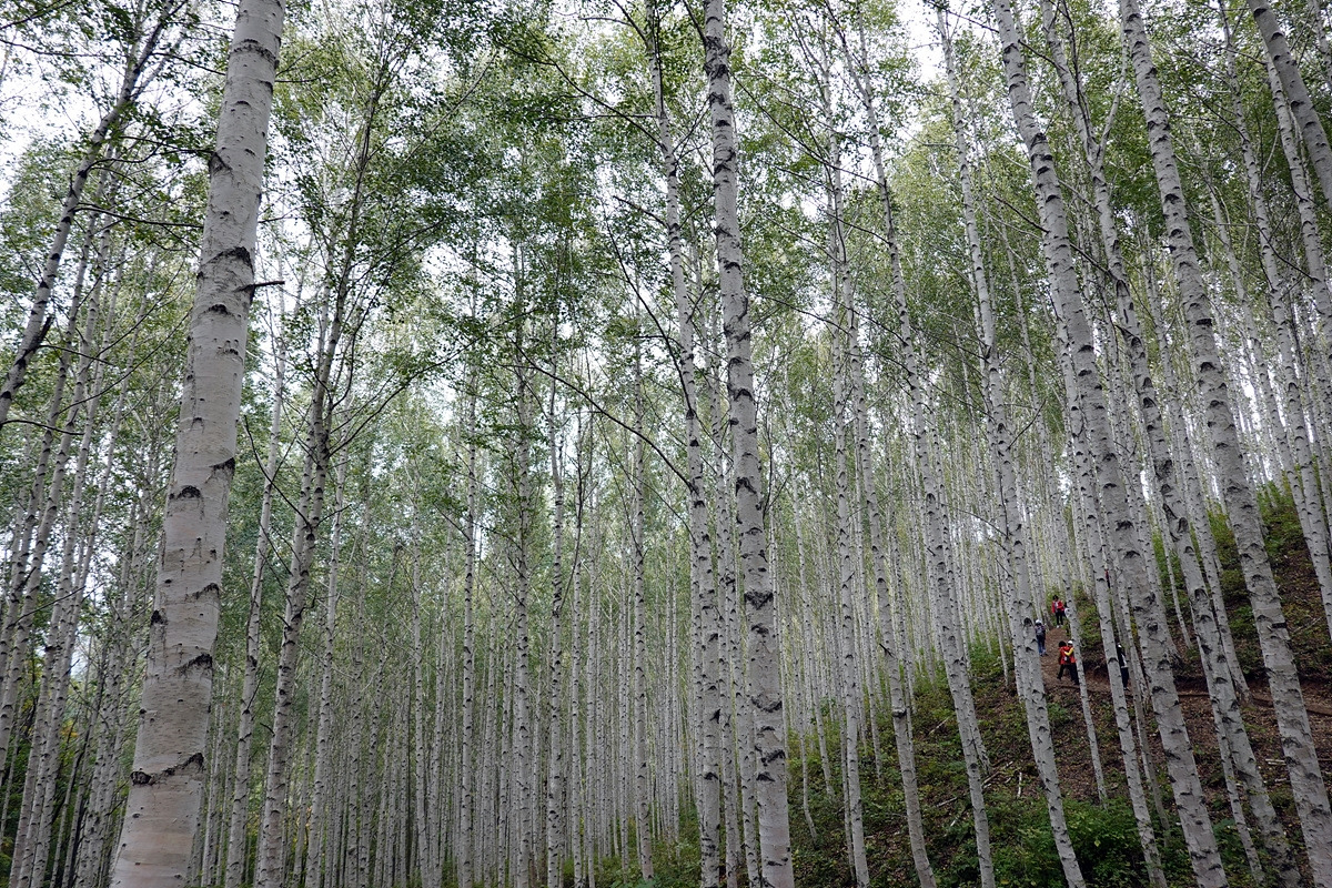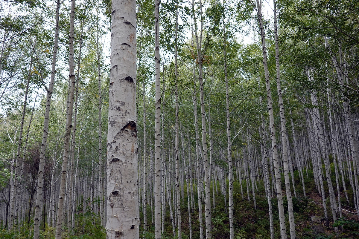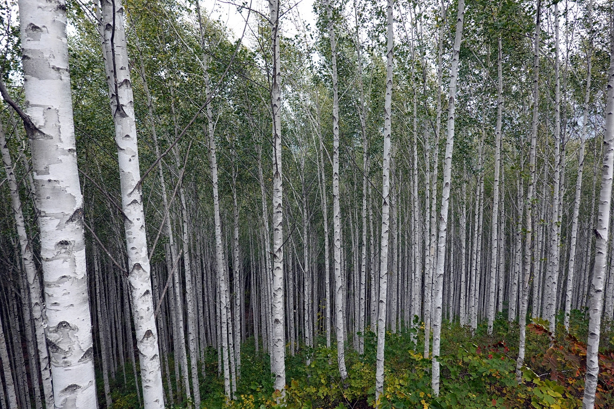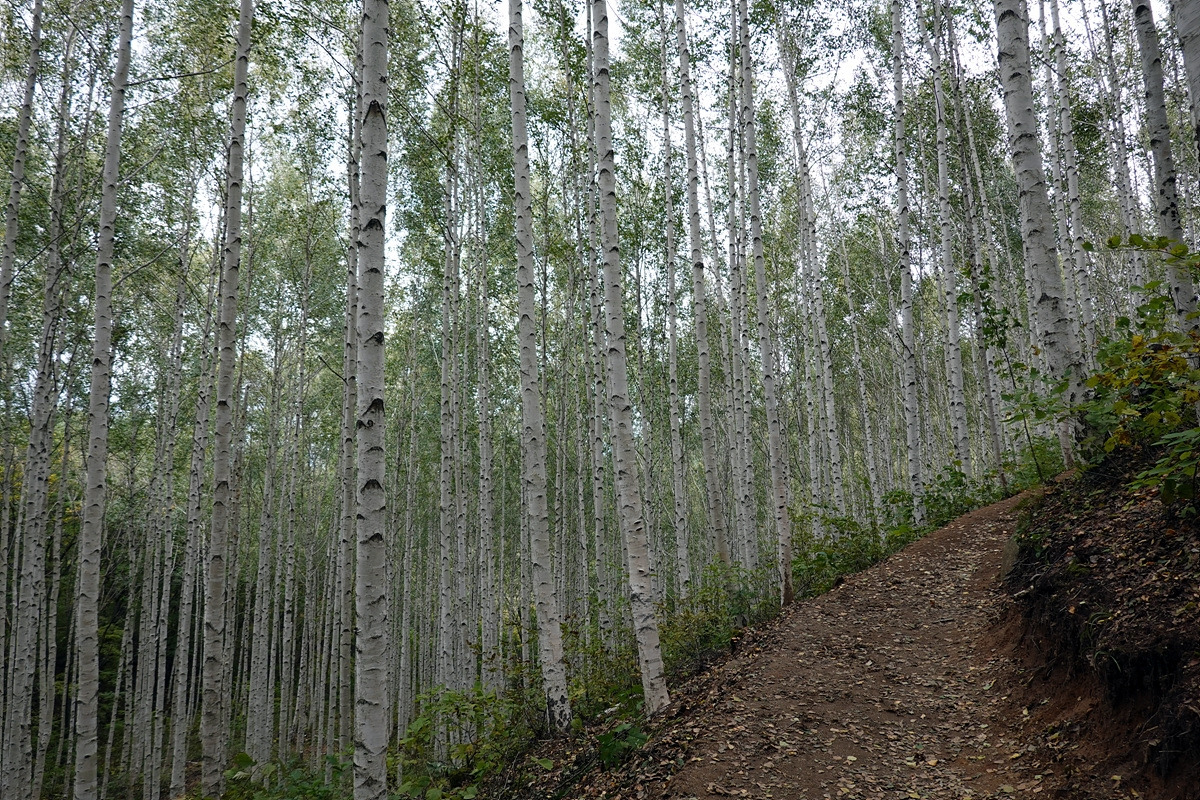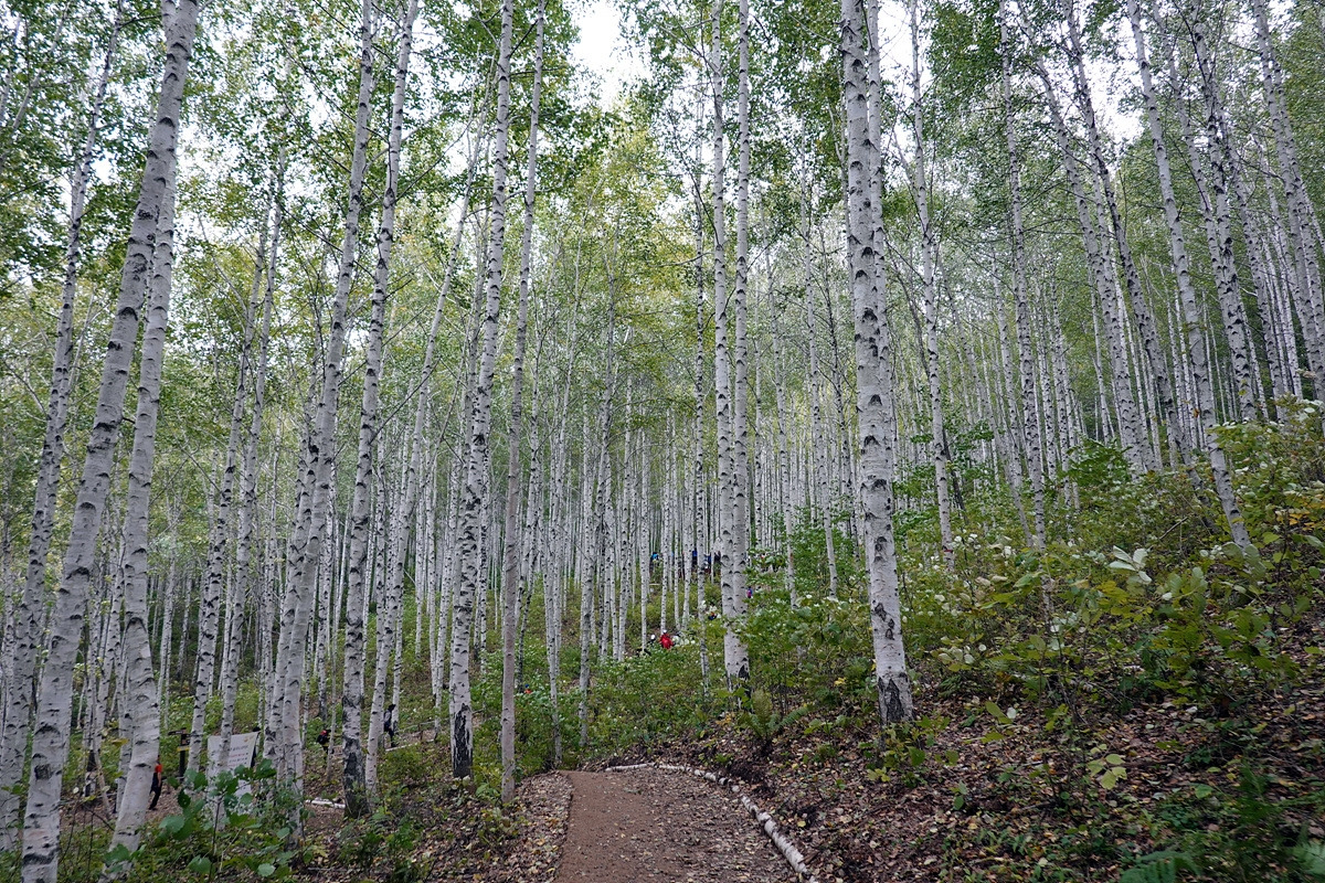 여기서 주차장 쪽으로 되돌아나가기로 한다. 임도 정상에서 조금 내려가면 아무 표시도 없는 길이 있는데 이 길로 들어가면 자작나무 숲에서 가장 높은 전망대가 있다. 이 환상적인 자작나무 숲에서도 가장 멋지게 사진을 찍을 수 있는 포인트인 듯하다. 우리가 사진을 찍으니 우리 뒤에 따라오던 사람들도 줄줄이 사진 찍느라 난리다.