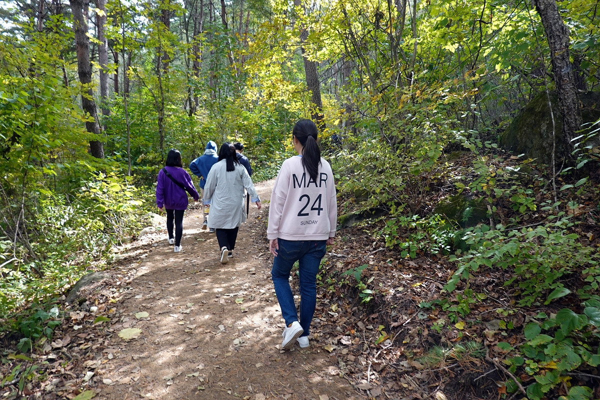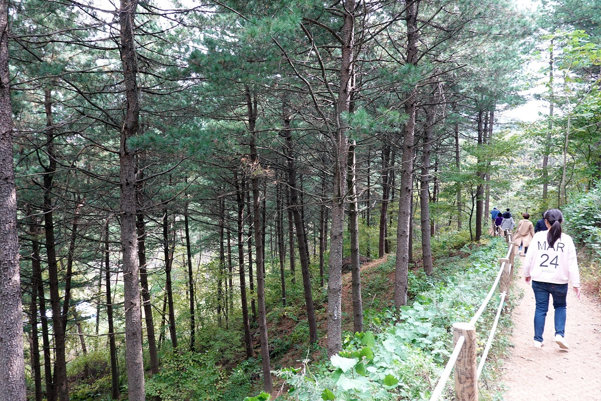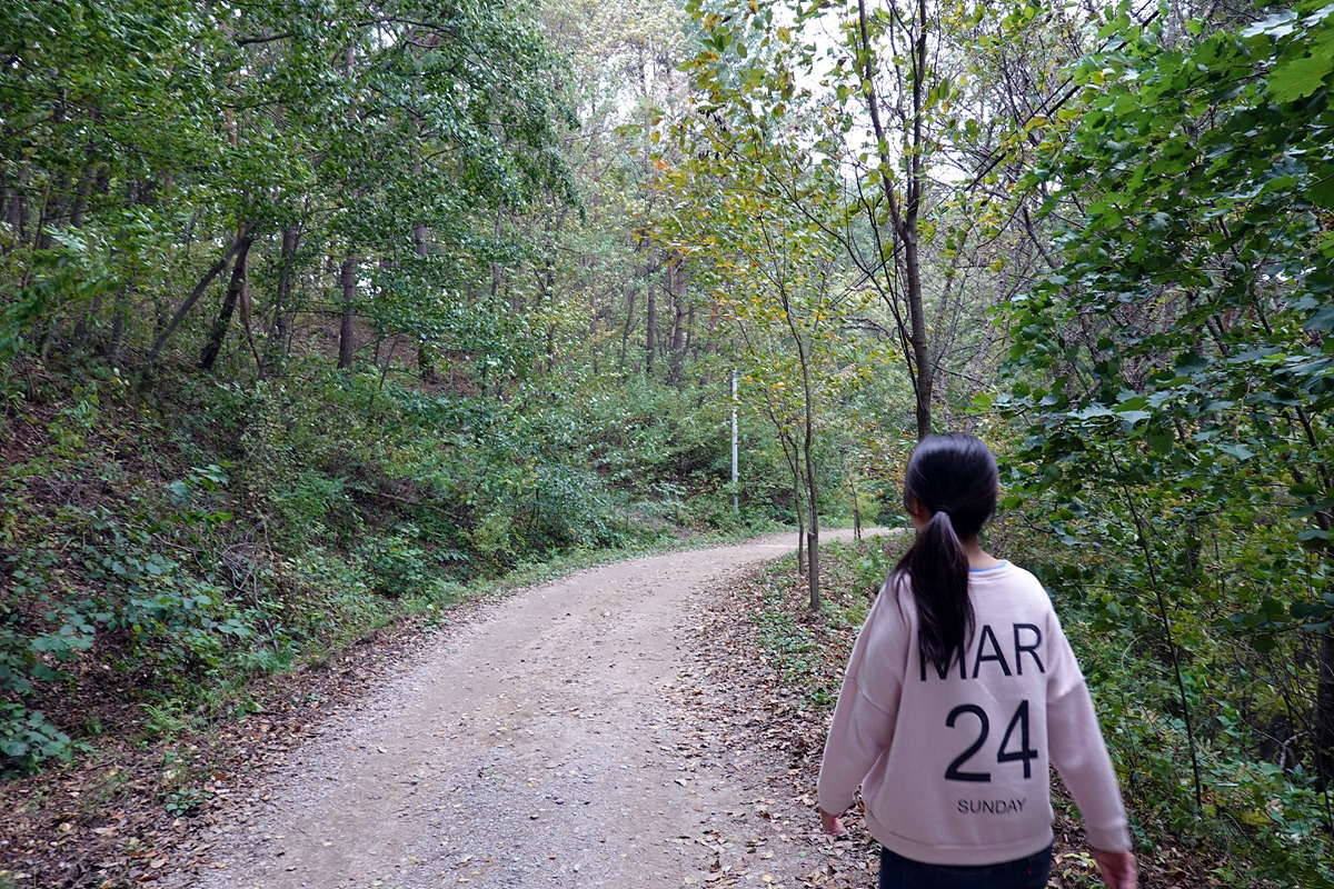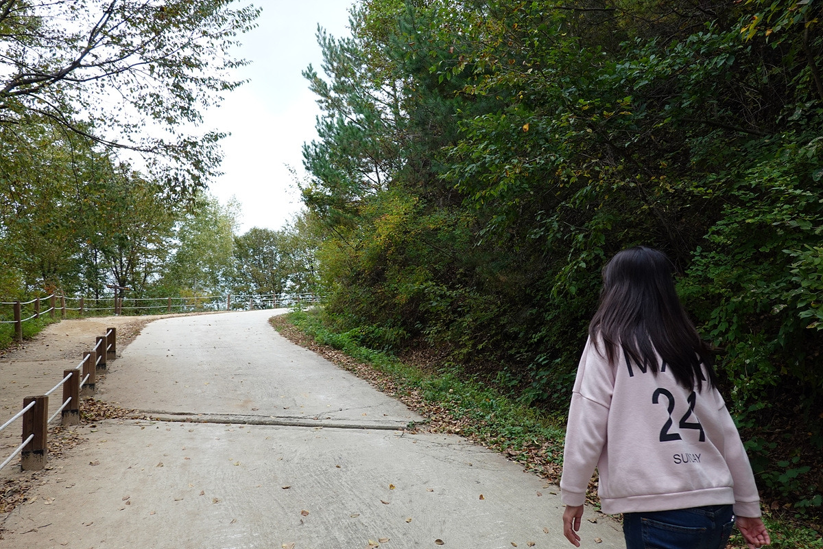 사람이 많이 다니는 임도라 그런지 보행로가 나누어져 있고 중간중간 콘크리트 포장이 되어 있어서 걷기 편한 길이다. 단풍이 많이 들지 않아 아직 가을 초입이라고 생각하지만 벌써 낙엽들이 바람에 흩날린다.