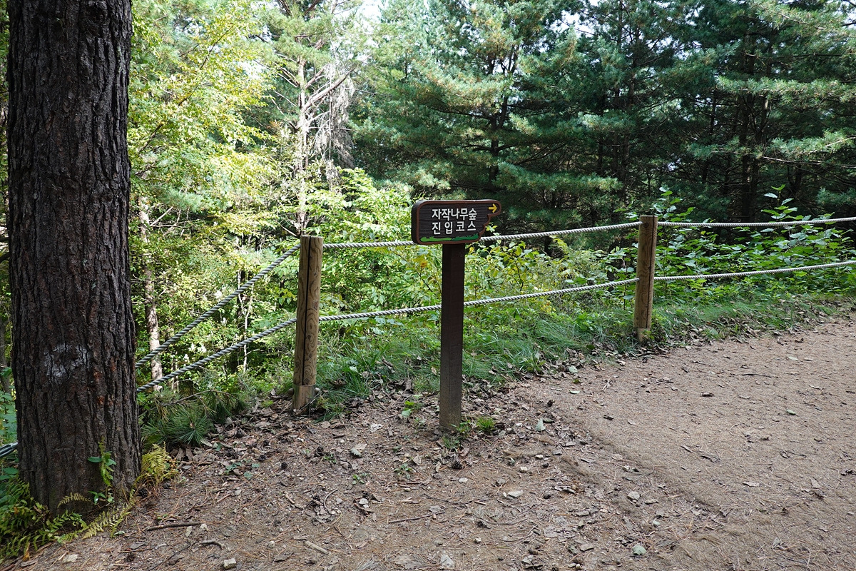 걷다 보면 자작나무 숲 진입코스 입구 표지판이 있다. 여기서부터는 임도가 끝나고 완만한 등산로가 시작된다. 드디어 자작나무 숲인가?