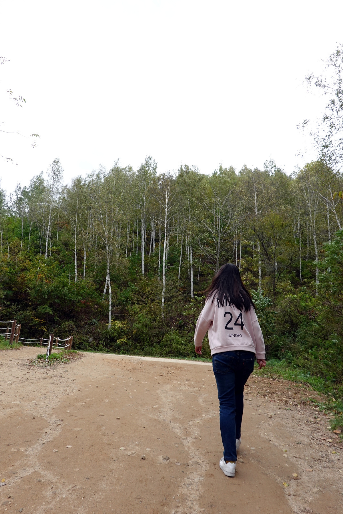 자작나무 숲은 도로변에 있는 것이 아니라 임도나 등산로를 따라서 숲 속으로 들어가야 한다. 널찍한 임도를 따라서 걸어간다. 임도 초입부터 곳곳에 하얀 나무 기둥들이줄지어 보이는데 자작나무 숲은 아직 시작도 안 했다.