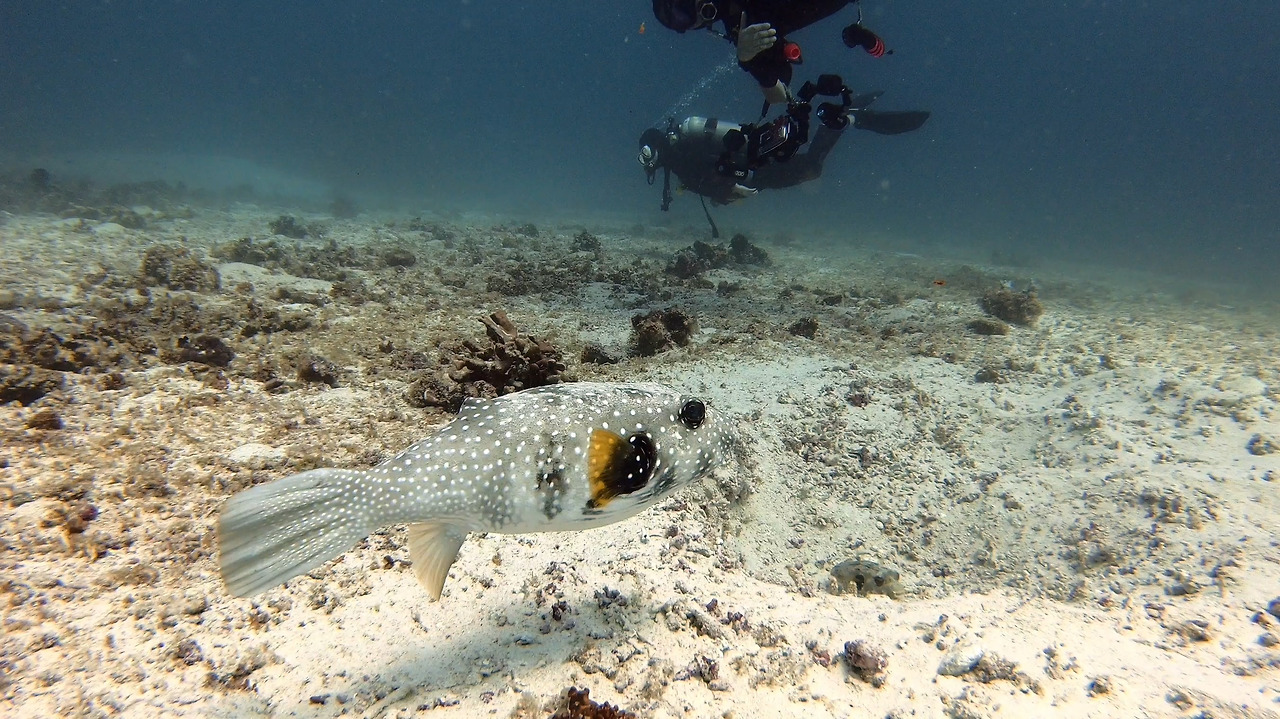 흰점꺼끌복(white-spotted puffer)도 나타났다. 아까 나타난 꺼끌복보다는 귀엽게 생겼다.
