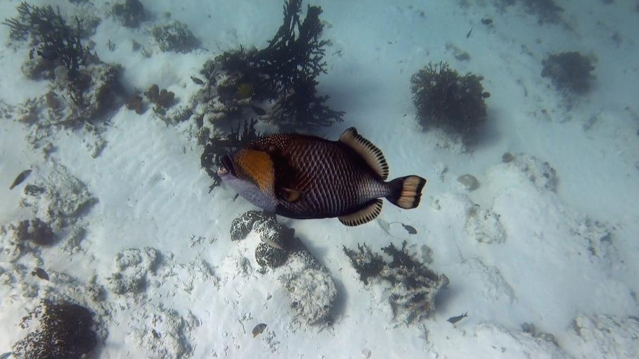 아까는 크라운 트리거피쉬를 만났는데 이번에는 볼 때마다 이빨이 무섭게 느껴지는 Titan triggerfish를 만났다. 지금은 순하지만 3~4월 산란기쯤에는 자기 영역에 다이버가 들어오면 무섭게 달려든다. 우리는 1~2월에 주로 다니니 난폭해진 녀석을 볼 기회가 없긴 하다.