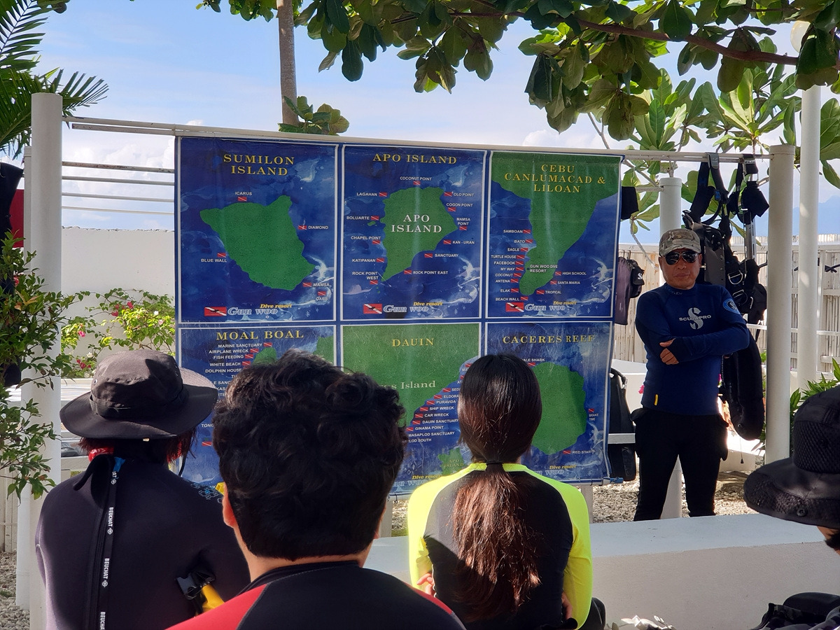 아침 먹고 잠시 쉬다가 브리핑을 시작한다. 오늘은 가장 자주 가는 다이빙 포인트인 수밀론 섬에 간다고 한다. 수밀론 섬은 몇 년 전에 태풍으로 산호가 싹 파괴되었는데 계속 살아나는 중이라고 한다.