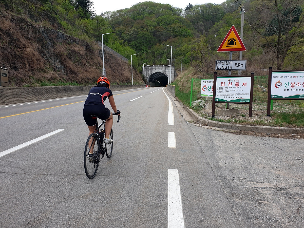 수피령 정상에 아까 우리를 지나갔던 자전거팀이 먼저 올라와서 쉬고 있다. 우리는 원래 고개 정상에서 잘 쉬지 않으니 인사하고 그대로 지나쳐서 내려간다.