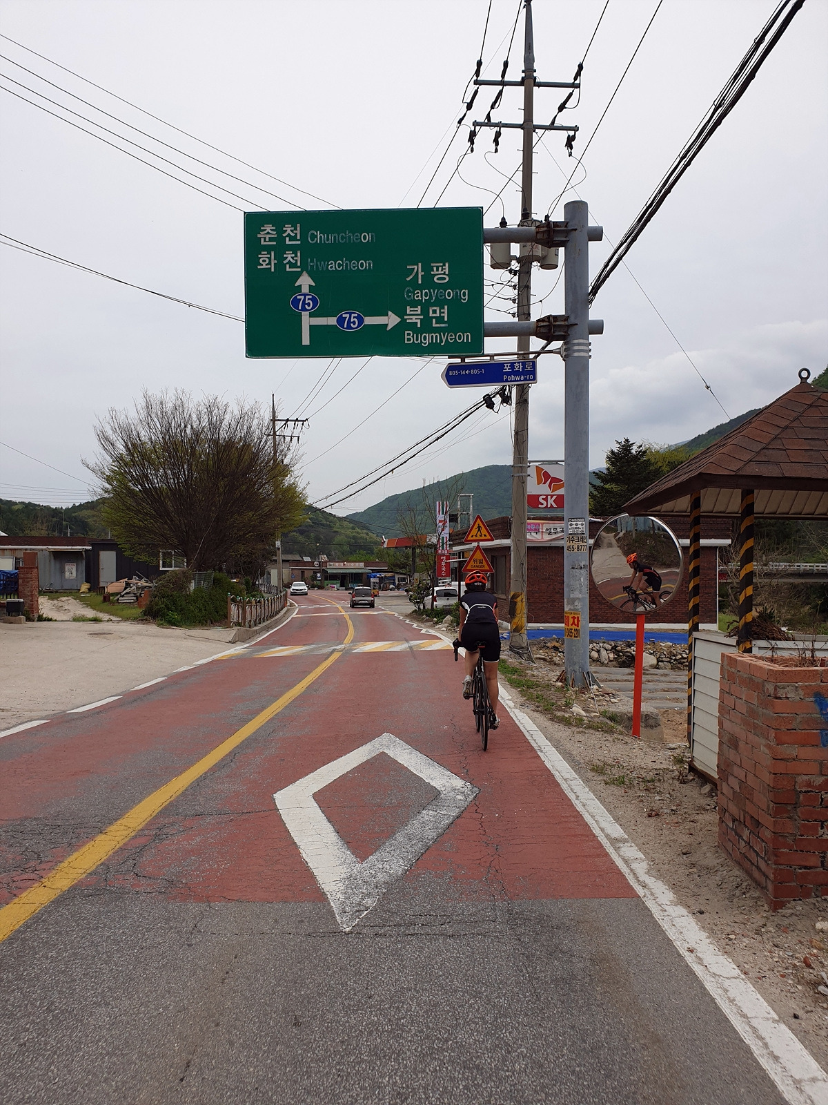 서울 사람들이 많이 가는 화악산-도마치재 코스의 쉼터인 주유소 편의점을 지난다. 오늘도 자전거 타는 사람들이 여럿 쉬고 있다.