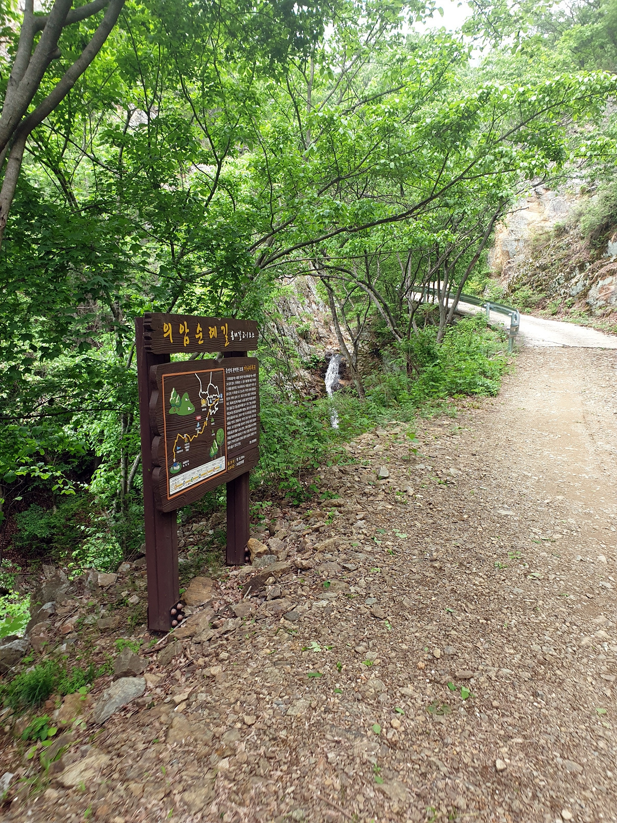 임도 중간에 의암순례길 안내판이 있고 그 뒤로 미나리 폭포라는 작은 폭포가 있다.