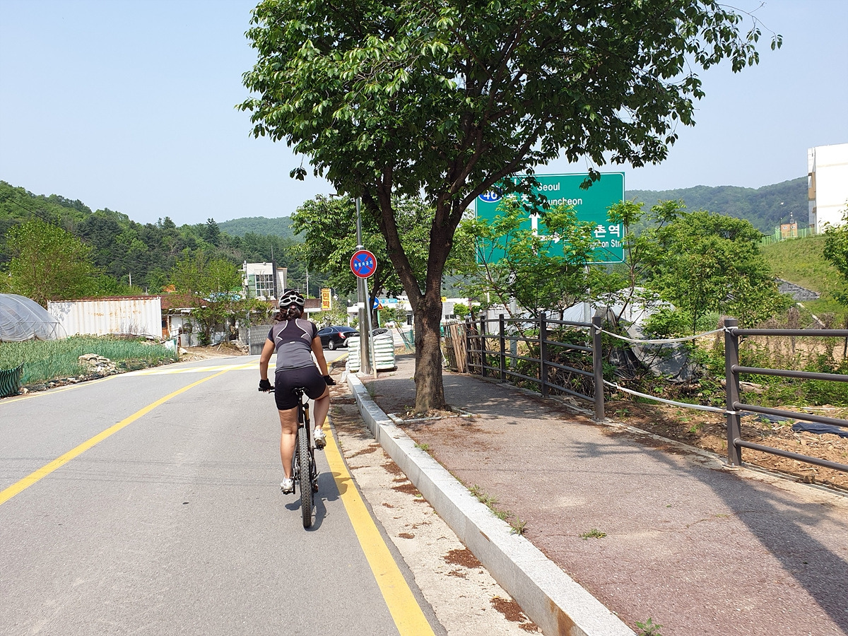 구곡폭포 주차장에서 강촌까지 자전거길이 있는데, 자전거길로는 문배마을에 갔다가 돌아오는 등산객들이 많이 다닌다. 차도로 가야 강촌역 근처에서 강촌역으로 바로 연결되니 우리는 차도로 달린다.