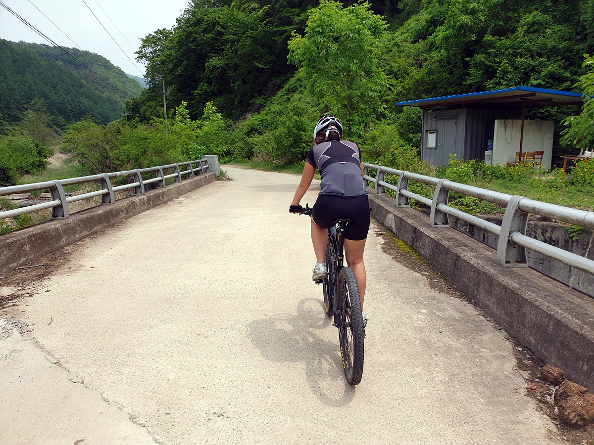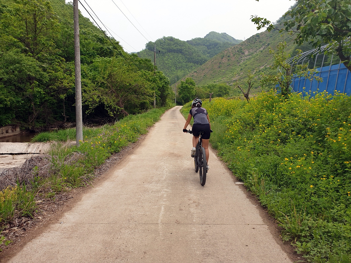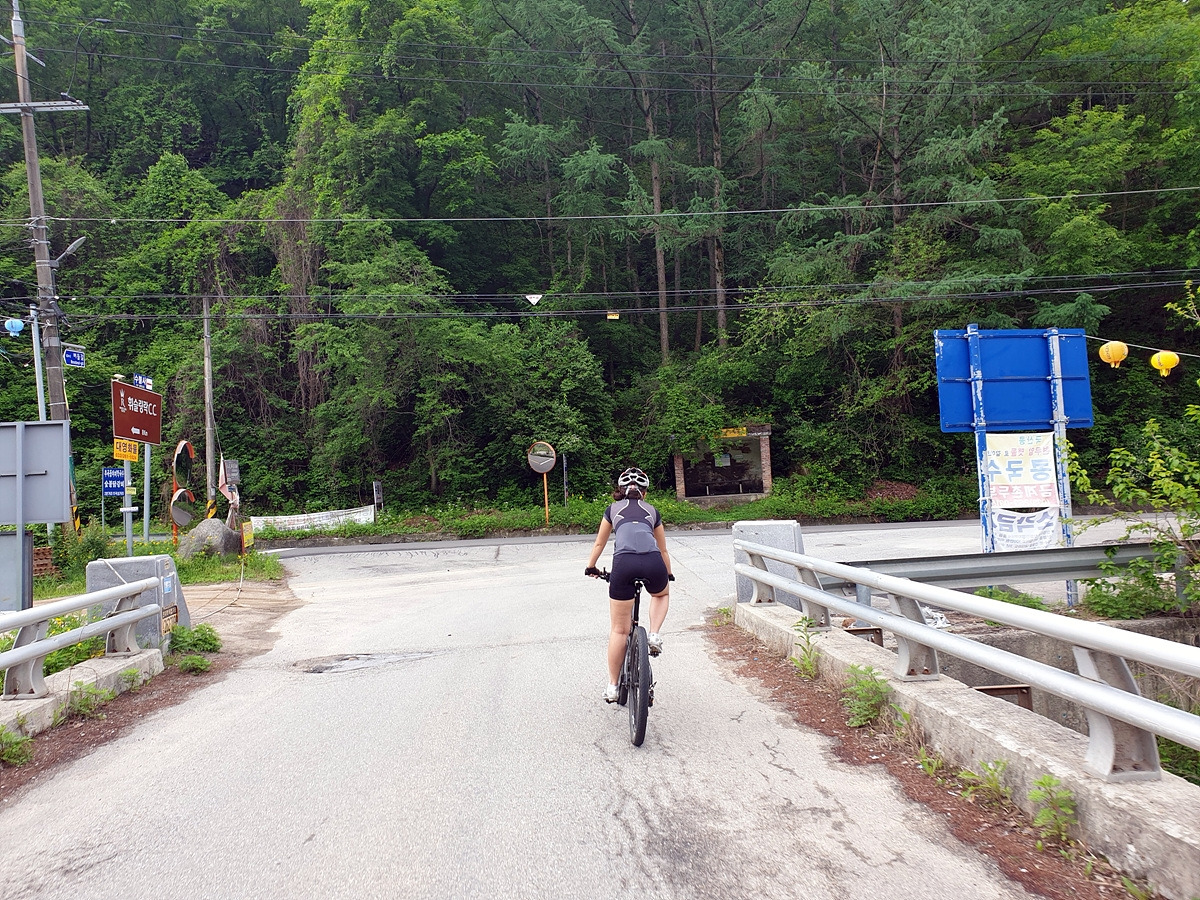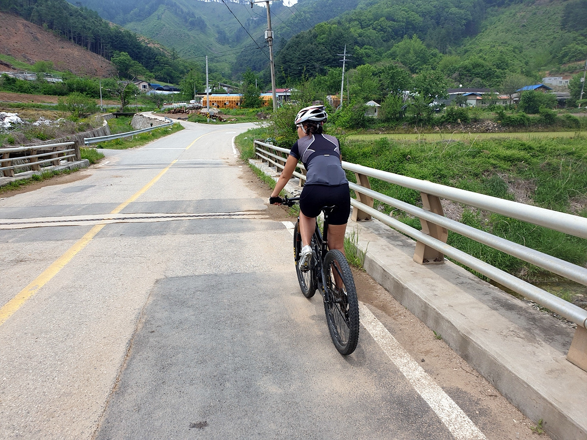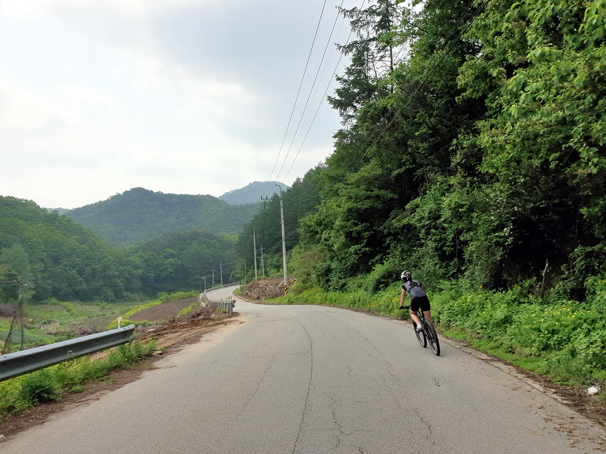 이런 구석구석에도 사람이 산다. 민가가 몇 채 있고 아주 짧은 파쇄석 구간이 있다. 산악자전거라 막 다녀도 문제가 없는데 로드바이크라면 아까 한치고개 오르막길 경사나 파쇄석 구간 때문에 조금 주의해야 할 곳이다.