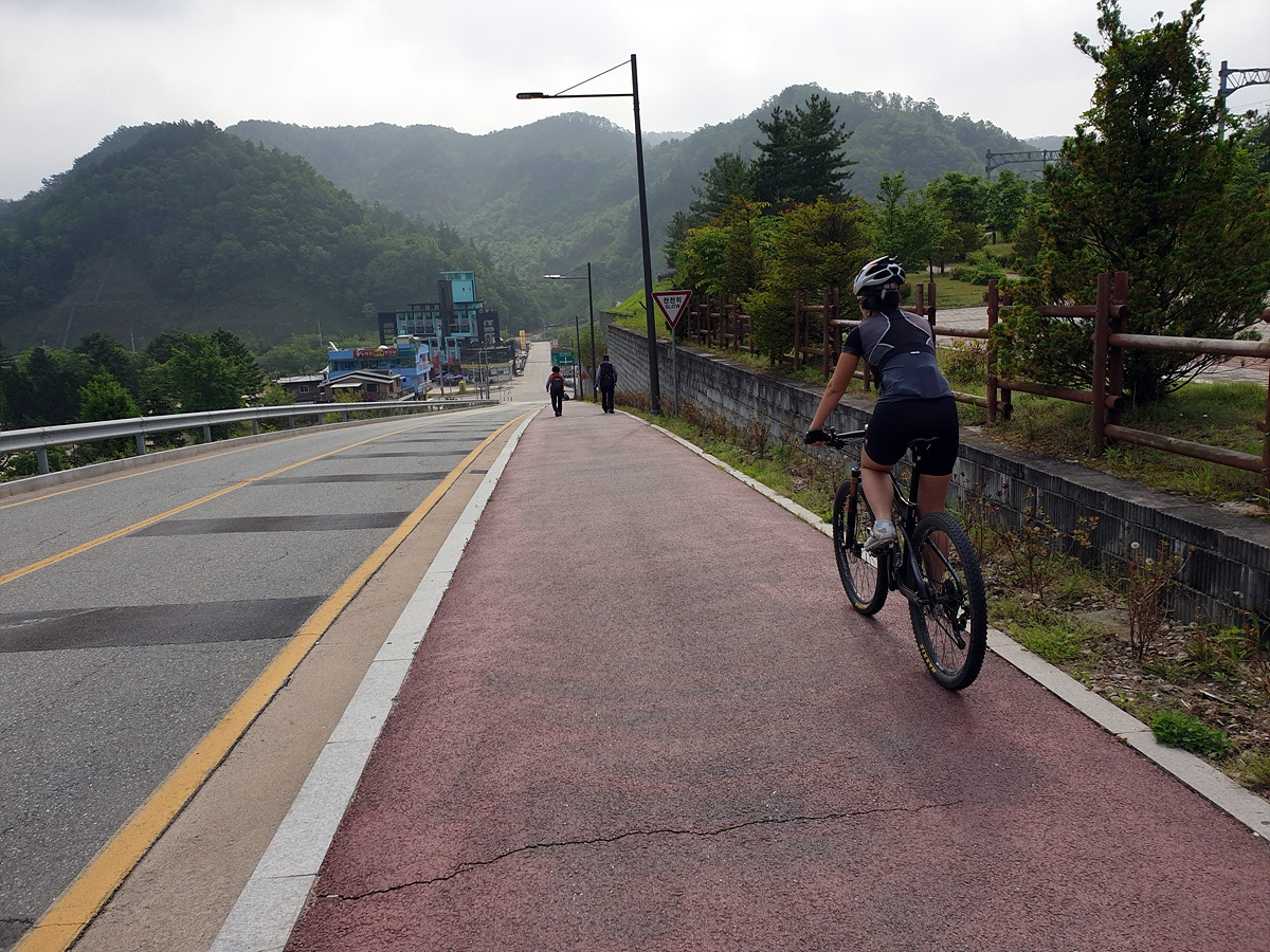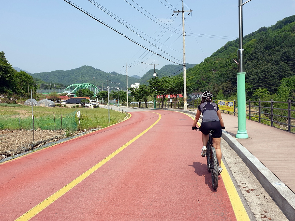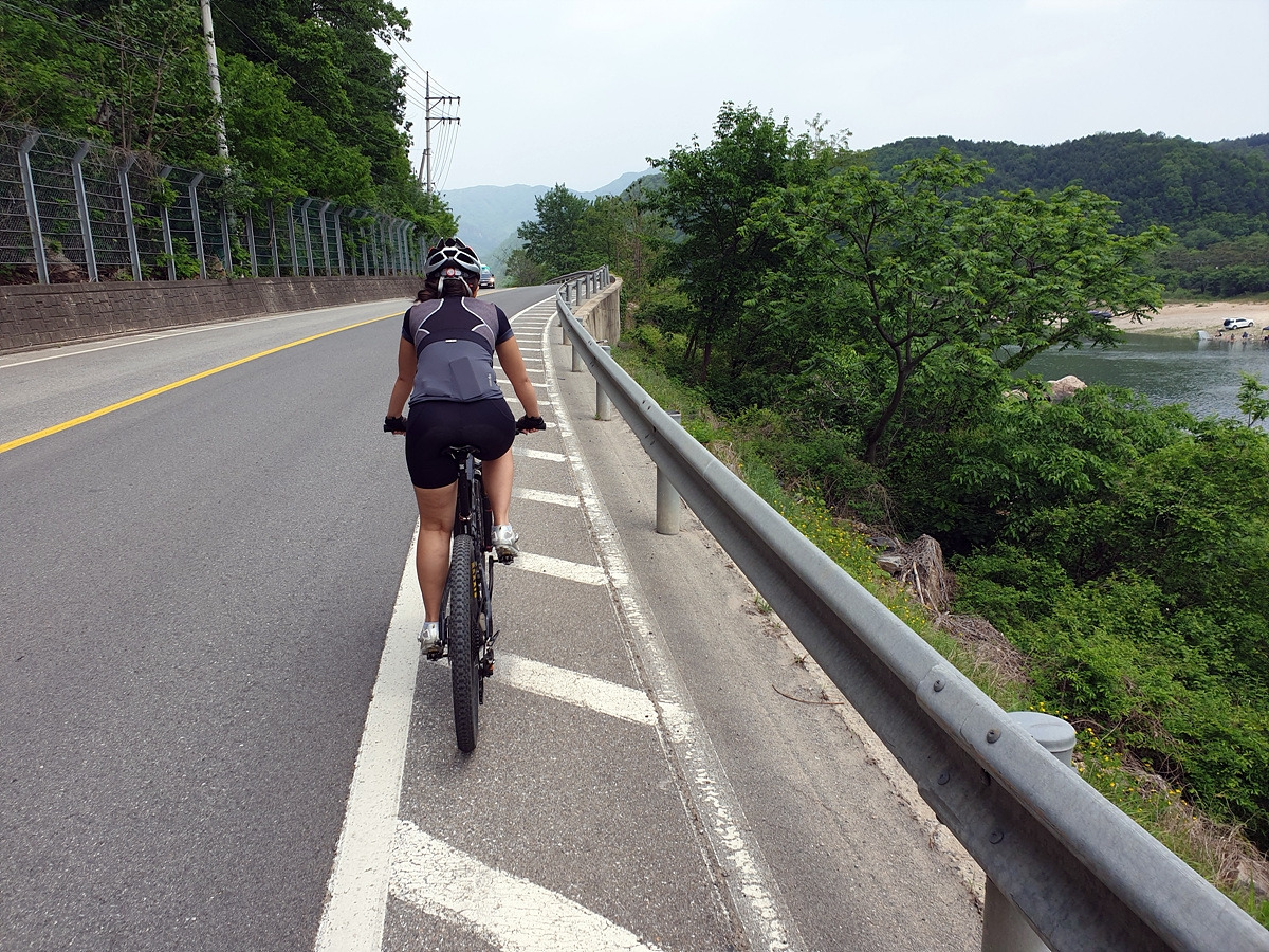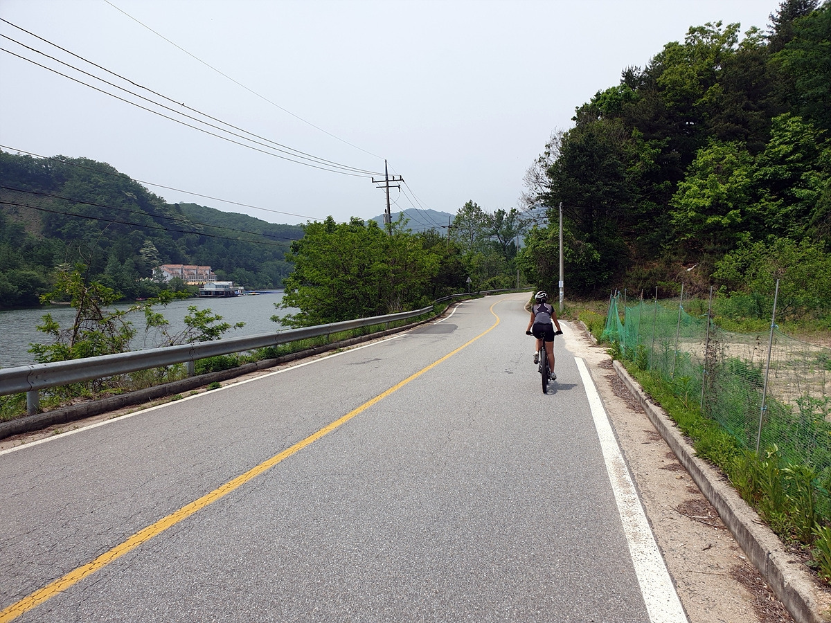 이제부터 당분간 홍천강을 따라 달린다. 살짝 오르막 내리막이 있는 시멘트 포장길을 달린다. 나무가 울창해지니 홍천강이 잘 보이지 않는 대신 시원한 나무 터널로 달린다.