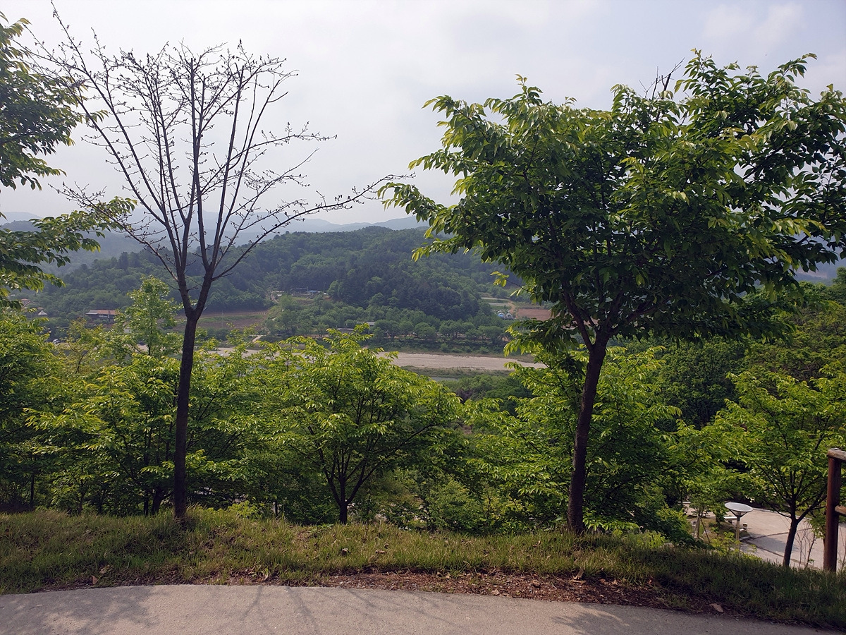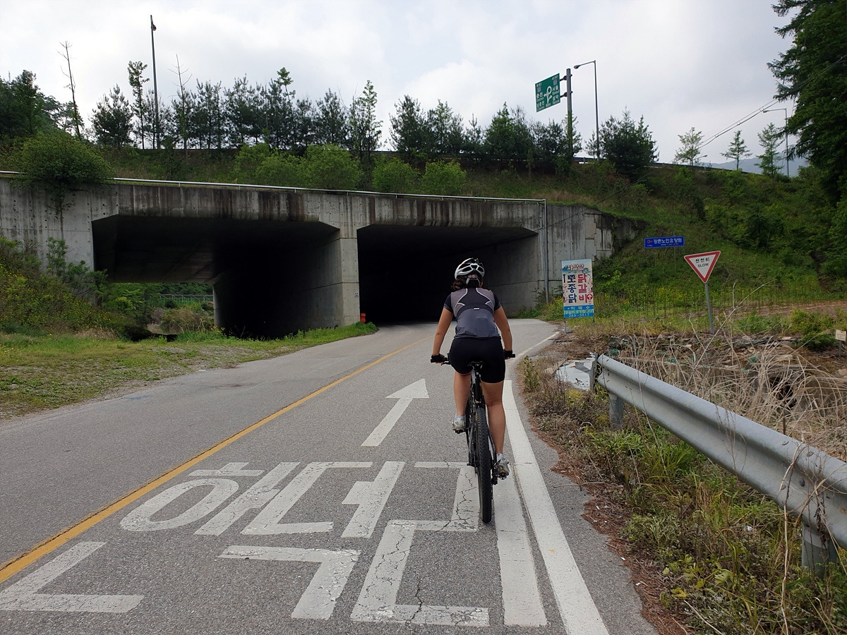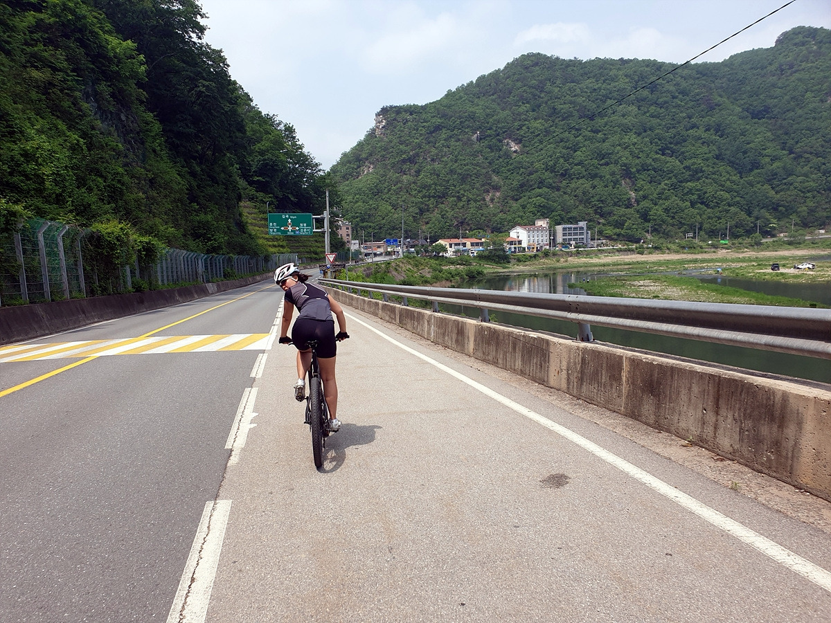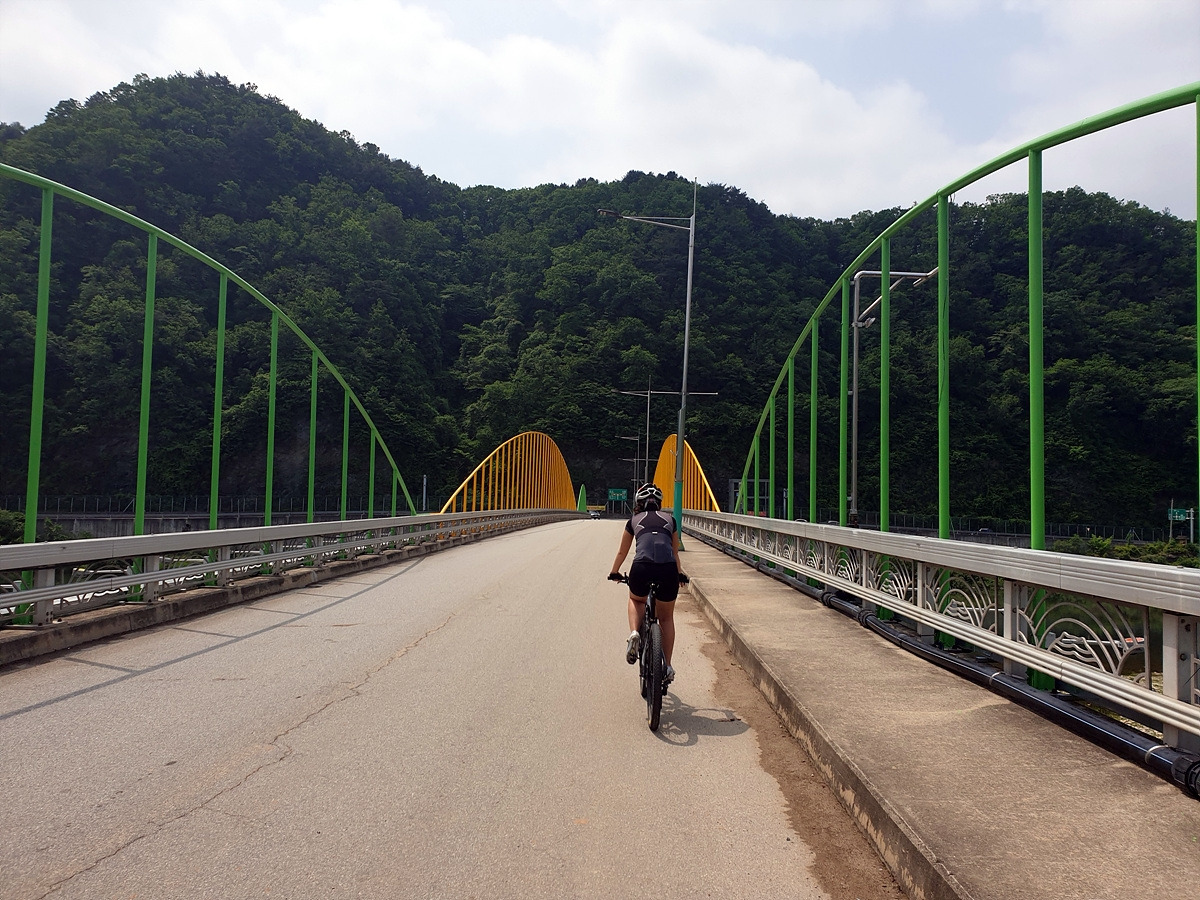이제부터 당분간 홍천강을 따라 달린다. 살짝 오르막 내리막이 있는 시멘트 포장길을 달린다. 나무가 울창해지니 홍천강이 잘 보이지 않는 대신 시원한 나무 터널로 달린다.