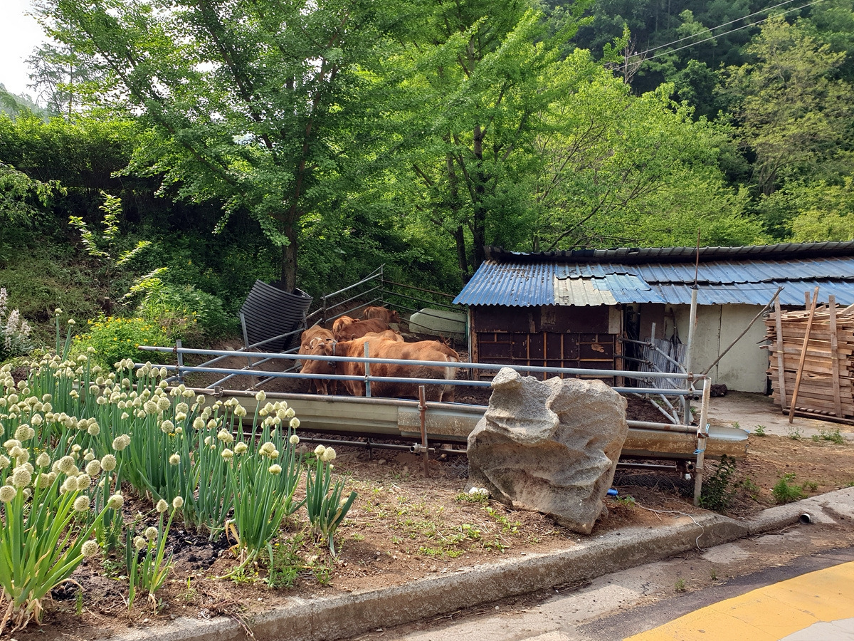 삼거리의 갈림길에 소들이 모인 축사가 있다. 소들이 우리를 물끄러미 쳐다본다.