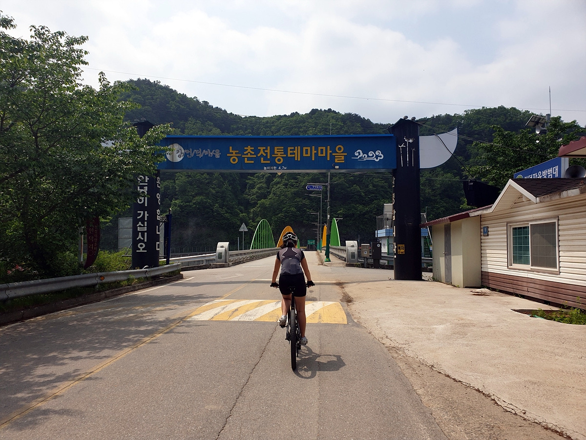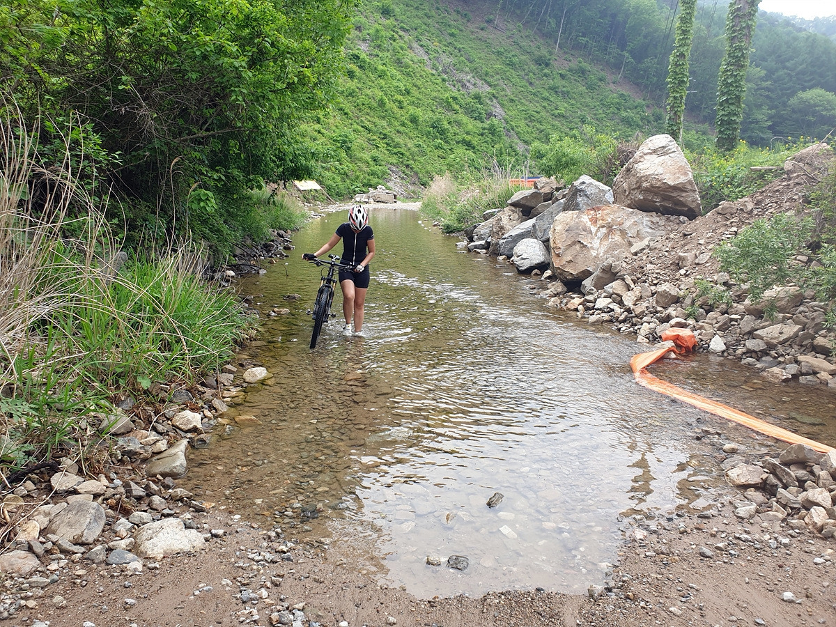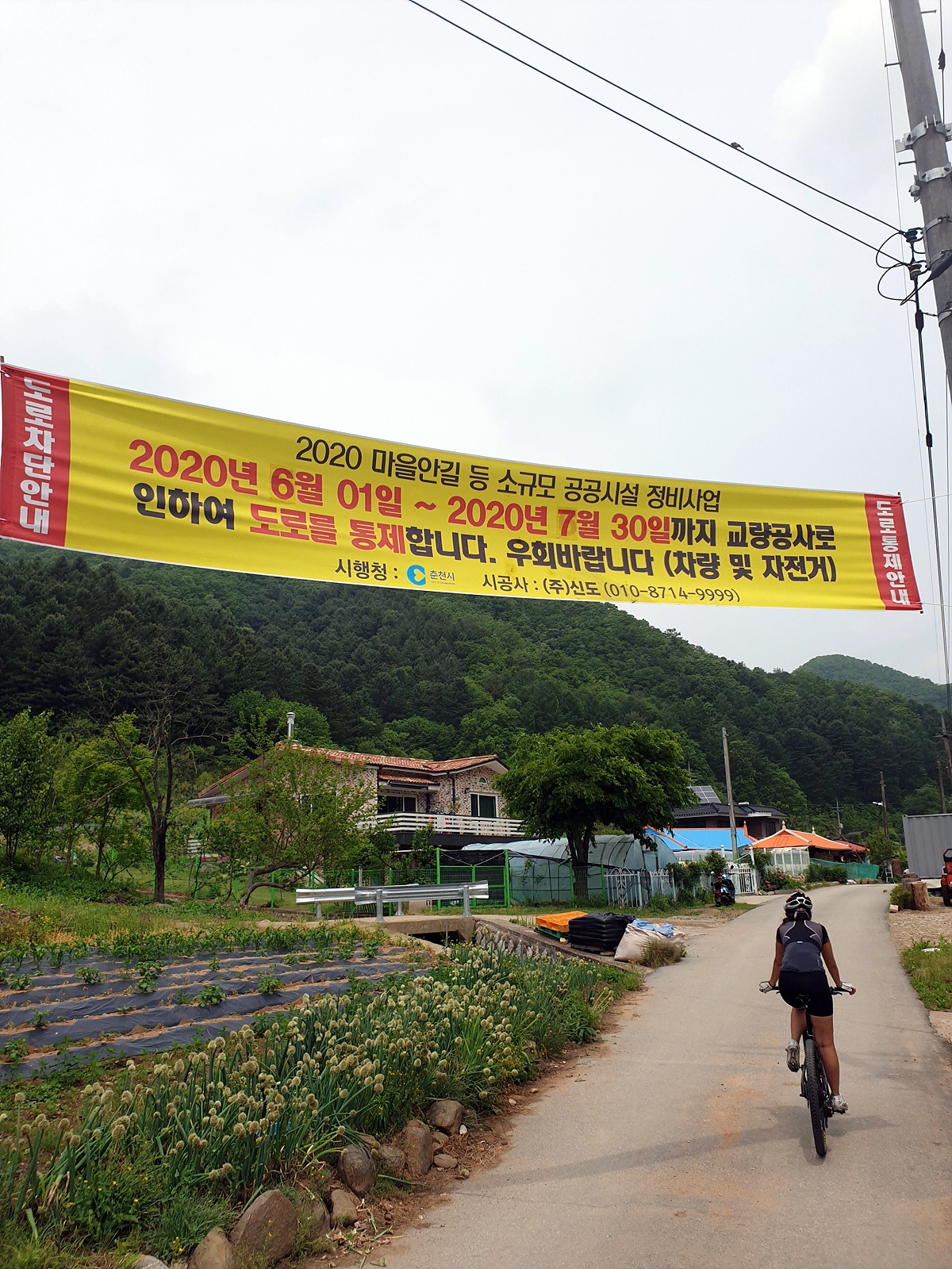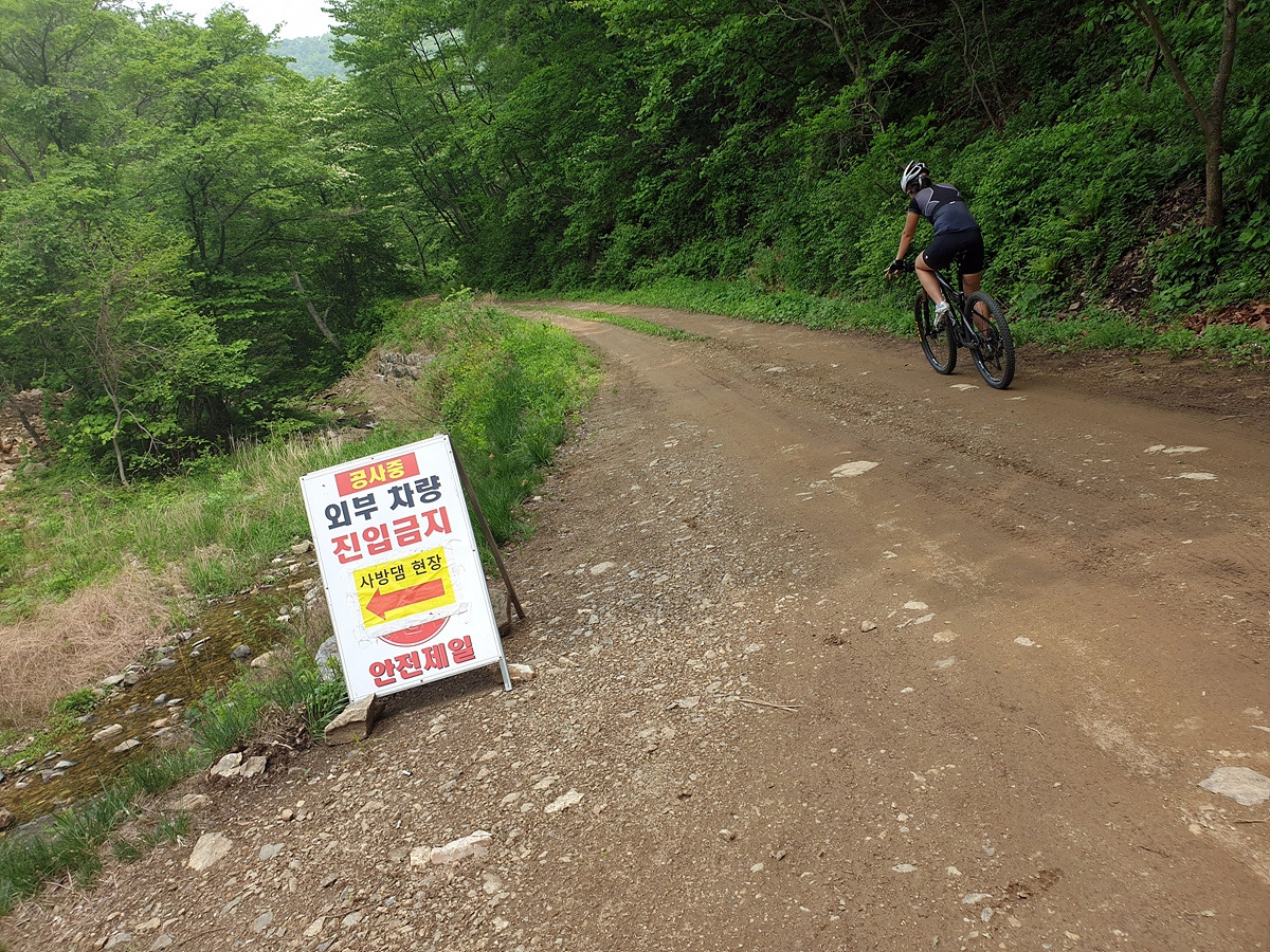 또 도로 통제 안내판이 있다. 여기 구간이 실개천을 자전거를 타고 건너야 하는 곳인데 도로 통제하는 두 달 동안 이곳에 다리를 놓는다고 한다.