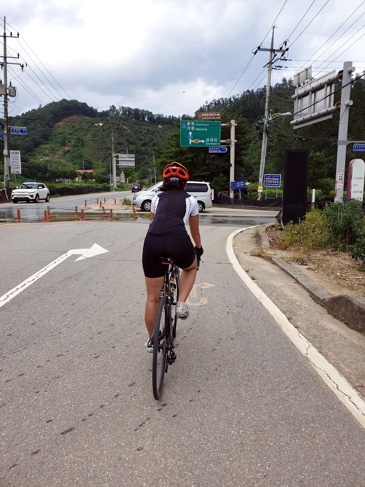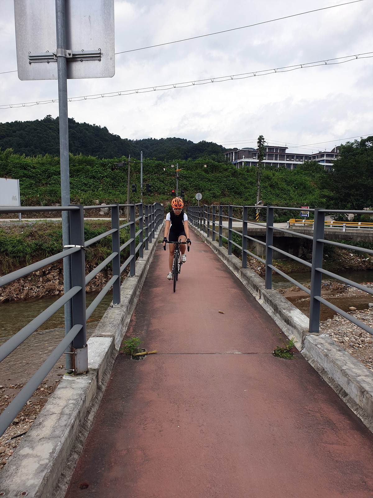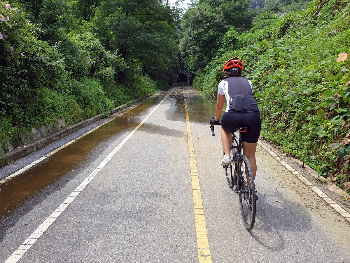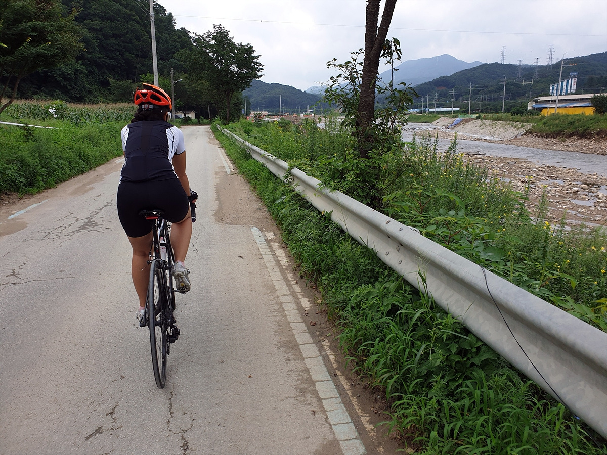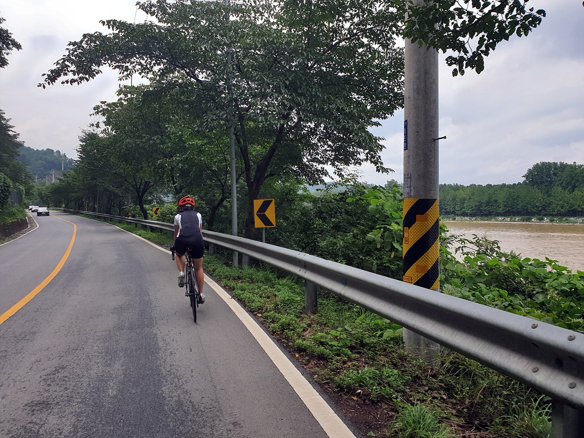 강변을 따라 달리는데 산에서 내려오는 물이 도로로 넘친 곳이 계속 나타난다. 매너 없는 차가 고속으로 지나가서 물벼락을 살짝 맞기도 하고 자전거 바퀴에서 튄 물이 등을 적신다.
