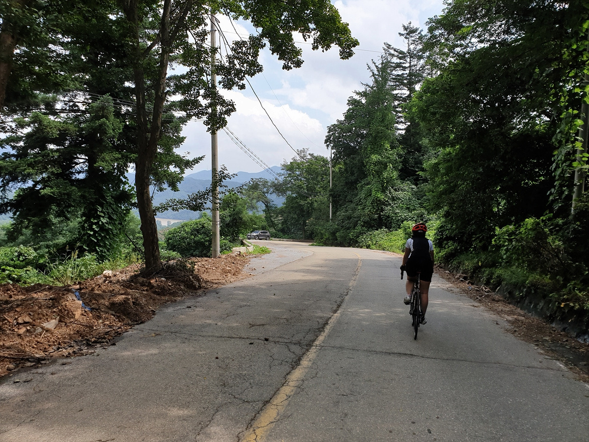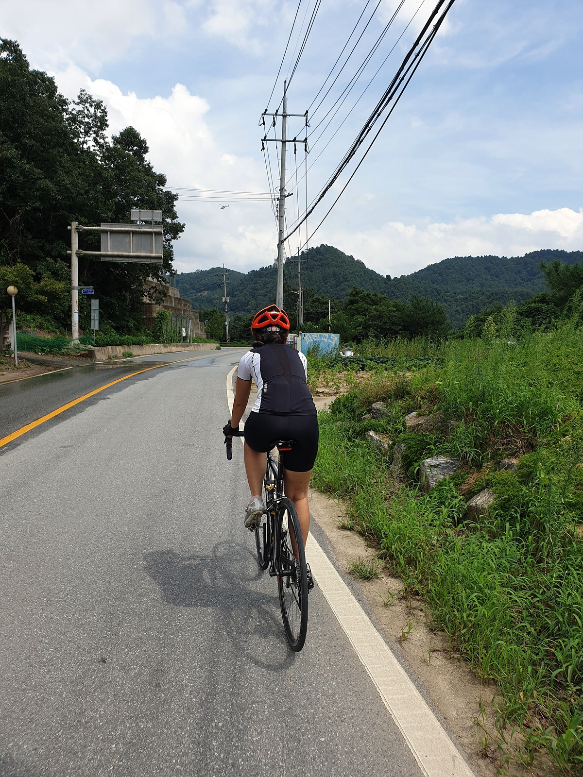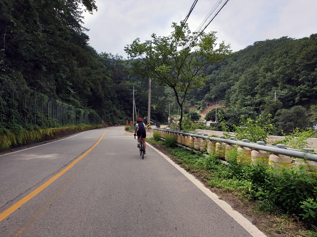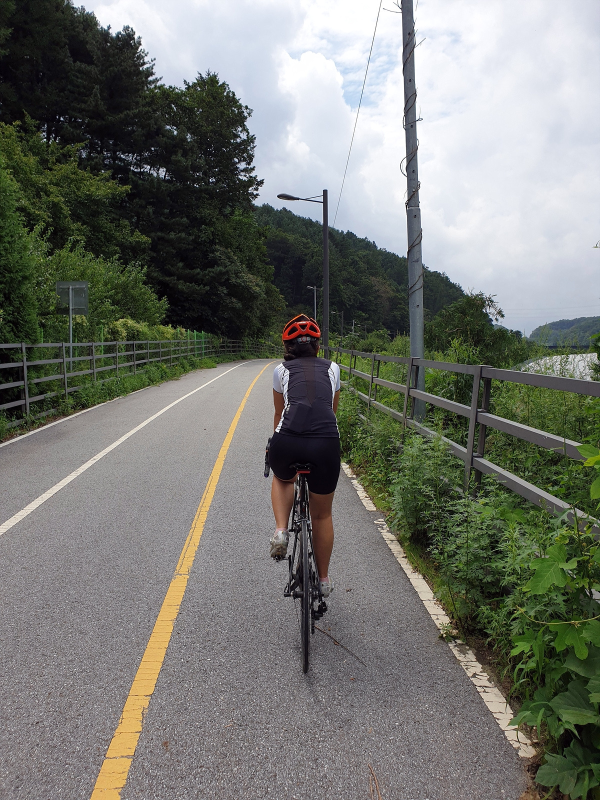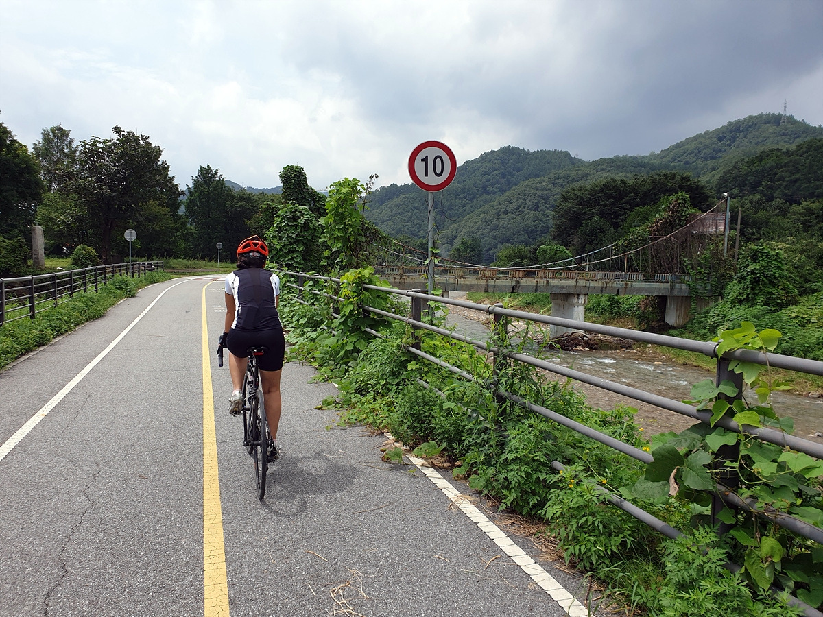 강변을 따라 달리는데 산에서 내려오는 물이 도로로 넘친 곳이 계속 나타난다. 매너 없는 차가 고속으로 지나가서 물벼락을 살짝 맞기도 하고 자전거 바퀴에서 튄 물이 등을 적신다.