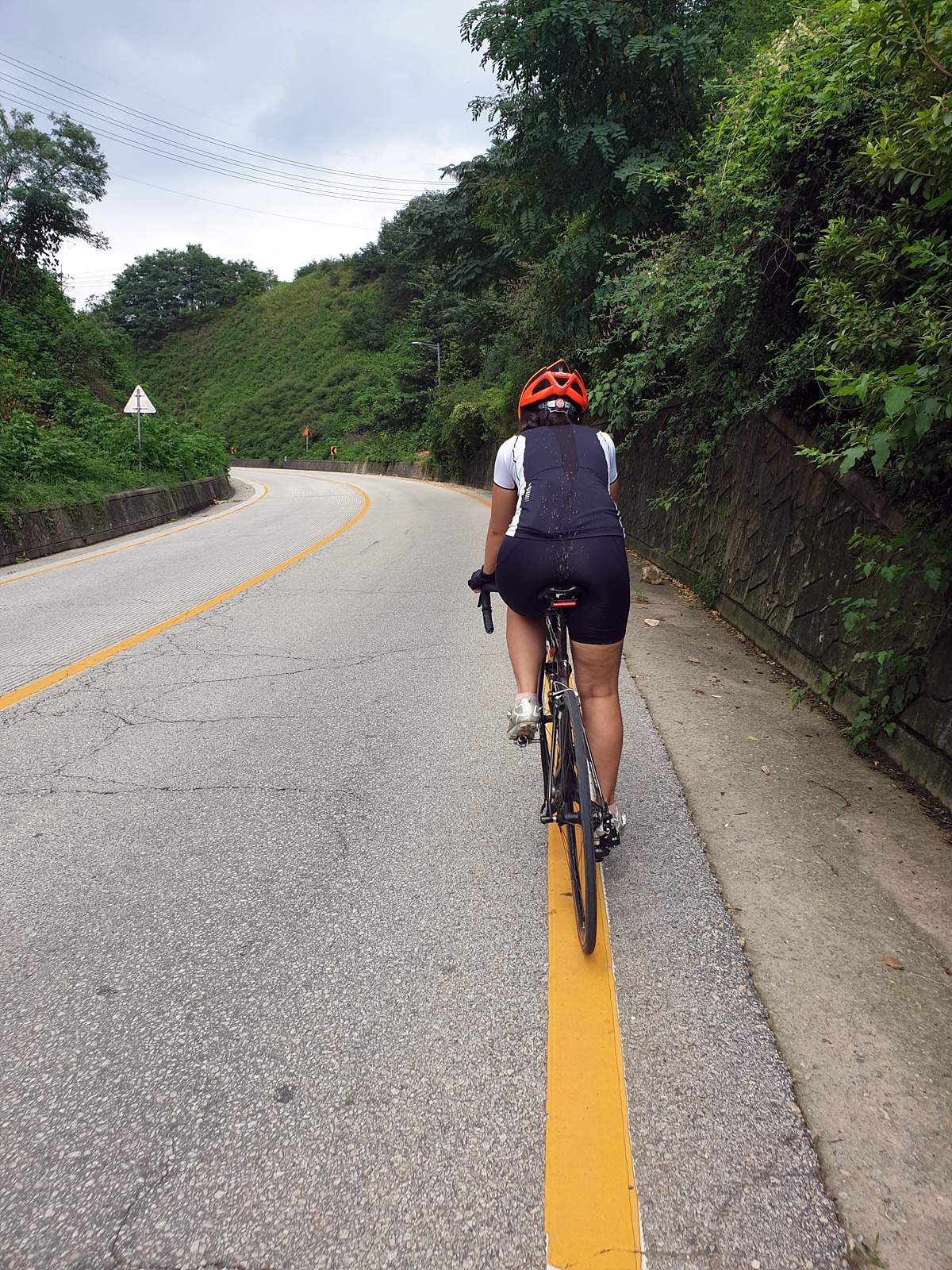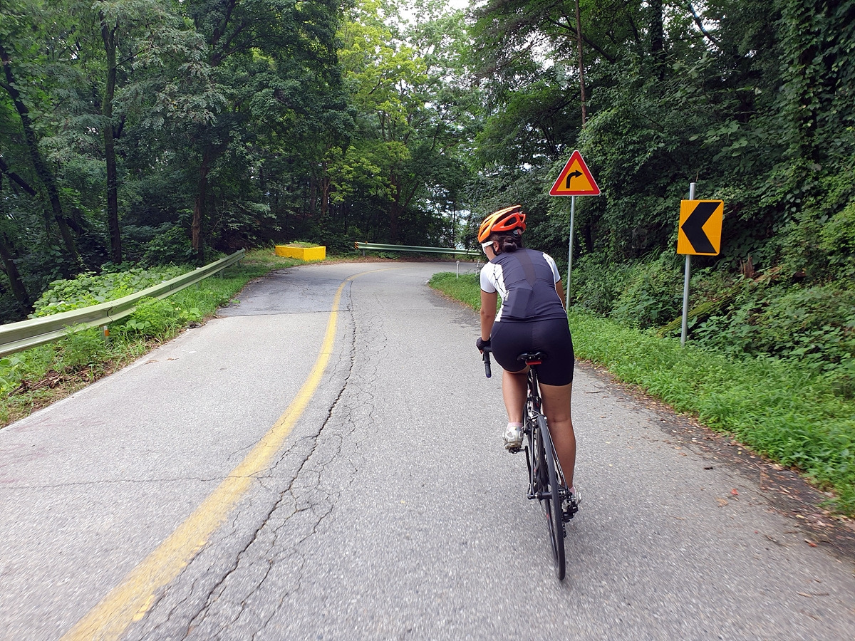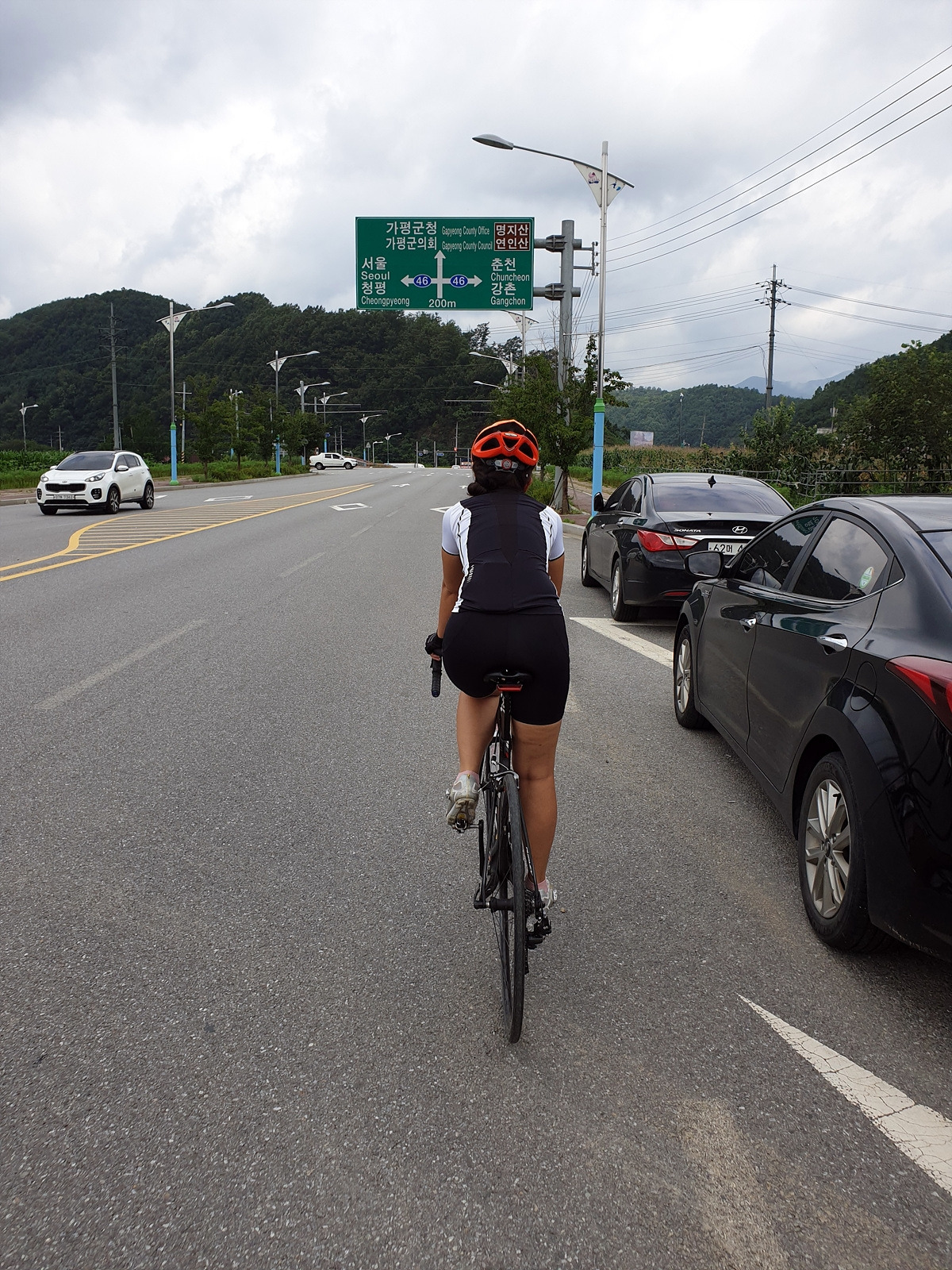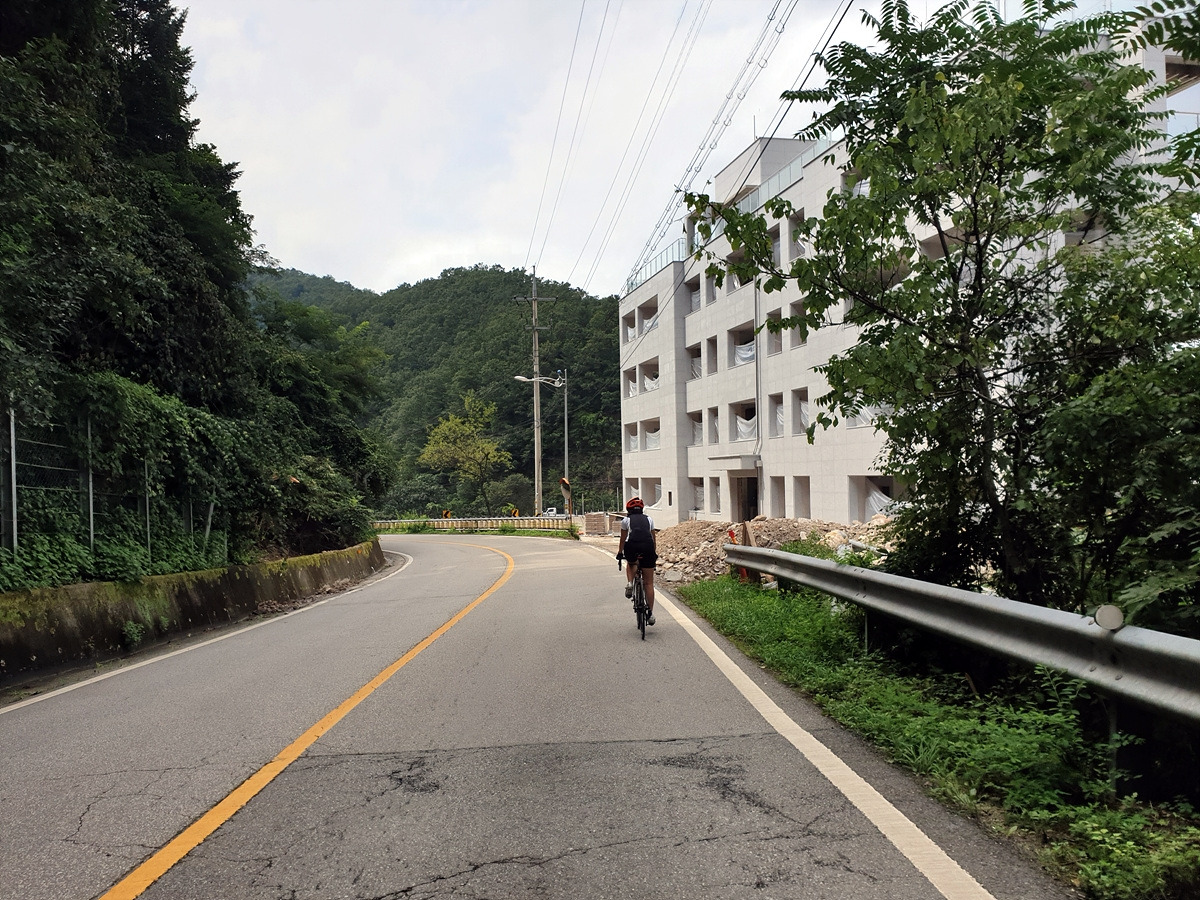 강변을 따라 달리는데 산에서 내려오는 물이 도로로 넘친 곳이 계속 나타난다. 매너 없는 차가 고속으로 지나가서 물벼락을 살짝 맞기도 하고 자전거 바퀴에서 튄 물이 등을 적신다.