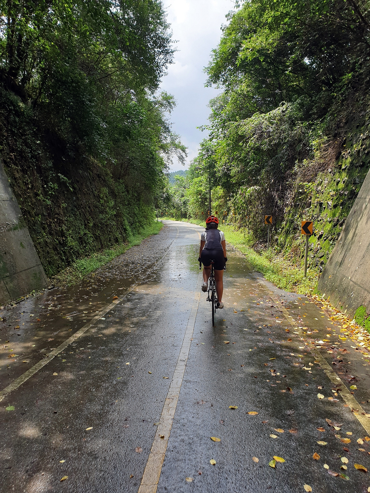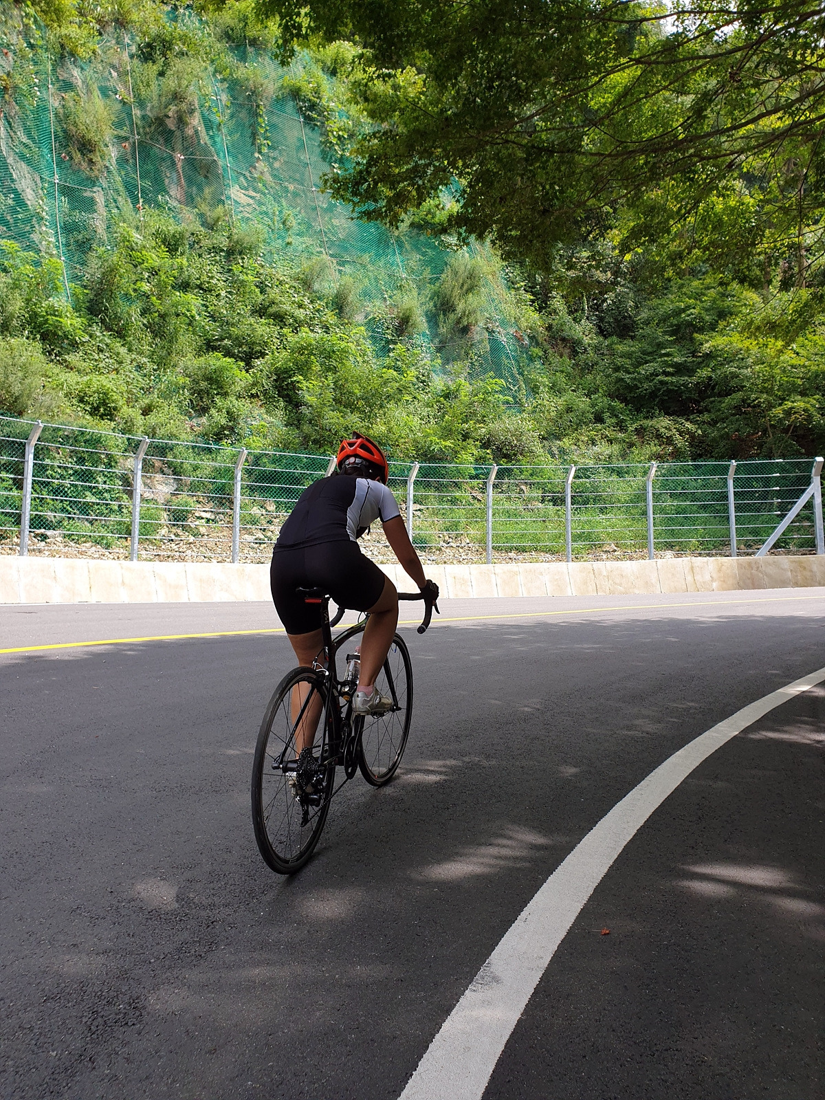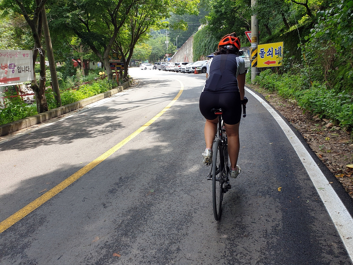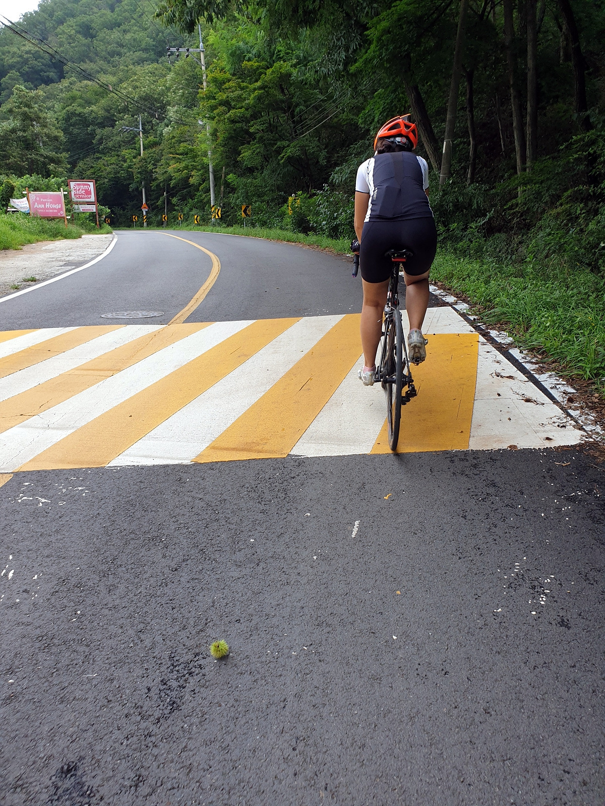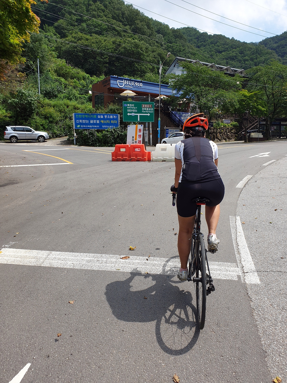 강변을 따라 달리는데 산에서 내려오는 물이 도로로 넘친 곳이 계속 나타난다. 매너 없는 차가 고속으로 지나가서 물벼락을 살짝 맞기도 하고 자전거 바퀴에서 튄 물이 등을 적신다.