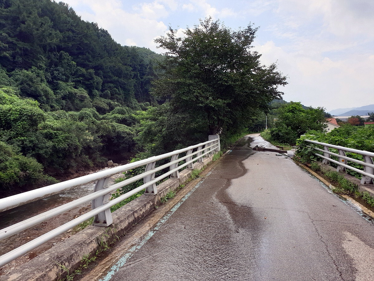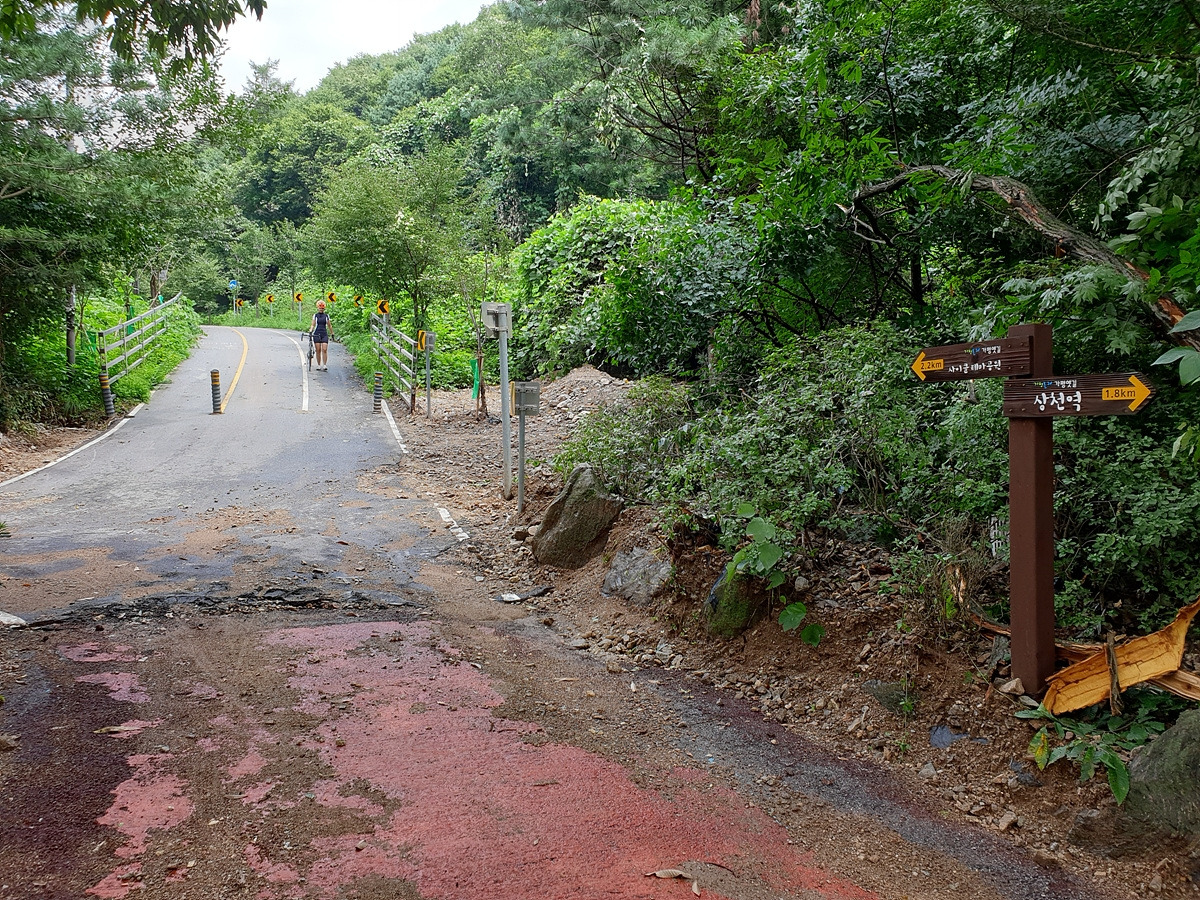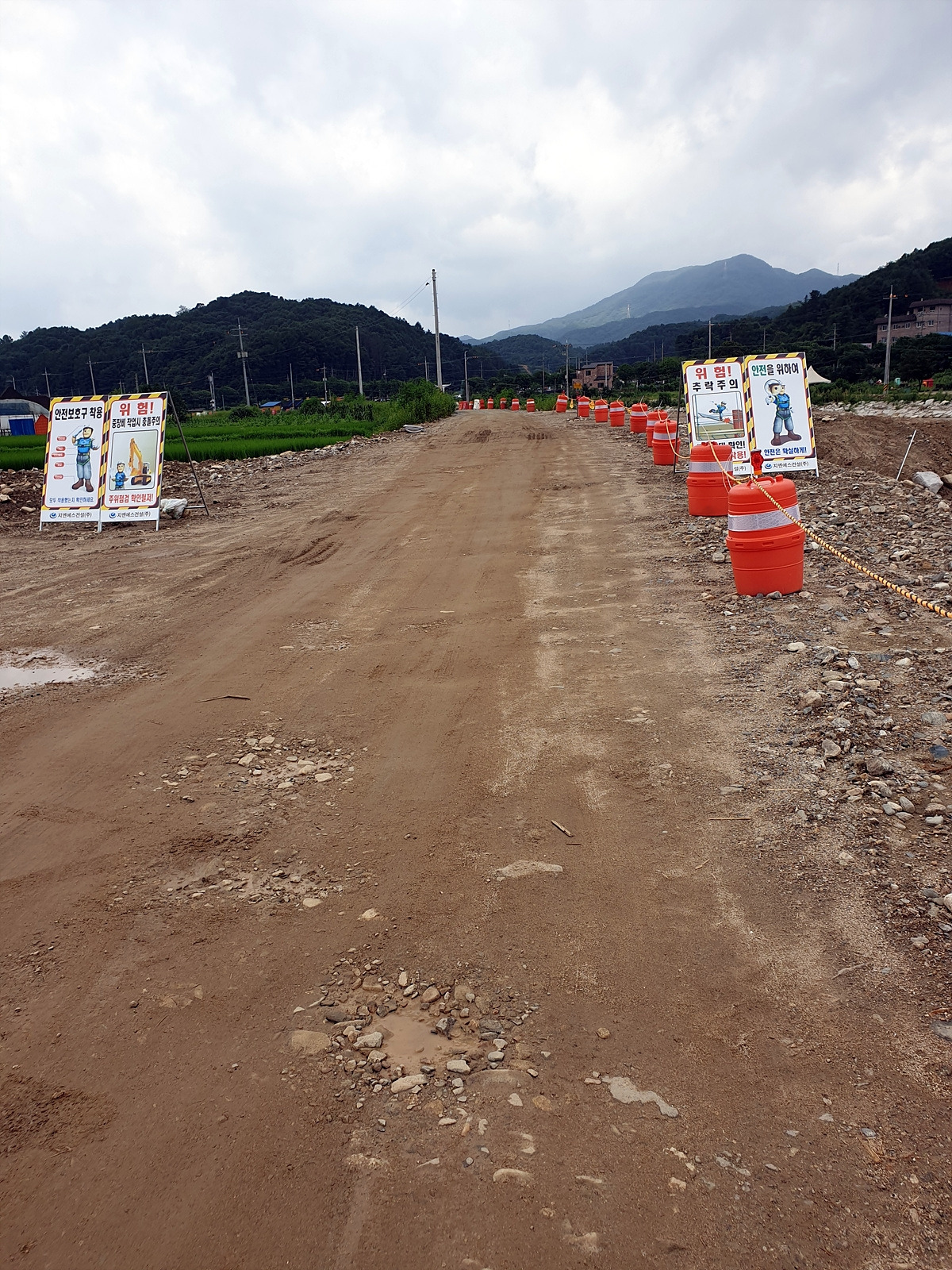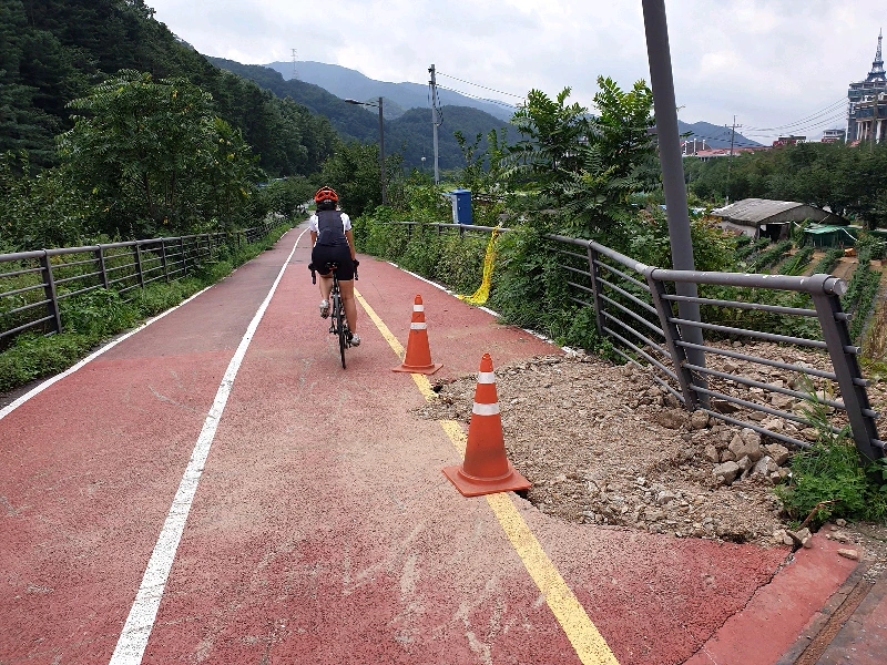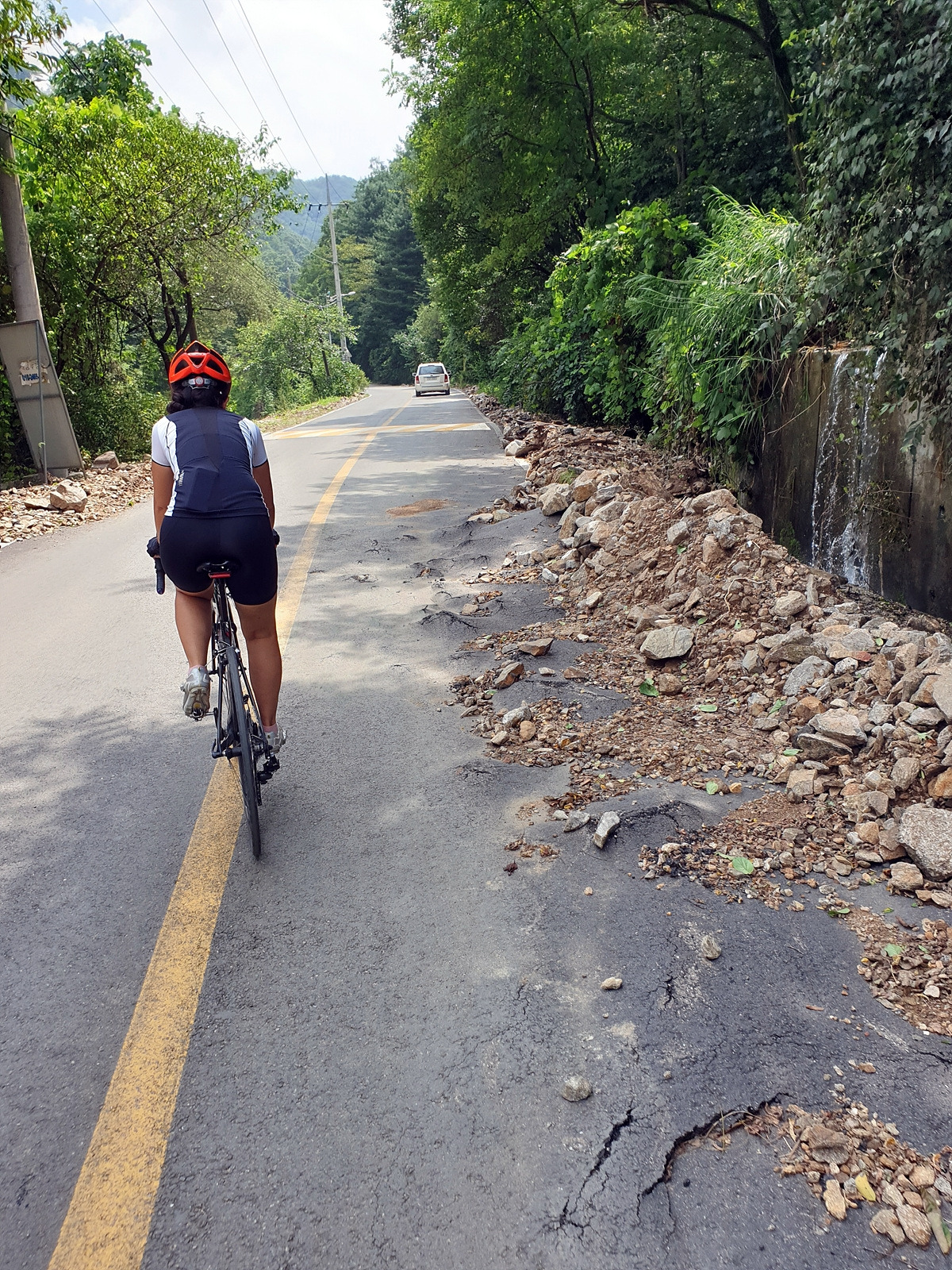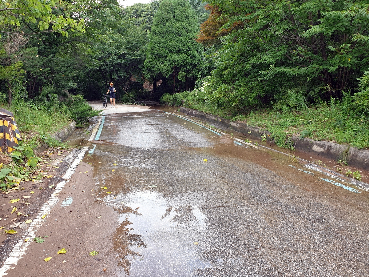 도로 곳곳에 장마로 망가진 흔적들이 있다. 여기저기 물까지 넘쳐서 흐른다.