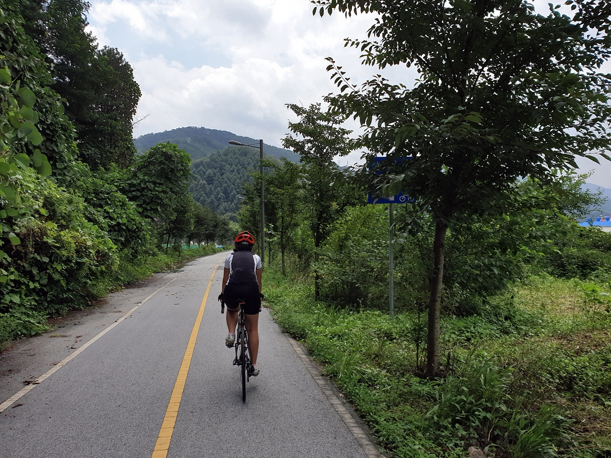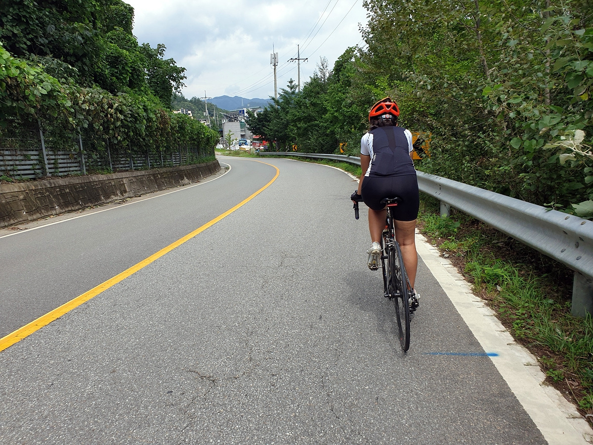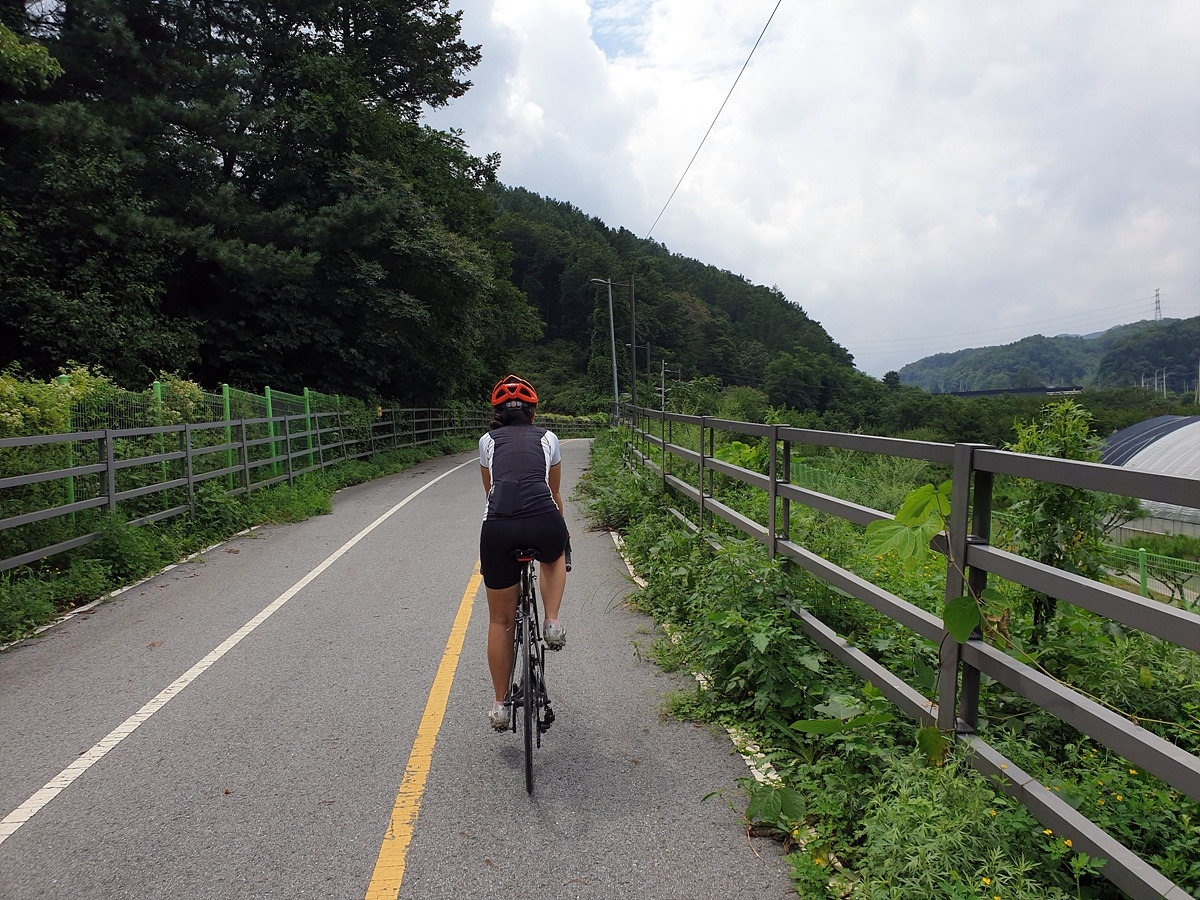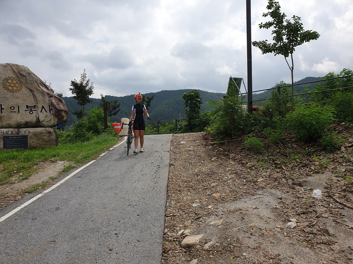 상천역에서 조금 더 내려가니 맞은편에서 오는 자전거 커플이 자전거길이 완전히 무너져 없다고 얘기해준다. 그 커플은 복잡한 46번 도로로 가고 우리는 혼잡한 길이 싫으니 호명산을 넘어가기로 한다.