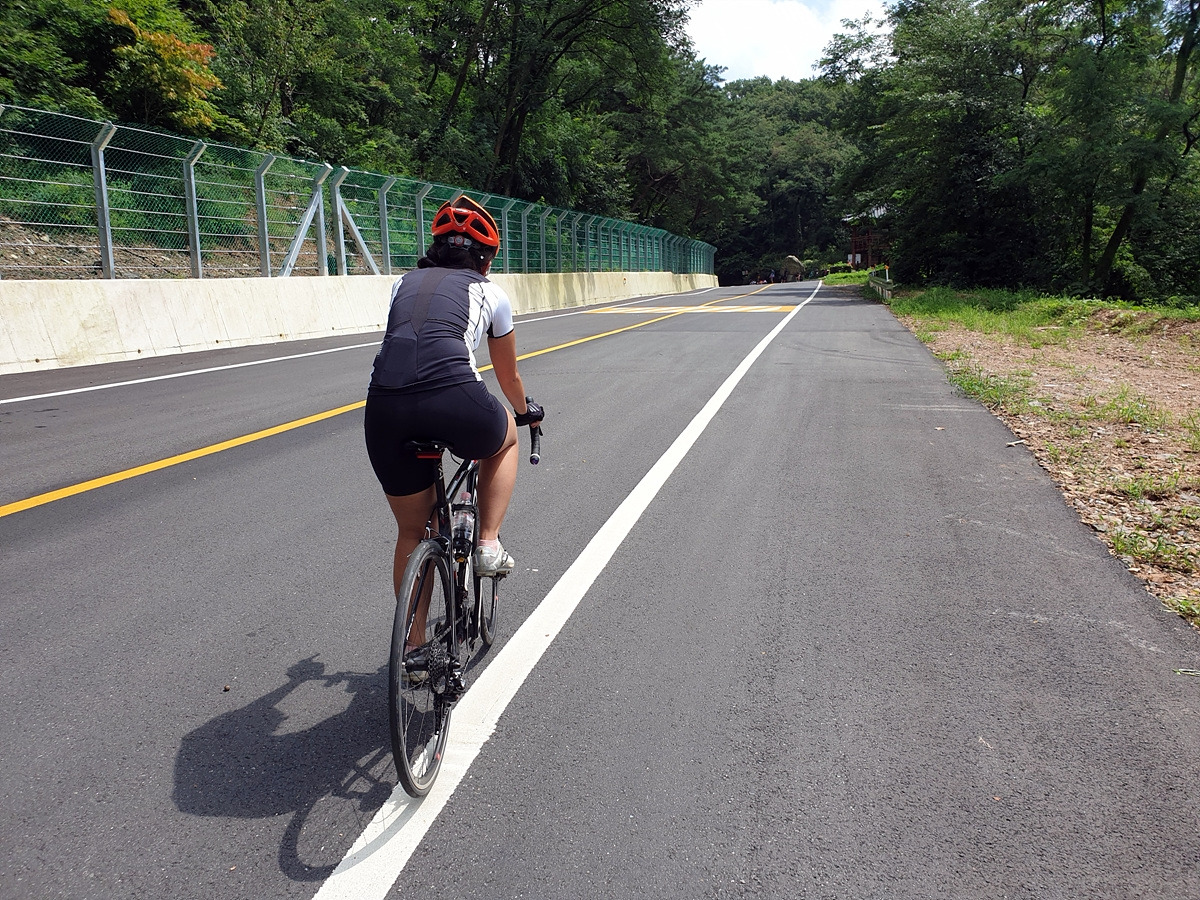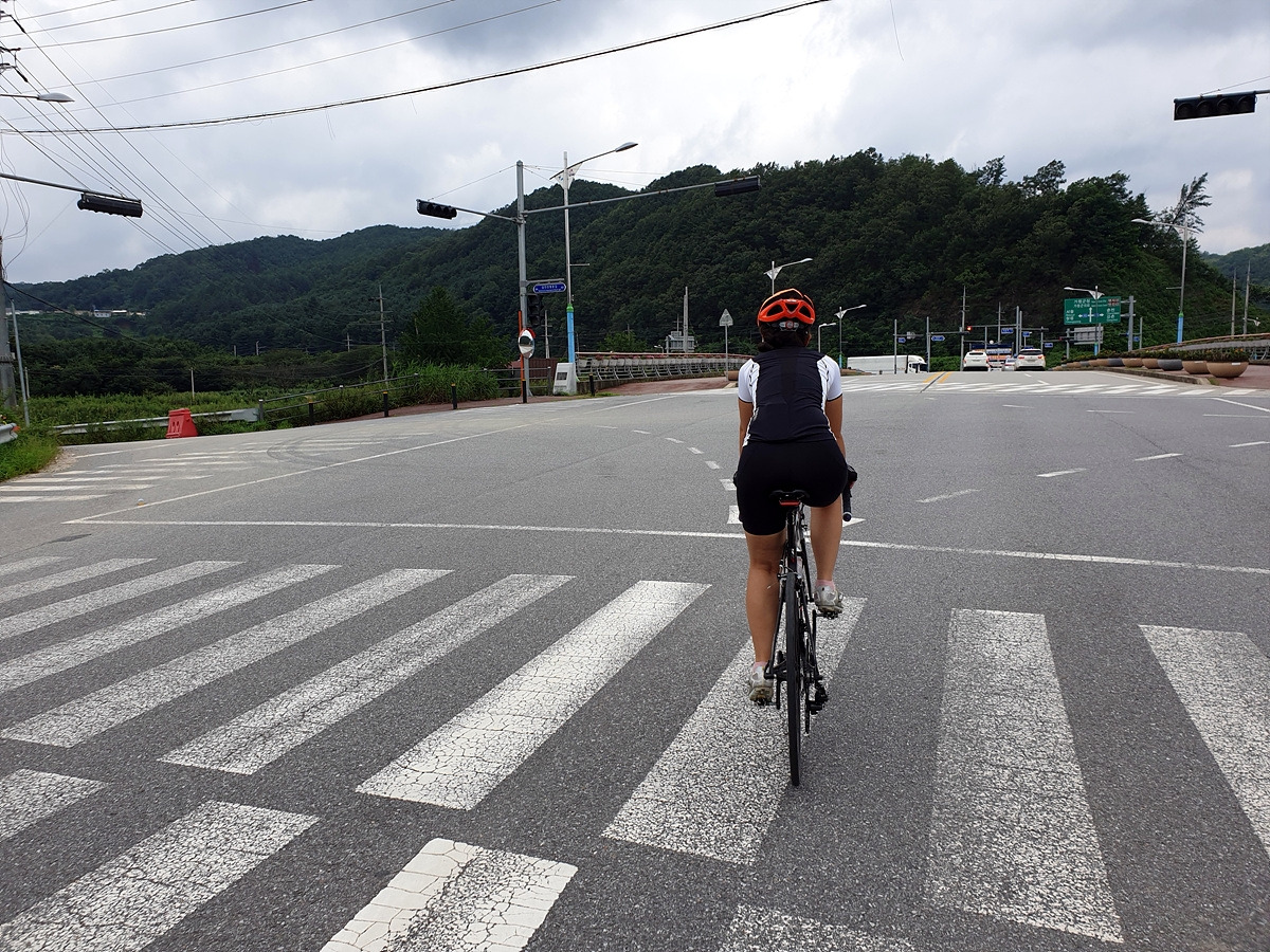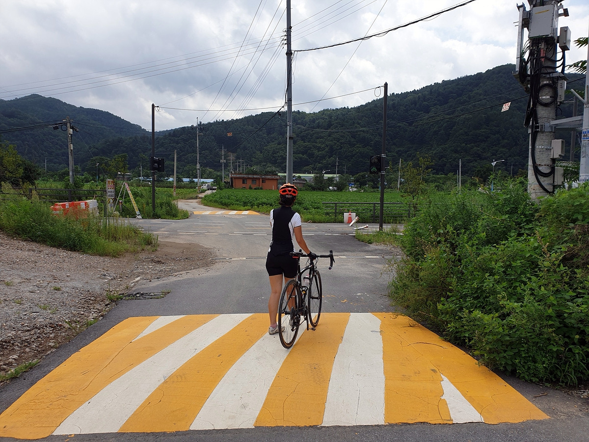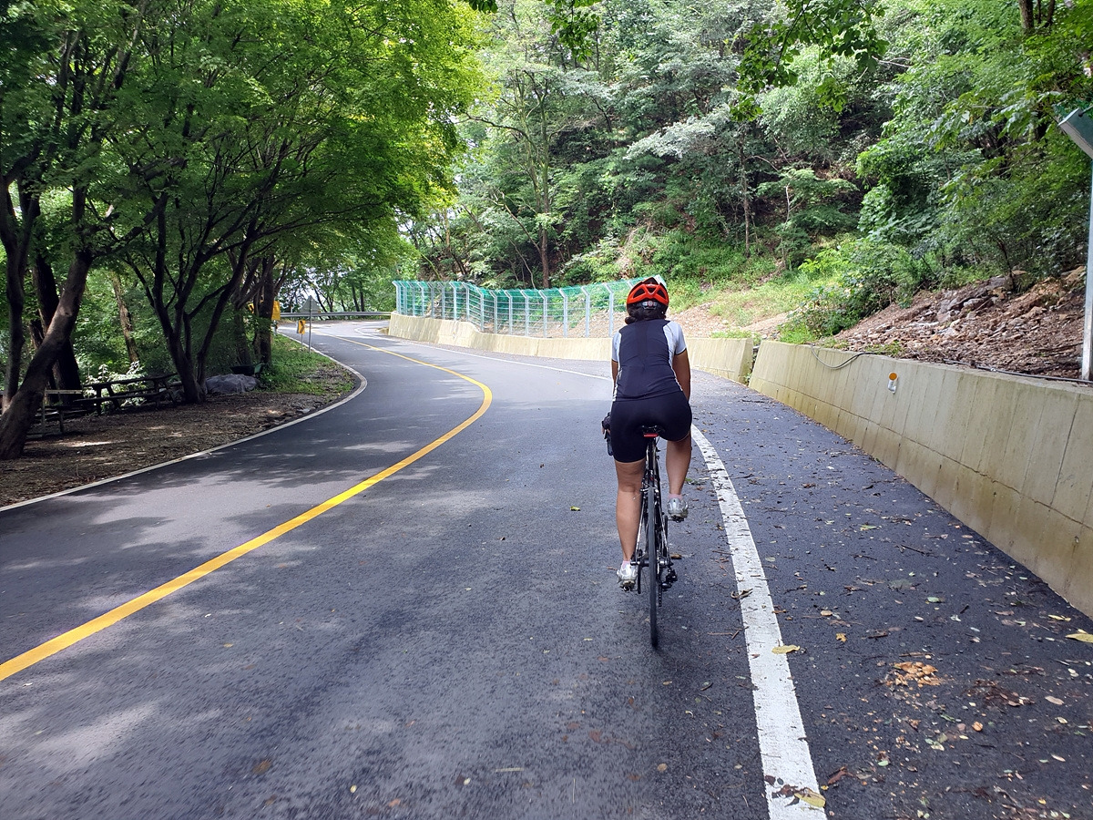 상천역에서 조금 더 내려가니 맞은편에서 오는 자전거 커플이 자전거길이 완전히 무너져 없다고 얘기해준다. 그 커플은 복잡한 46번 도로로 가고 우리는 혼잡한 길이 싫으니 호명산을 넘어가기로 한다.