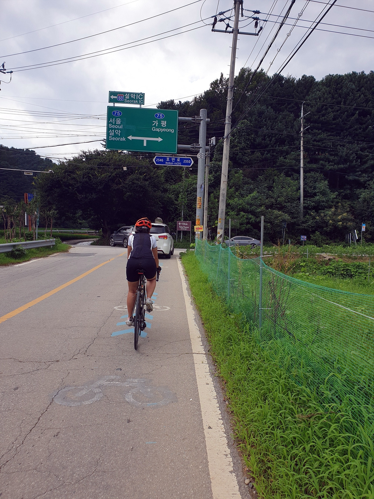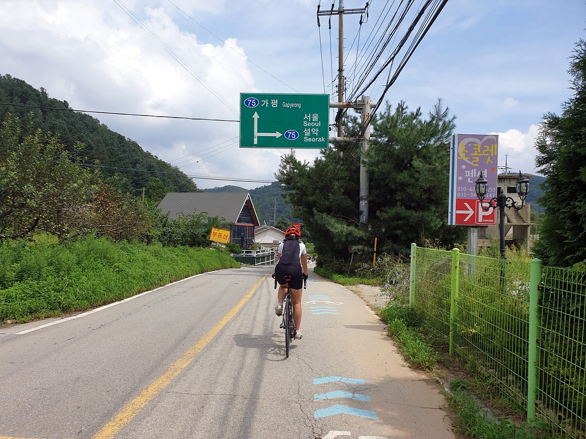 주차장에서 가평읍내 쪽으로 출발하자마자 자전거길 표시를 따라 들어간다.
