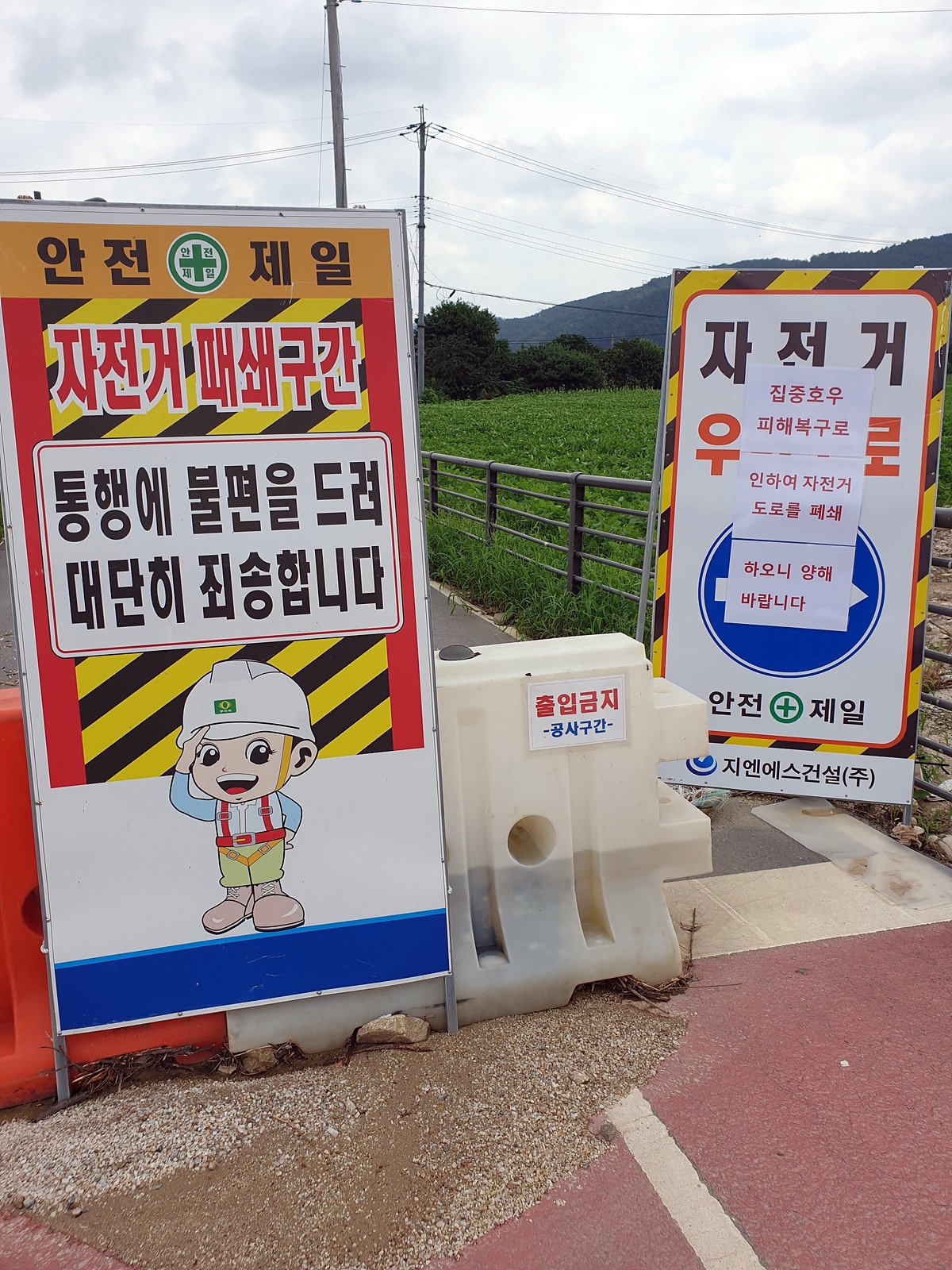 달전천만 초토화된 것은 아니었다. 자전거길도 파손되어 이렇게 공사 중이다.