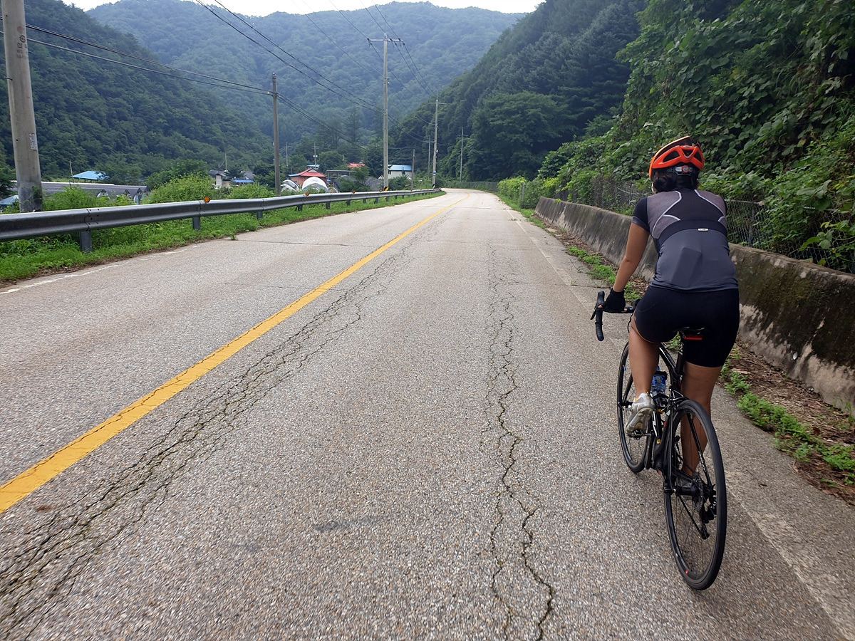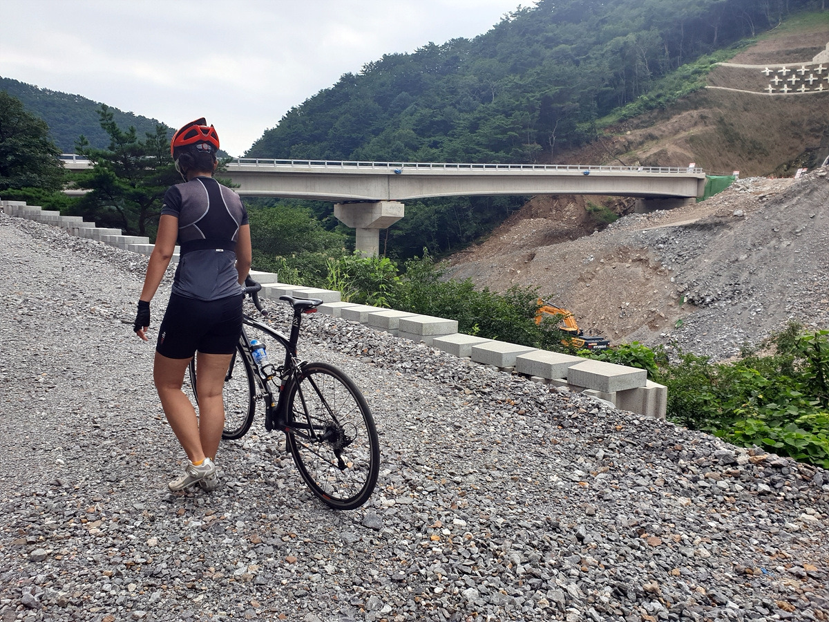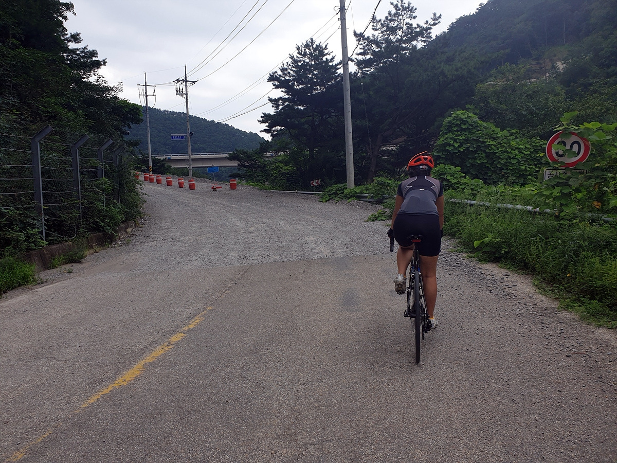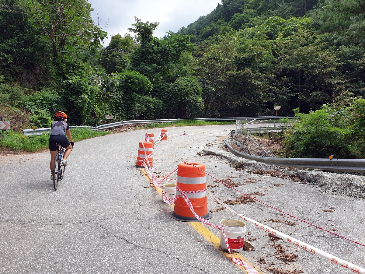 내려가다 보면 이번 장마에 망가진 구간도 있다.장마나 태풍 같은 큰 비가 지나간 다음에는 망가지는 도로가 많기 때문에 자전거를 탈 때 좀 더 조심해야 한다.
