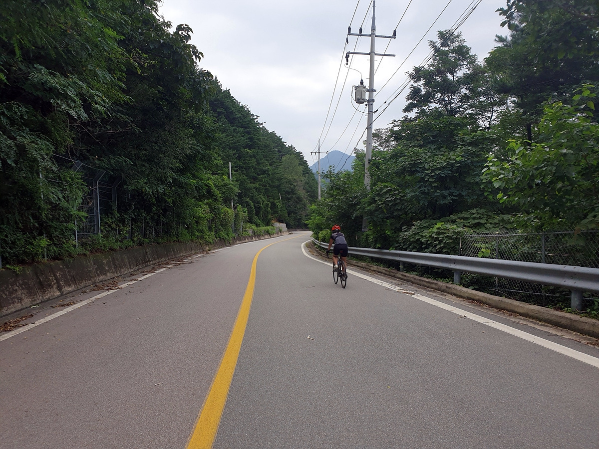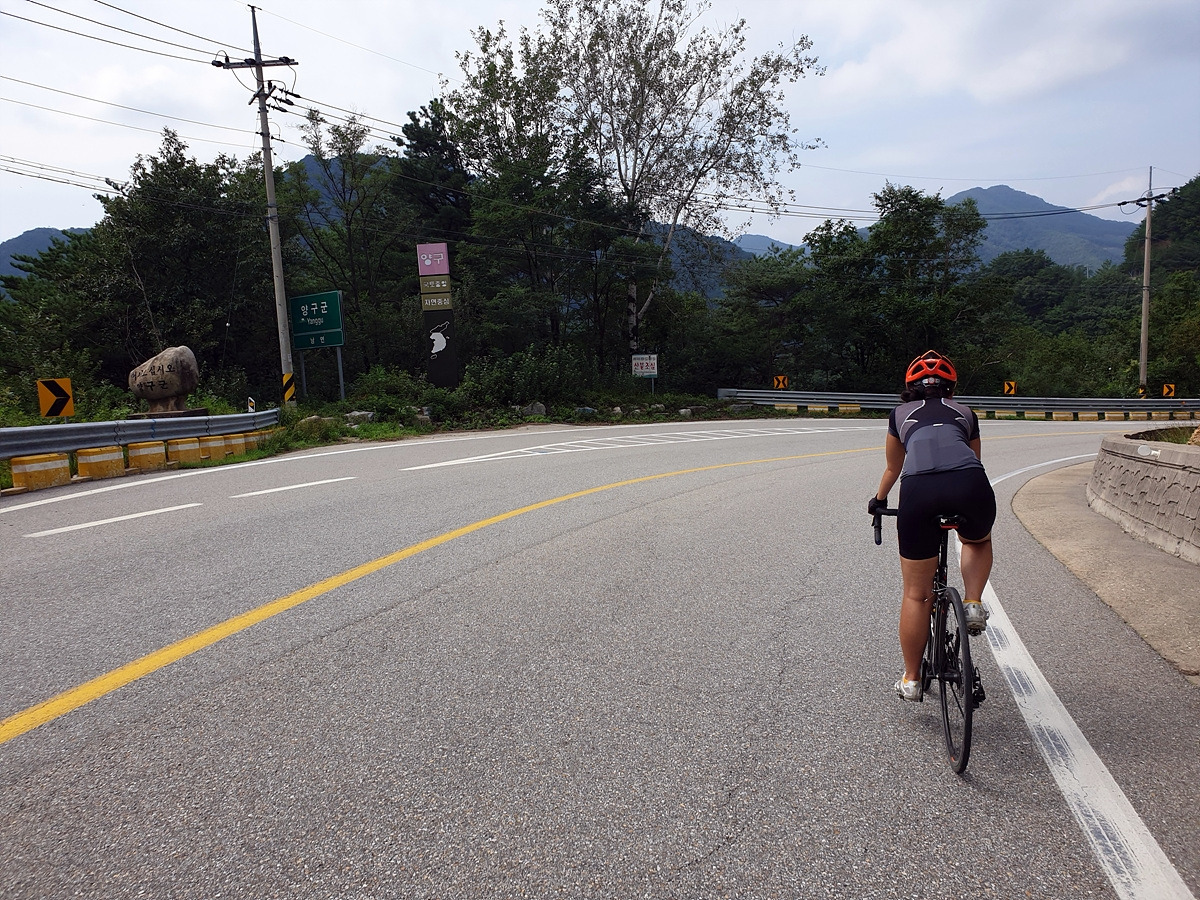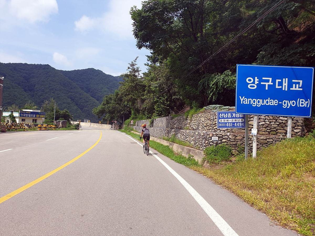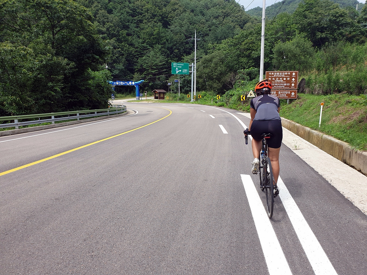 신남에서 양구로 가는 46번 국도를 따라간다. 처음에 양구에서 출발할 때 달리던 그 길이다. 시작하자마자 오르막길이 시작된다.