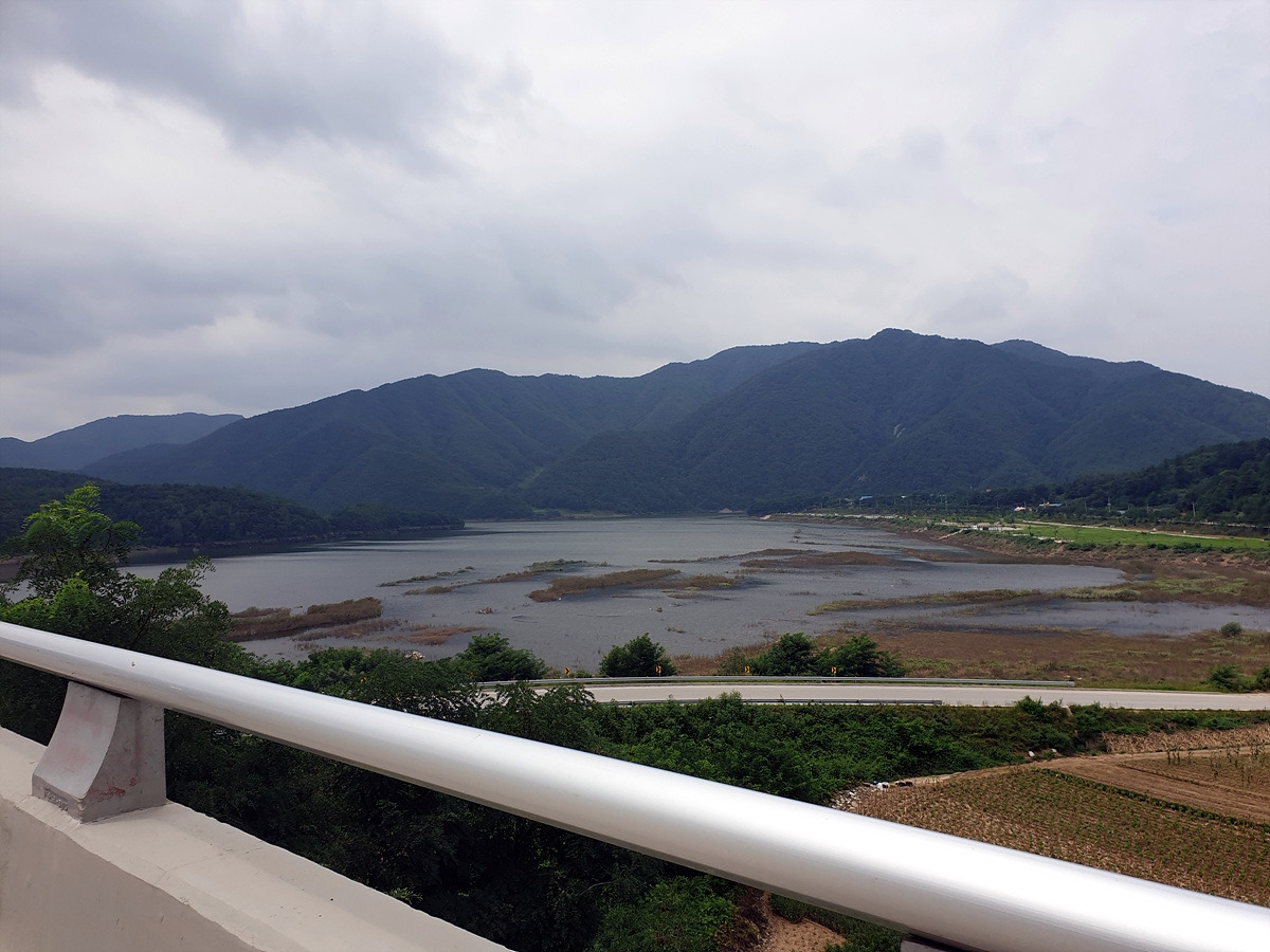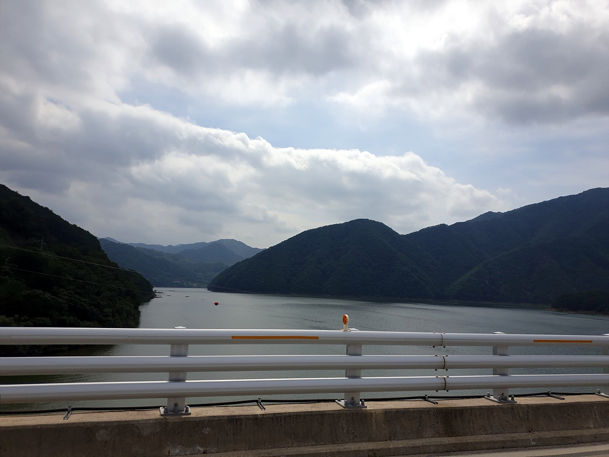 내리막을 쭉 내려가니 소양호가 보인다. 춘천에 있는 소양강댐에 의해 막힌 강물이 이렇게 커다란 호수가 되었다.