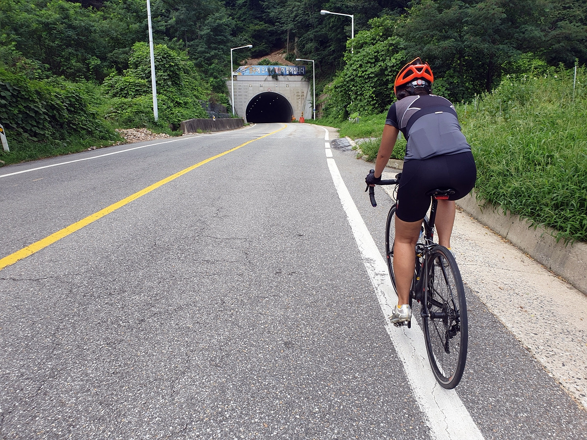 길어 보이던 오르막길의 끝은 터널이다. 양구 여기저기의 터널을 넘나들었는데 양구터널이 안 보였는데 생뚱맞게 여기에 있다. 아까 두무동고개와 여기 양구터널의 산자락은 모두 도솔지맥으로 이 산줄기는 북한 금강산에서 시작하여 양구 해안면으로 갈 때 넘었던 도솔산을 거쳐 춘천 우두동의 작은 뒷산인 우두산까지 이어진다고 한다.