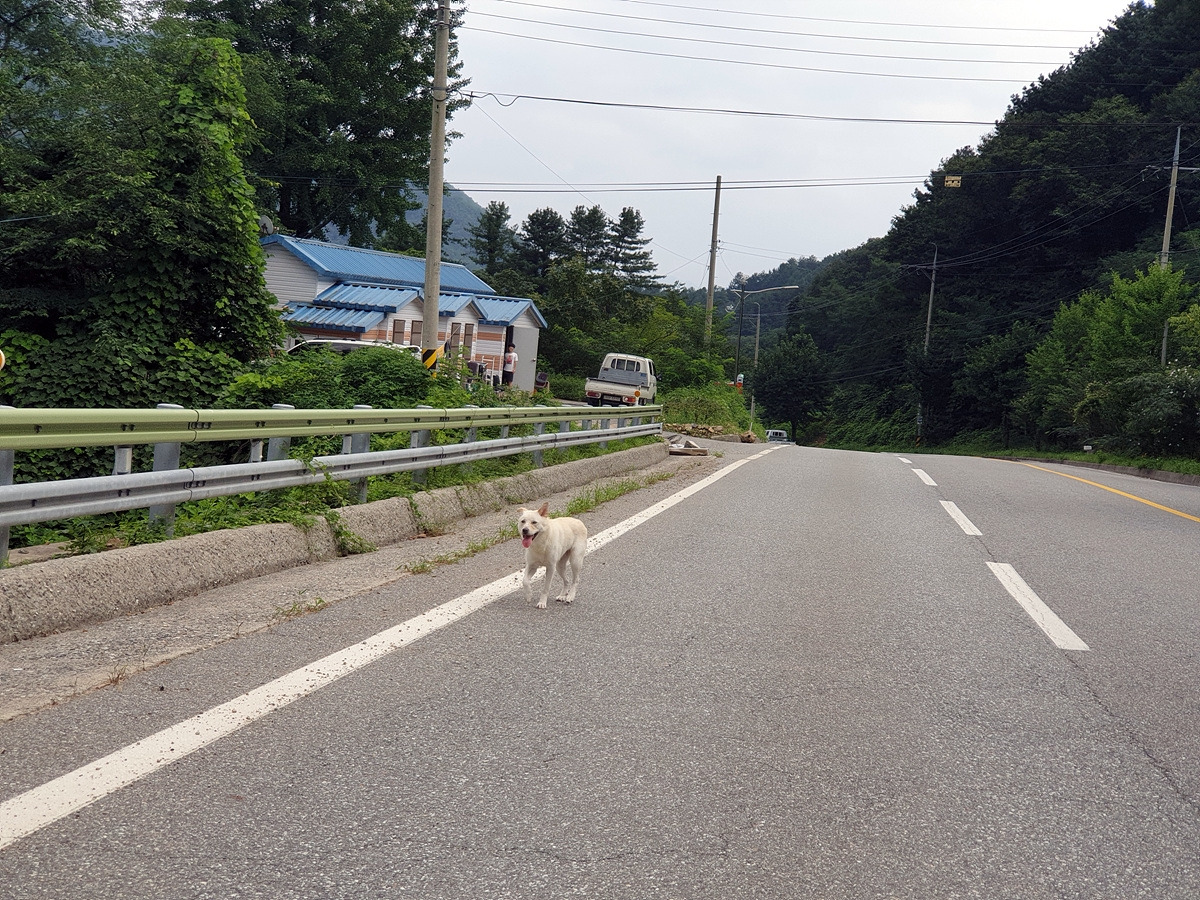 주인하고 같이 산책 나왔던 백구 한 녀석이 우리가 신기한지 자꾸 따라온다. 공격성은 없는 것 같은 게 그저 우리가 신기해서 천천히 따라오다가 멈춰서 한참 쳐다본다.