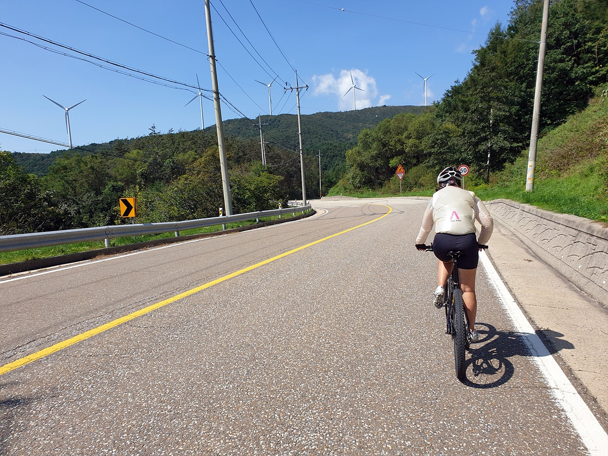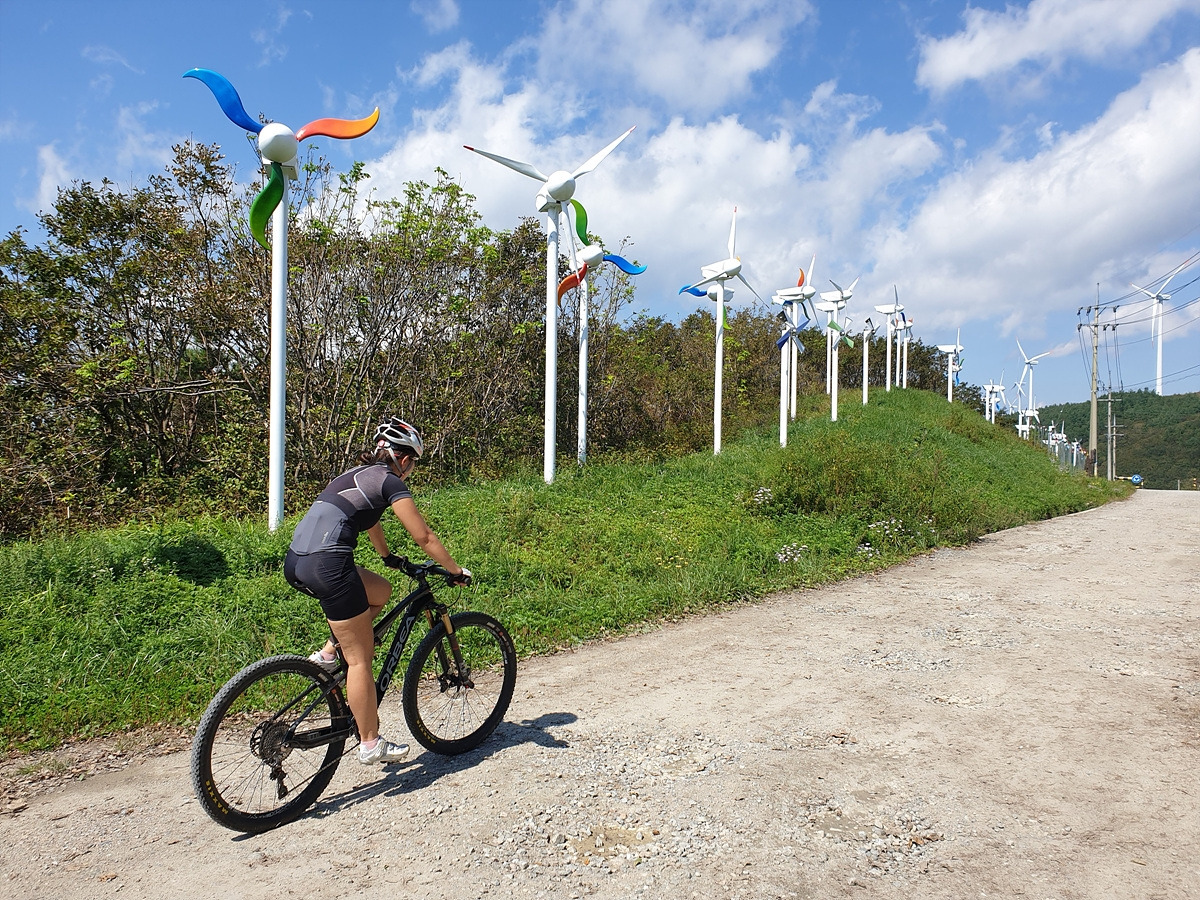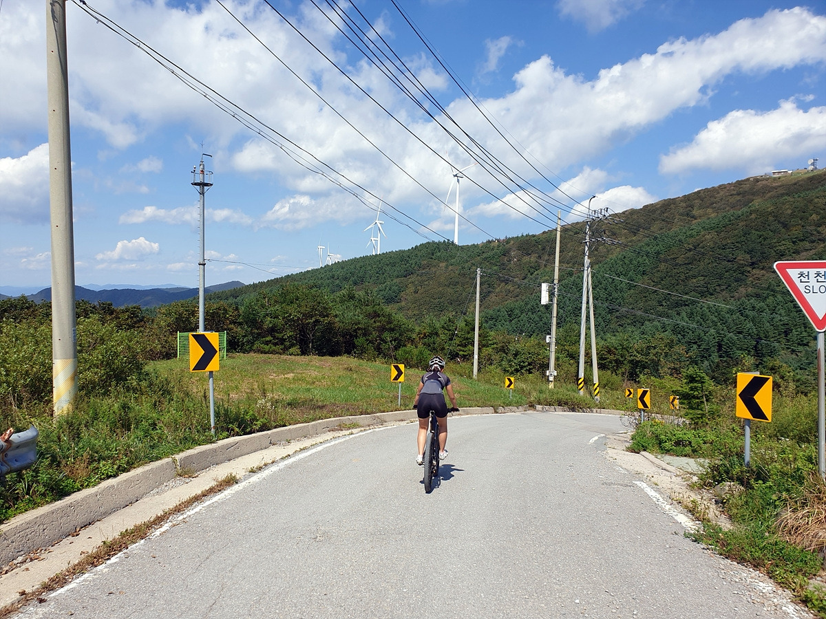 둔내에서 태기산 정상의 풍력발전기들을 보면서 조만간 저기 태기산도 다녀와야지 라고 생각한 김에 이번에 다녀왔다. 여러 코스가 있지만 지니님이 적당히 가볍게 타자고 하여 주변의 임도까지 다니지는 않고 딱 30km만 달리기로 하였다. 오르막길의 대부분은 6번 국도 옛길 포장도로로 올라가고 내려올 때는 비포장길을 위주로 내려오는 쉬운 코스다. 처음에는 둔내에서 출발하려다가 좀 더 편하게 다녀오기 위해 휘닉스파크에서 출발한다.