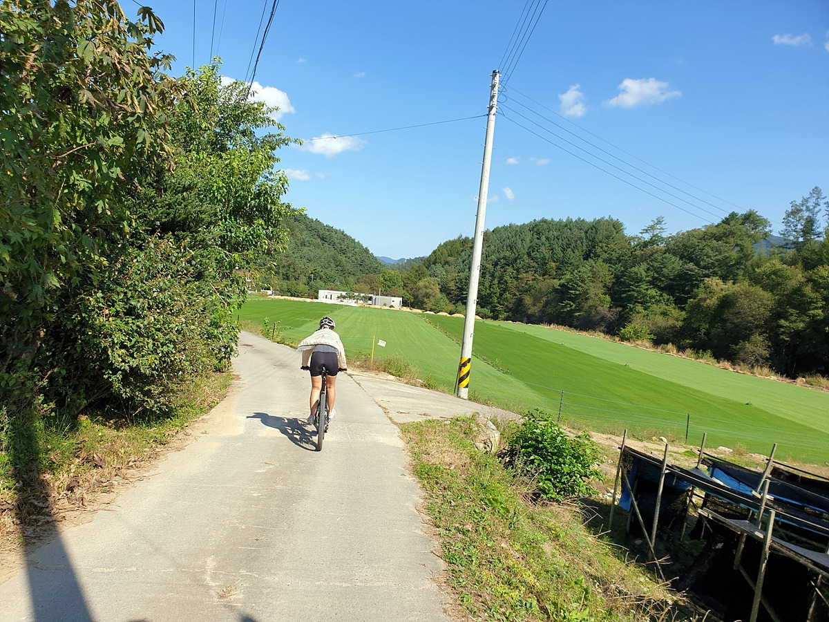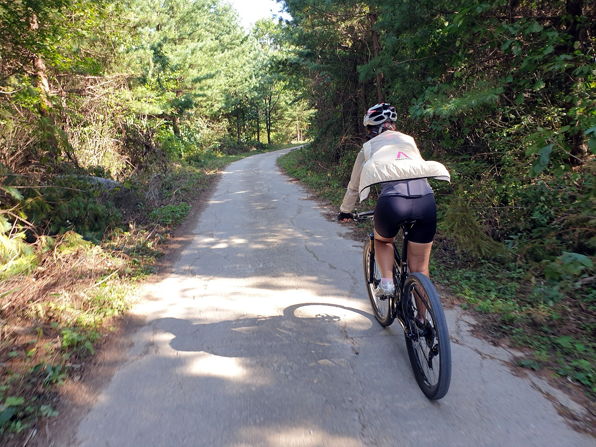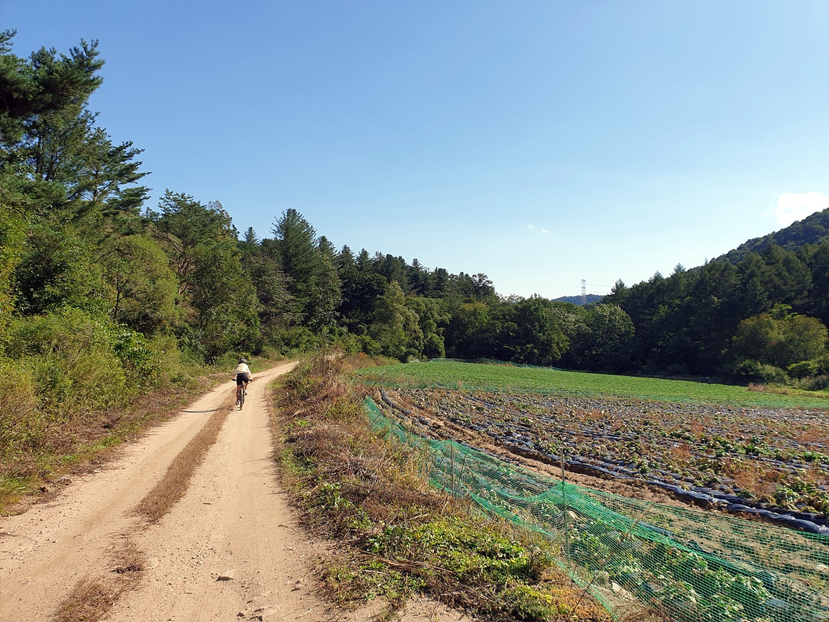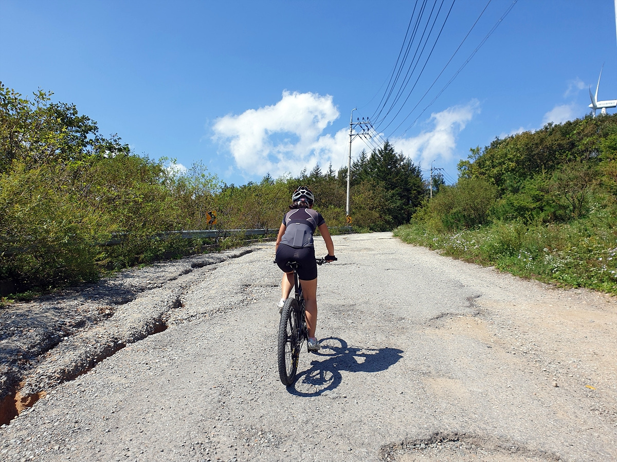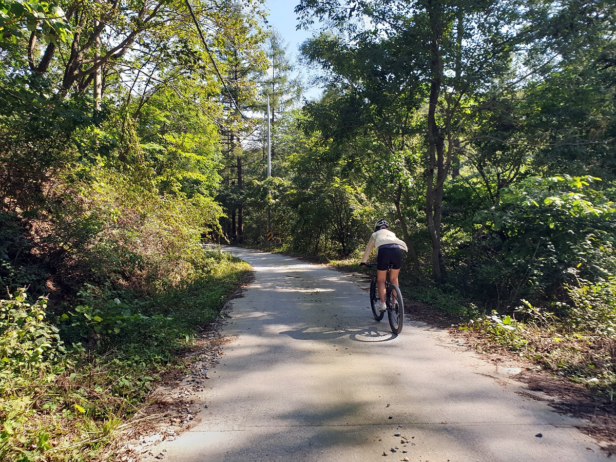 시멘트 포장길과 비포장길이 적절히 섞여있는 길인데 길이 조금 거칠고 물결이 파여 있어 로드바이크로 가기엔 안 좋은 길이지만 산악자전거로는 아주 쉬운 길이다.