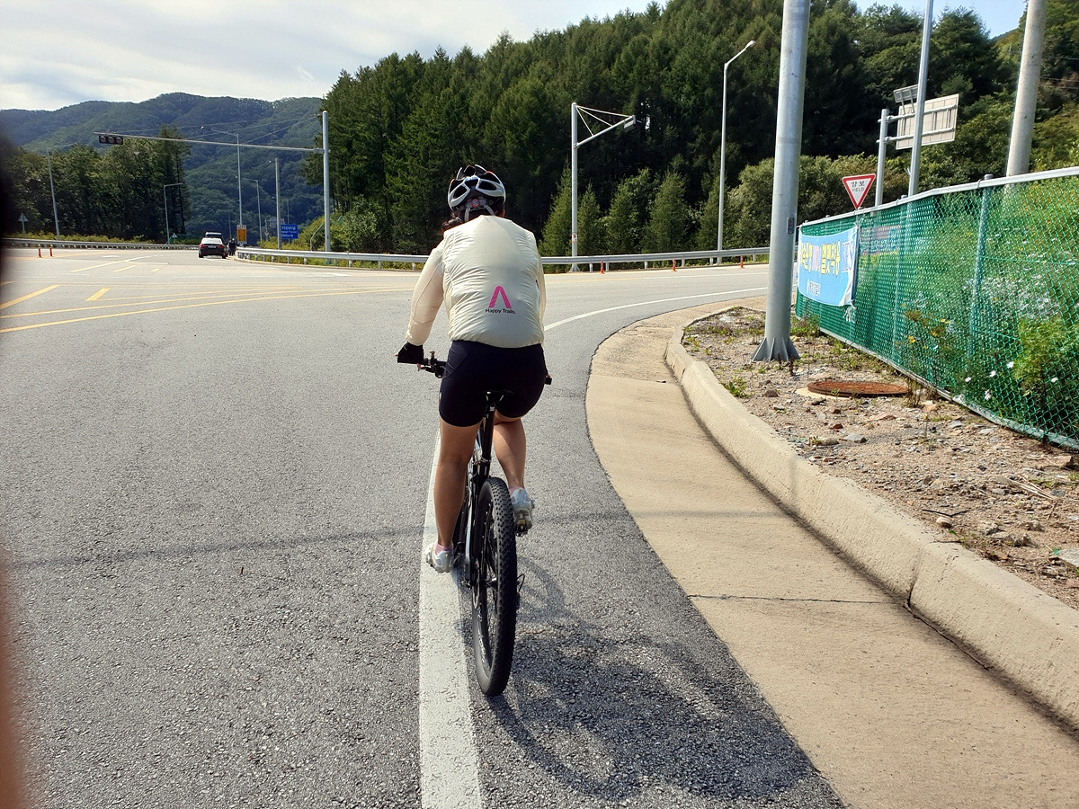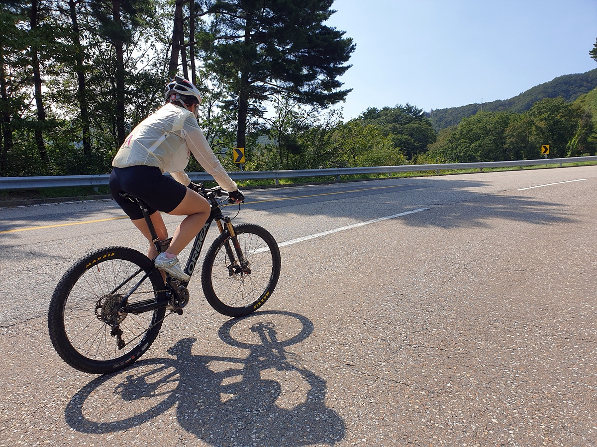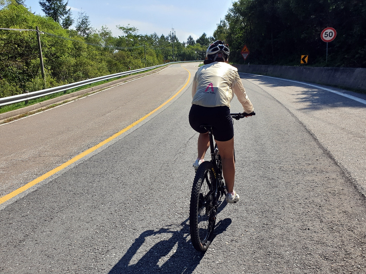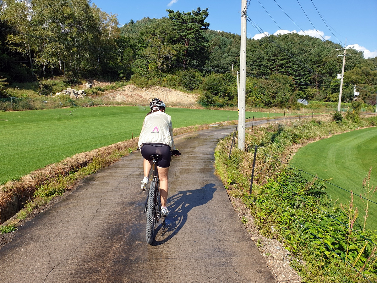 시멘트 포장길과 비포장길이 적절히 섞여있는 길인데 길이 조금 거칠고 물결이 파여 있어 로드바이크로 가기엔 안 좋은 길이지만 산악자전거로는 아주 쉬운 길이다.