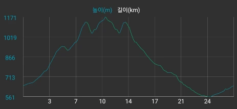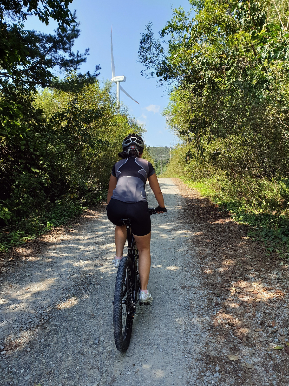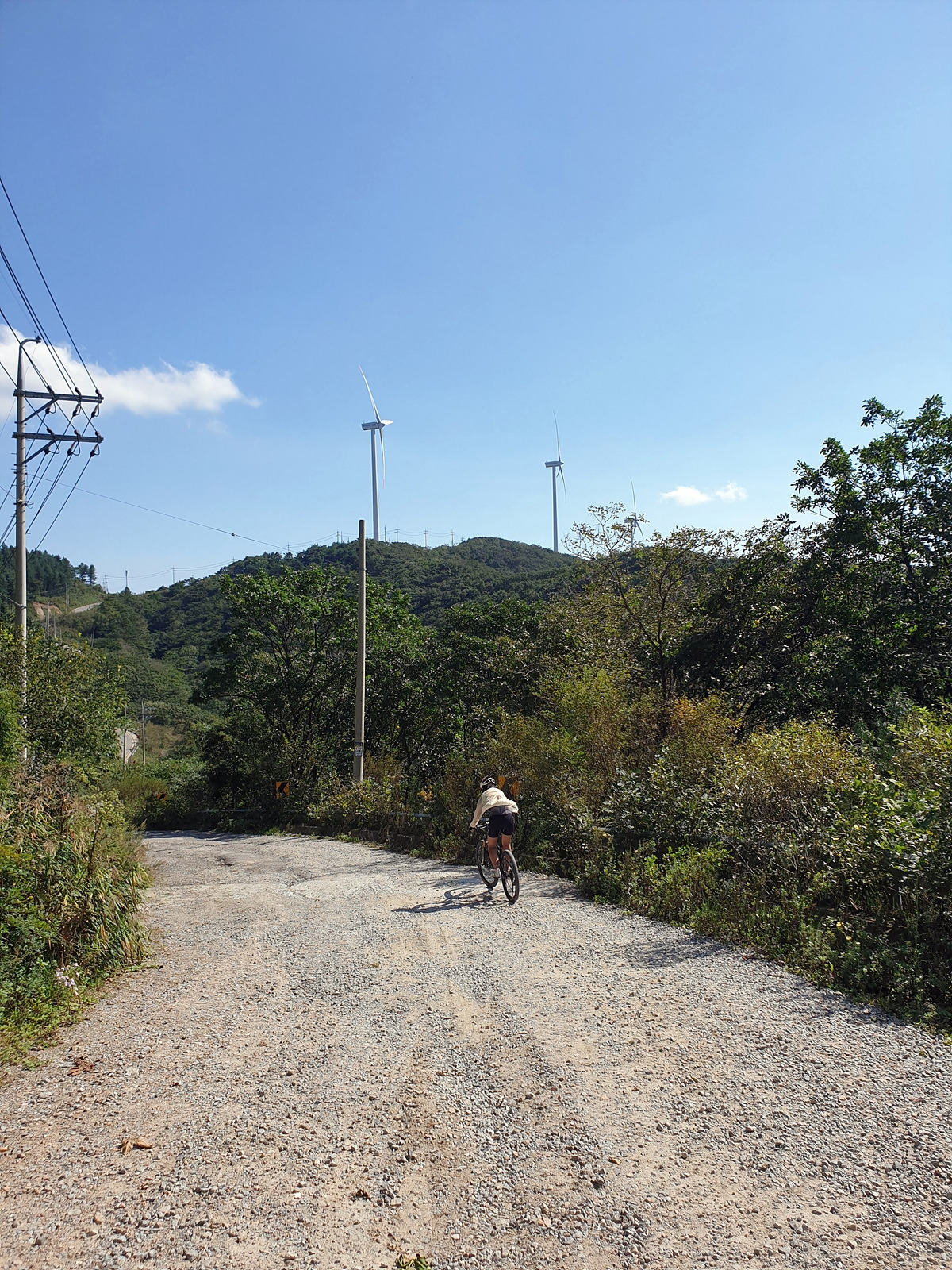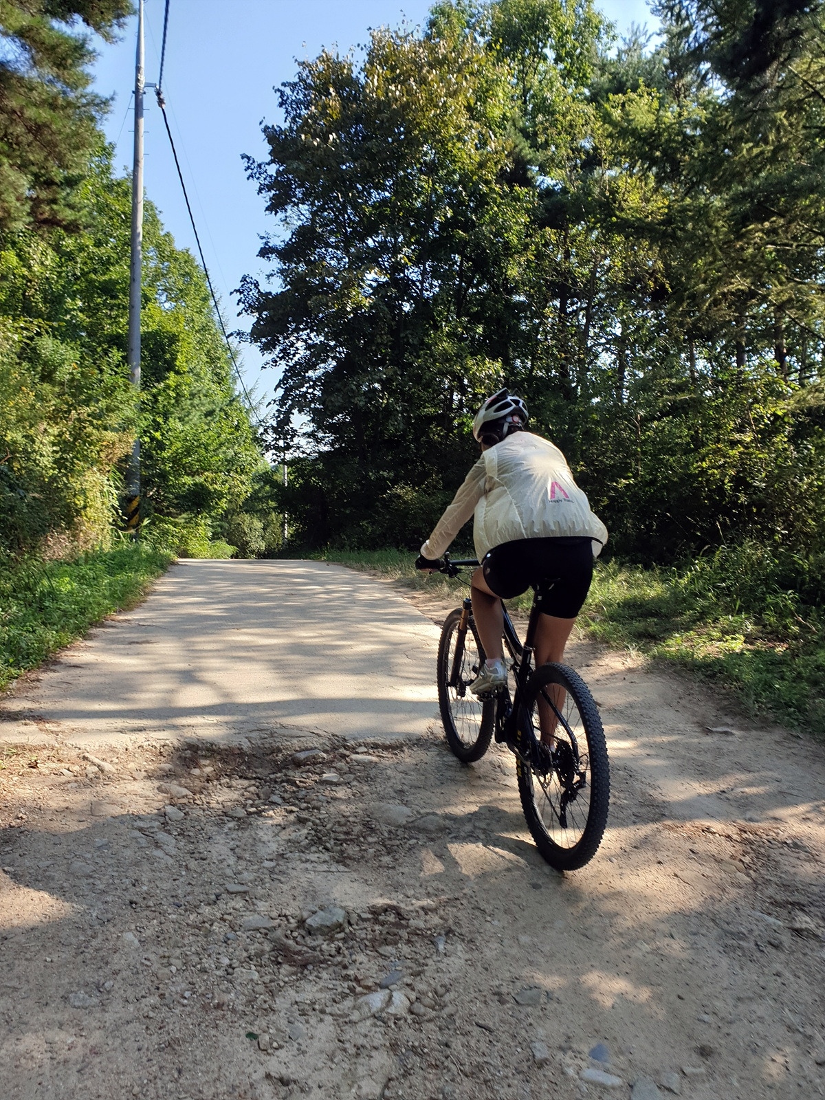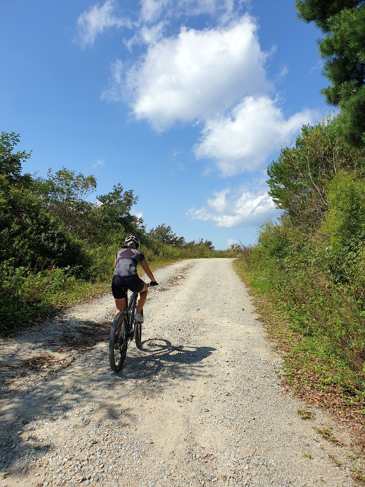 시멘트 포장길과 비포장길이 적절히 섞여있는 길인데 길이 조금 거칠고 물결이 파여 있어 로드바이크로 가기엔 안 좋은 길이지만 산악자전거로는 아주 쉬운 길이다.
