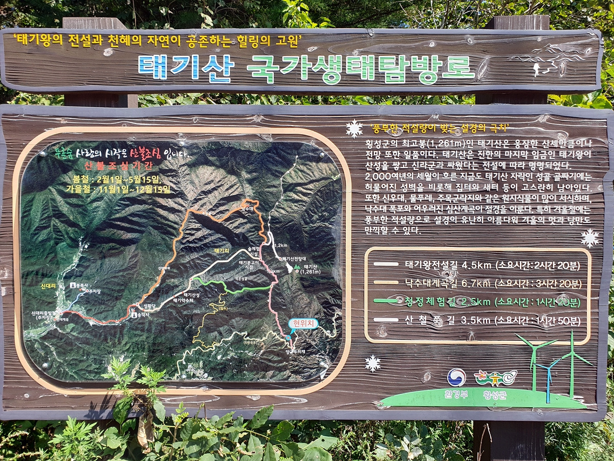 태기산 등산로 입구 표시가 있다. 등산객들이 등산로로 태기산 정상에 바로 갈 때 이용하는 길이다.