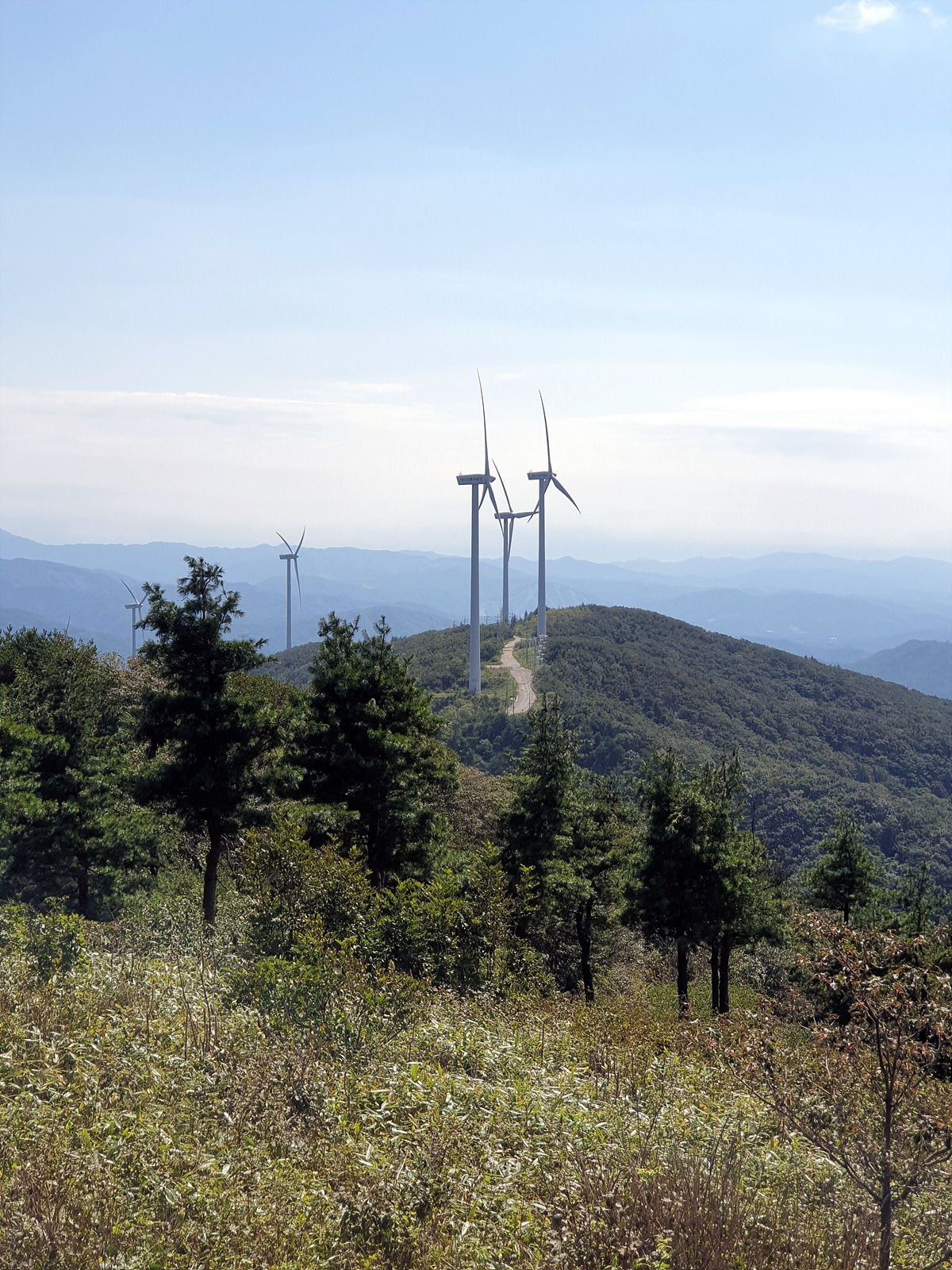 풍력발전 6호기에서 거의 정상에 올라온 듯한 느낌이 난다. 작은 풍력발전기들도 보인다.