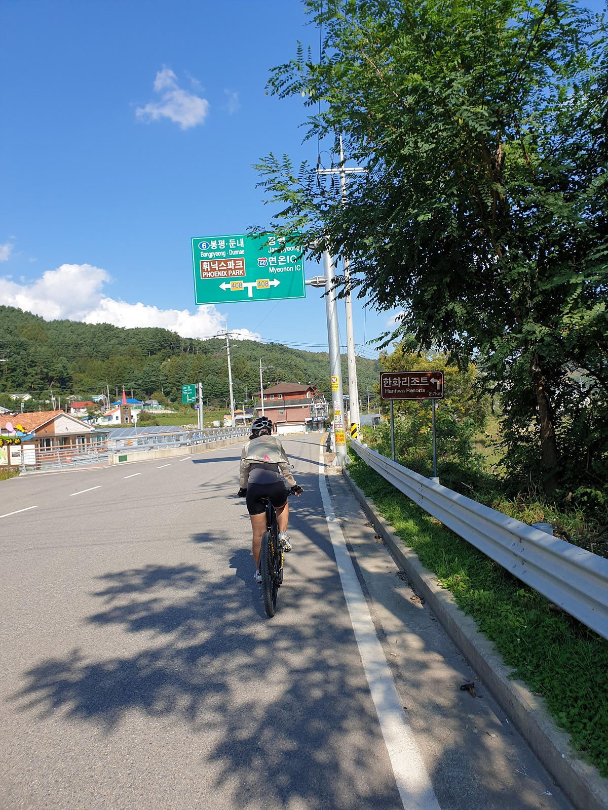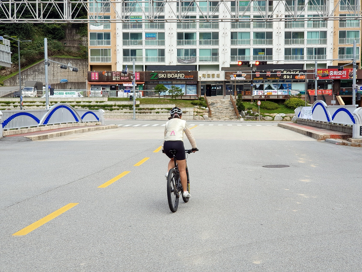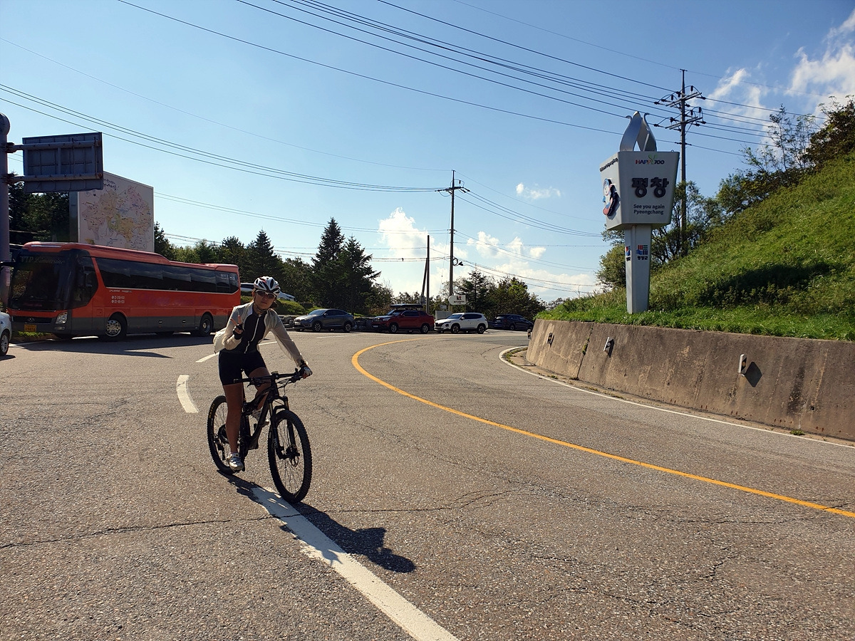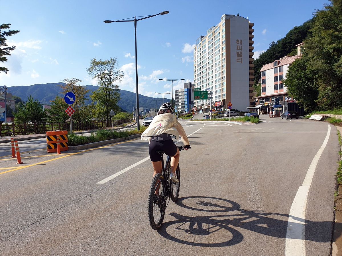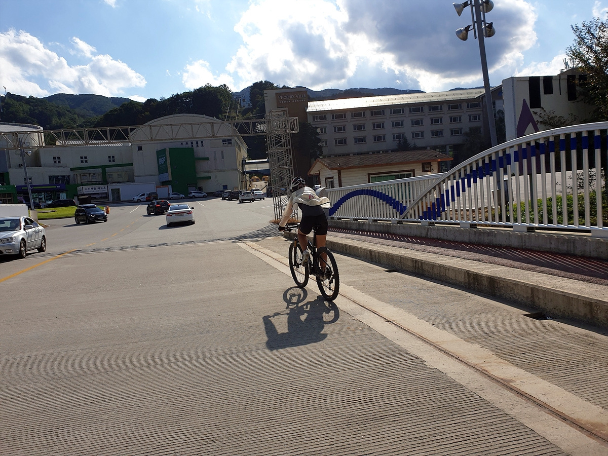 출발 준비하면서 보니 지니님의 자전거 앞바퀴에 펑크가 나있었다. 일반 펑크가 아닌 공기주입구 쪽의 찢김으로 인한 펑크라 튜브가 회생 불가능이다. 얼른 튜브를 교체하고 출발한다. 오늘 코스는 아주 쉽다 일단 휘닉스파크에서 출발해서 6번 국도 쪽으로 가면 된다.