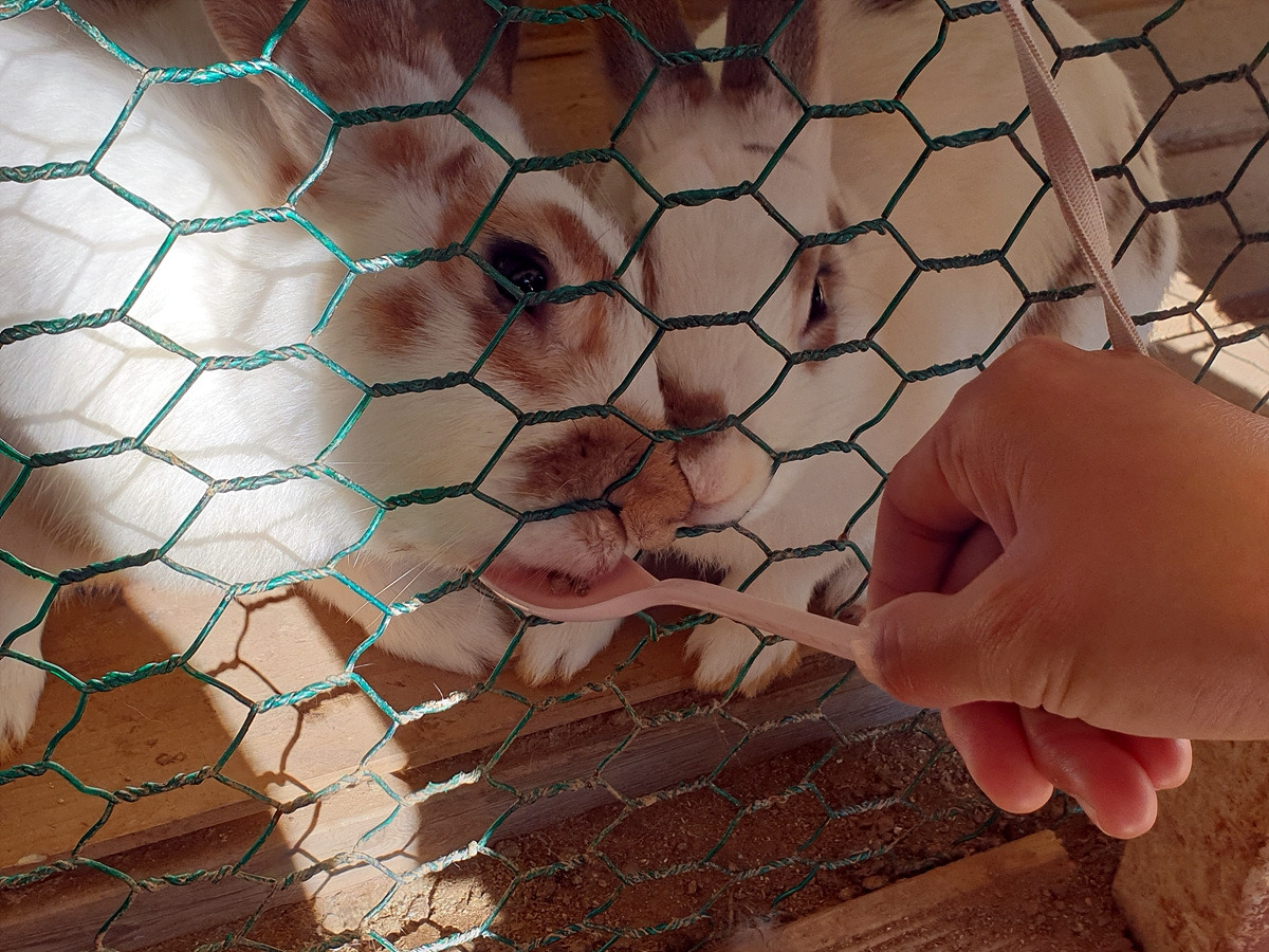 알파카와 달리 토끼는 앞니로 먹이 주는 손을 깨물 수 있어서 이렇게 스푼에 먹이를 담아서 줘야 한다. 스푼에도 깨문 자국이 있는 것을 보니 손으로 주면 내 손이 이 스푼처럼 될 것 같다.