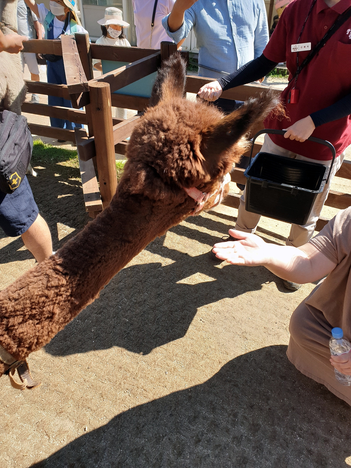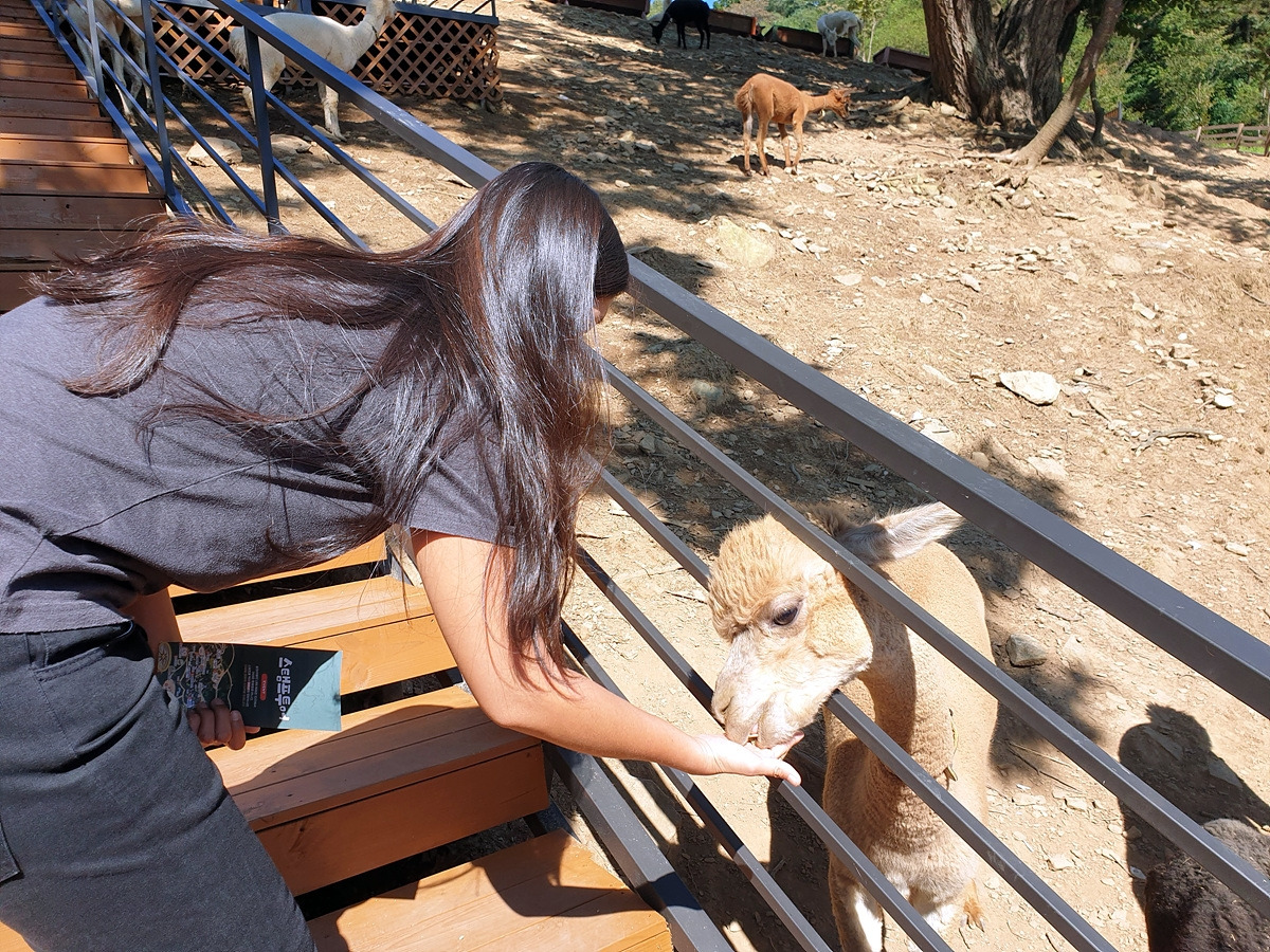 직원이 와서 먹이를 준다. 초식동물에게 먹이는 펠렛 같은 것인데 근처 자판기에 천 원을 넣으면 살 수 있다. 일반적인 대형 초식동물들은 경계심이 많고 사람을 잘 따르지 않는데 알파카는 사람에 대한 경계심은 많이 없지만 처음 본 사람에게 관심이 없다. 오로지 먹이에만 관심이 있으니 사료 펠렛이 있어야 가까이에 온다.