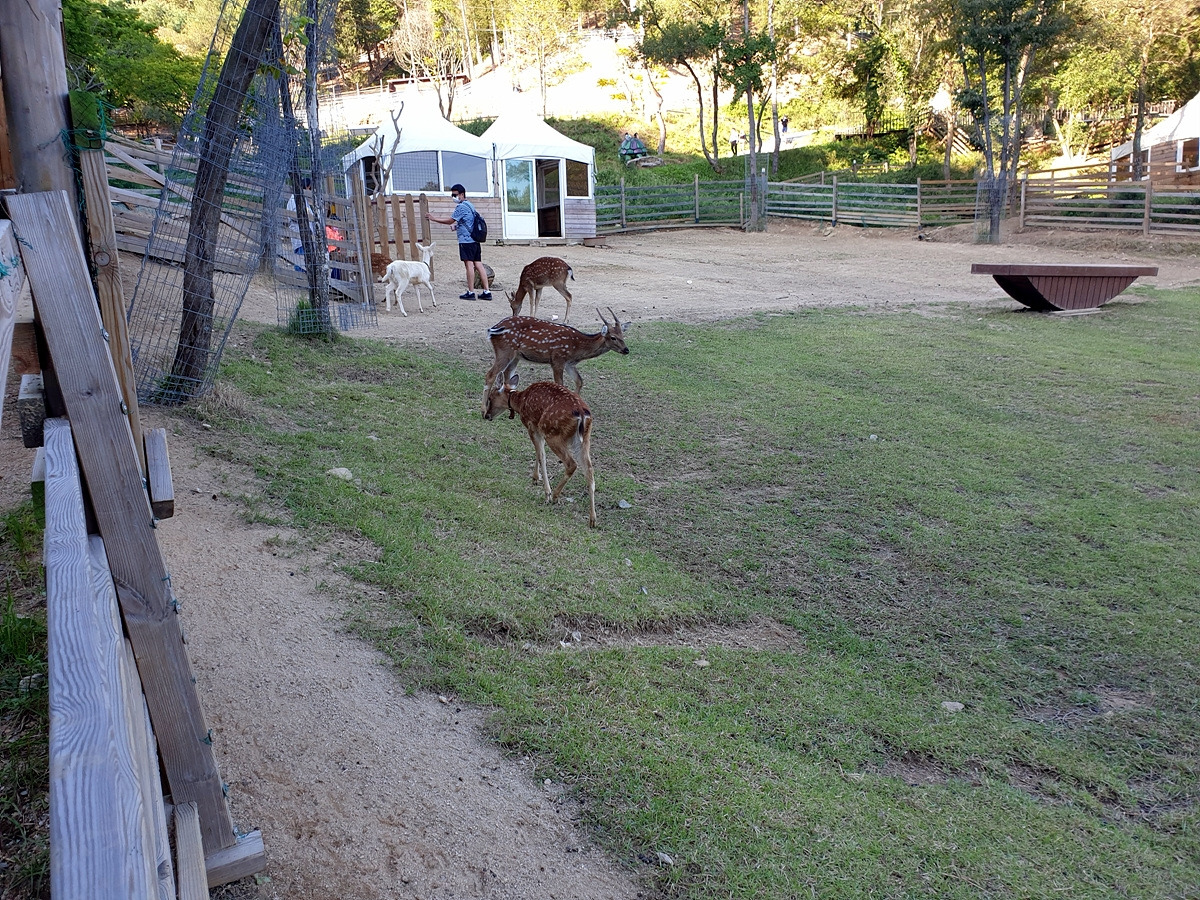 그런데 들어가면... 사슴들이 사료가 담긴 종이컵만 보면 따라다닌다. 일본에는 공원에서 전병만 먹으러 다니는 사슴들이 있다더니 여긴 사료 펠렛을 쫓아다닌다.