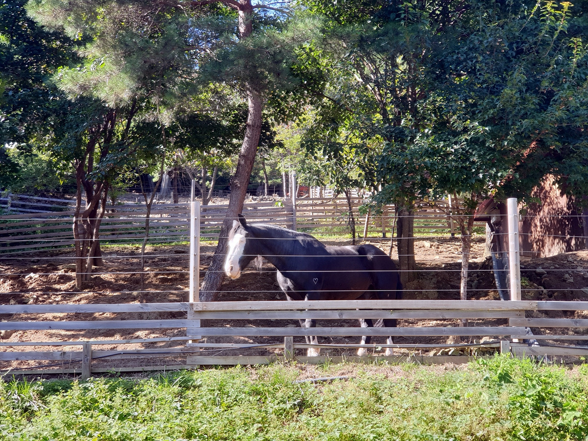 이것저것 구경하다보니 번호대로 가지 않고 사슴 목장 쪽으로 와버렸다. 먼저 샤이어 말이 보인다. 영국 품종의 짐말로 말치고는 덩치가 아담한 편이다. 파리가 자주 붙는 쪽 에 하트 모양을 그려놨는데 정말 박진감 있게 근육이 움직인다.